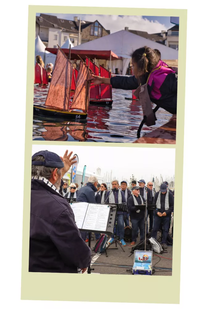 L’après-midi prend une dimension presque poétique avec l’atelier maquettes organisé par l’association des Vieilles Voiles de Rhuys. Autour du bassin, les bateaux miniatures glissent doucement sur l’eau, rappelant les silhouettes élégantes des grands voiliers traditionnels. Mes petits-enfants ont les yeux brillants, captivés par ce spectacle.