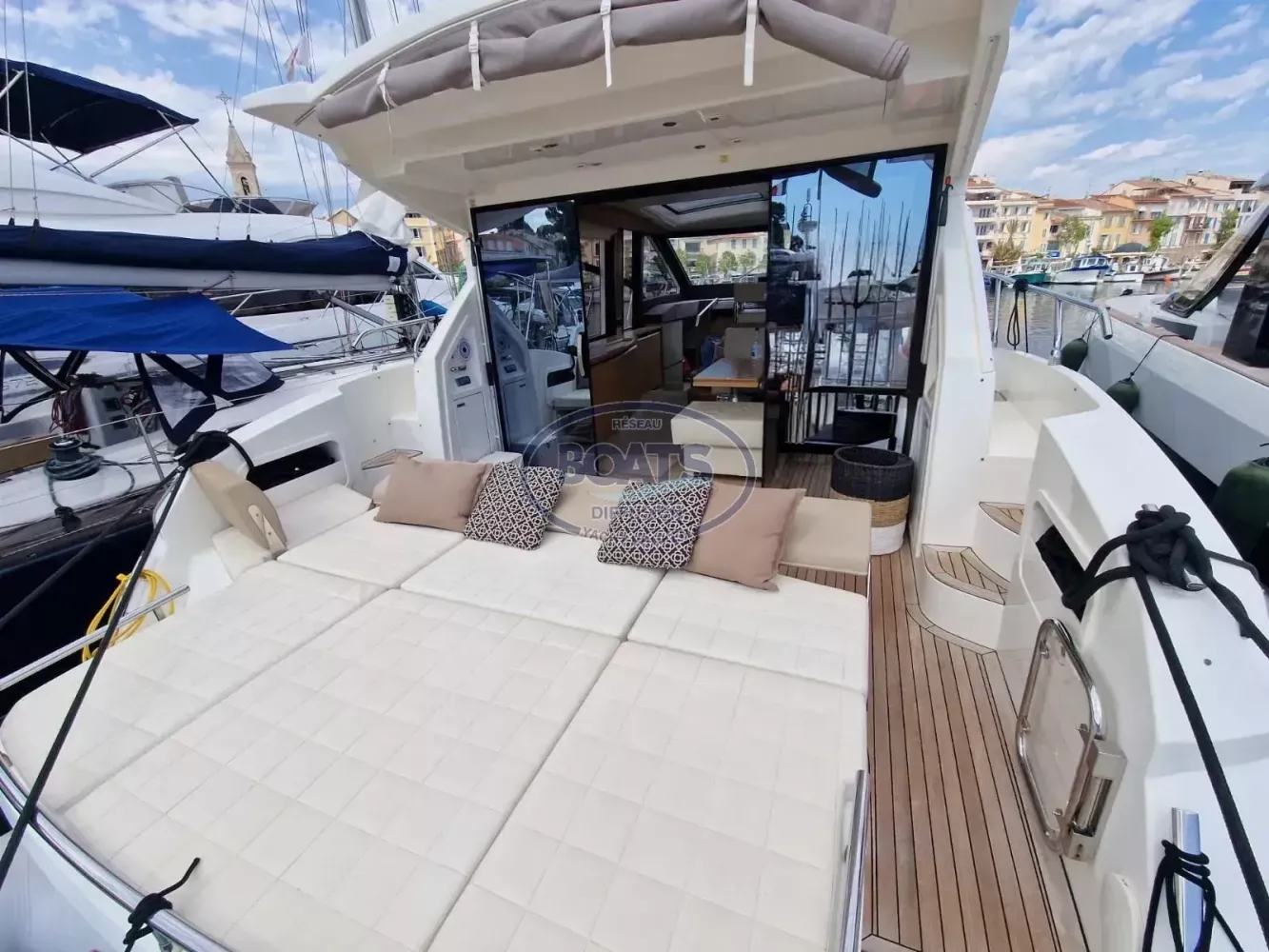 Bain de soleil arrière : Parfaitement intégré, surplombant la plateforme de bain (idéale pour la mise à l'eau de l'annexe ou les baignades). Selleries extérieures et intérieures protégées et traitées.