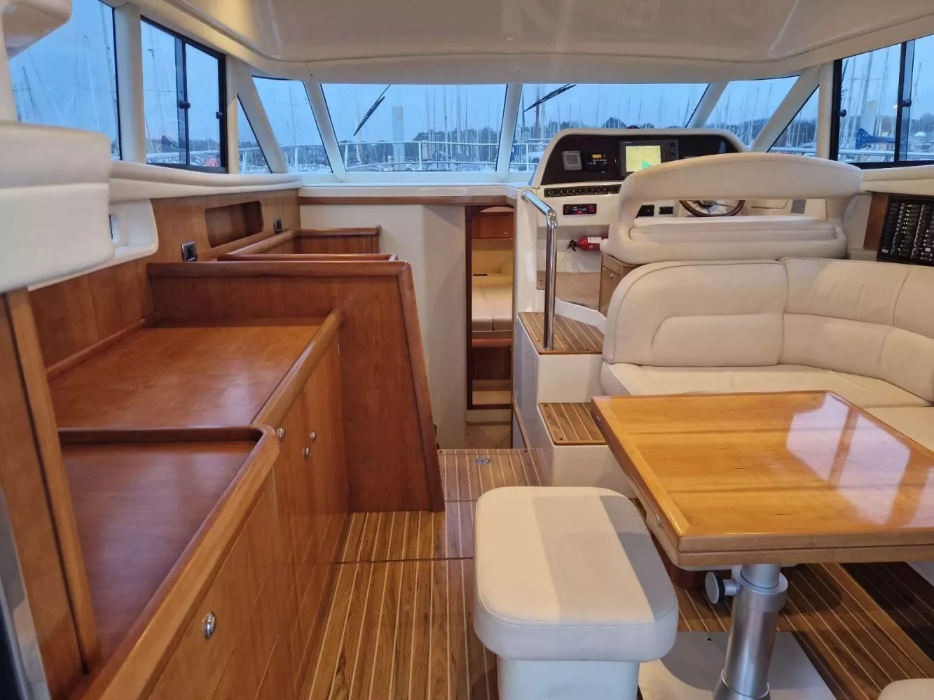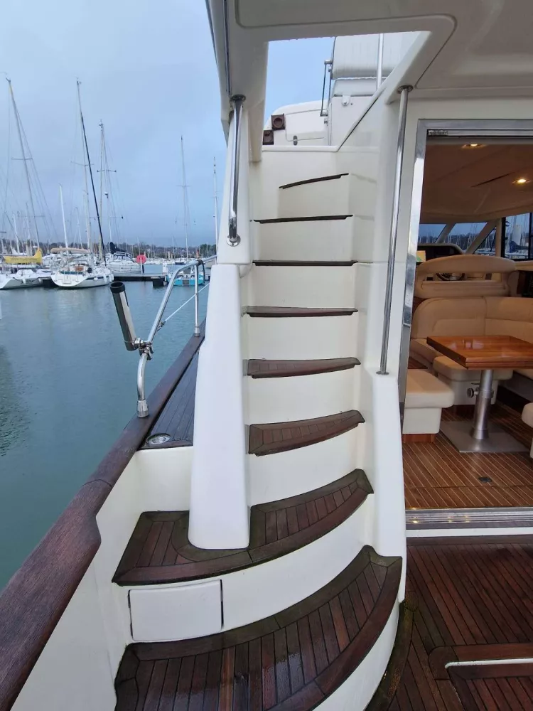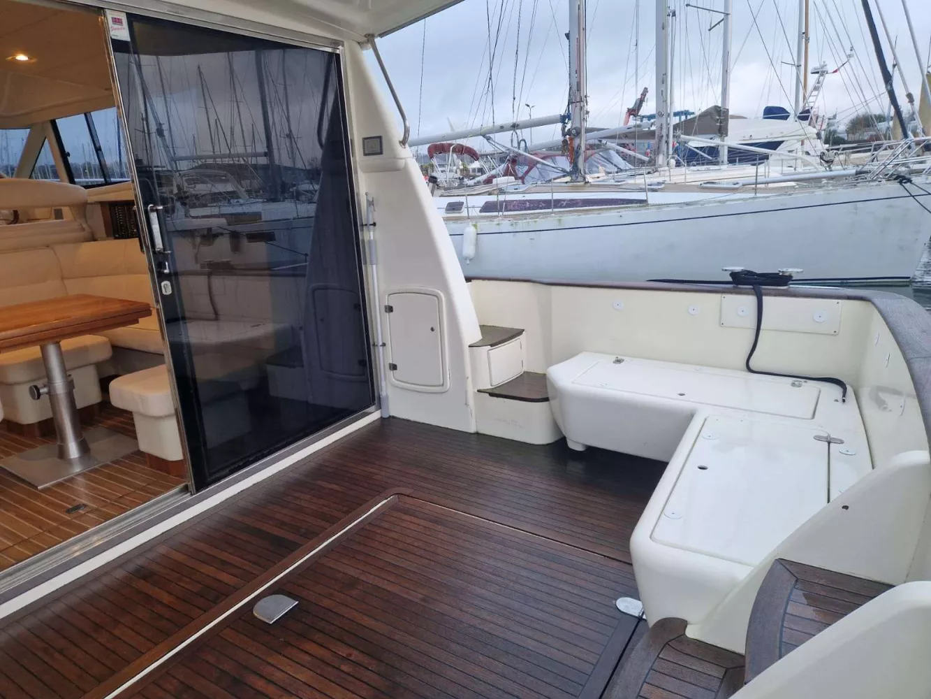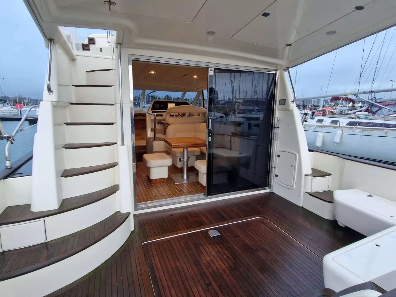 Cockpit arrière, passavant, pont avant, plateforme arrière et fly bridge lattés teck naturel.