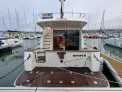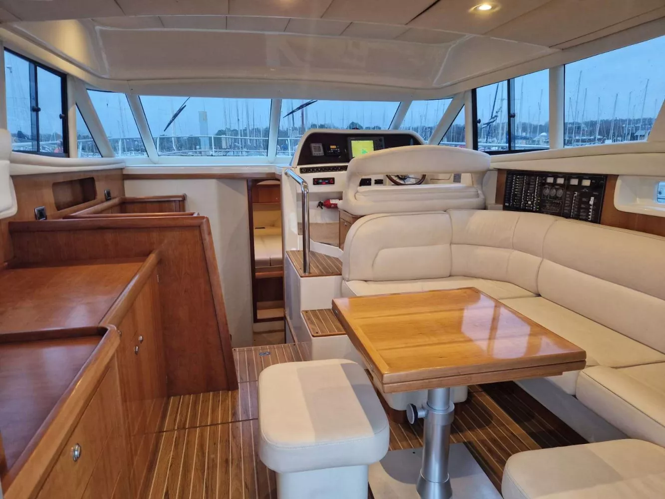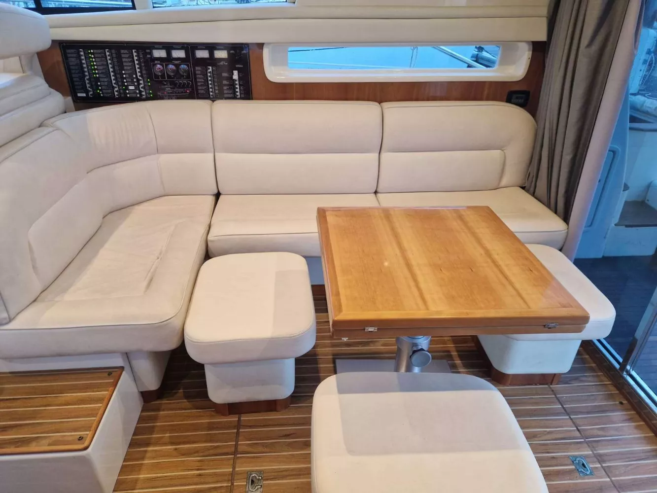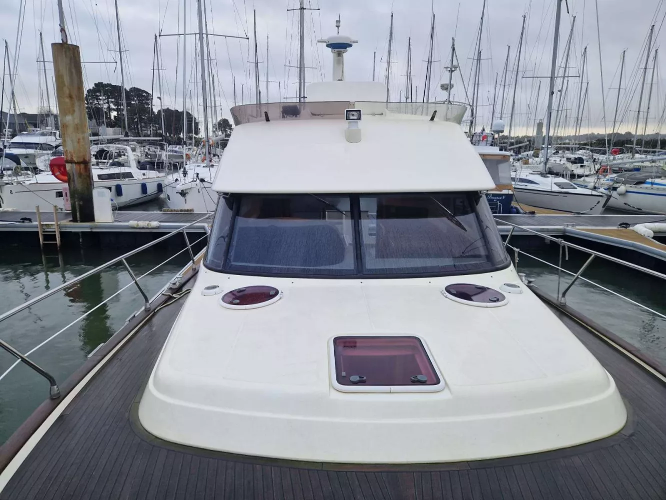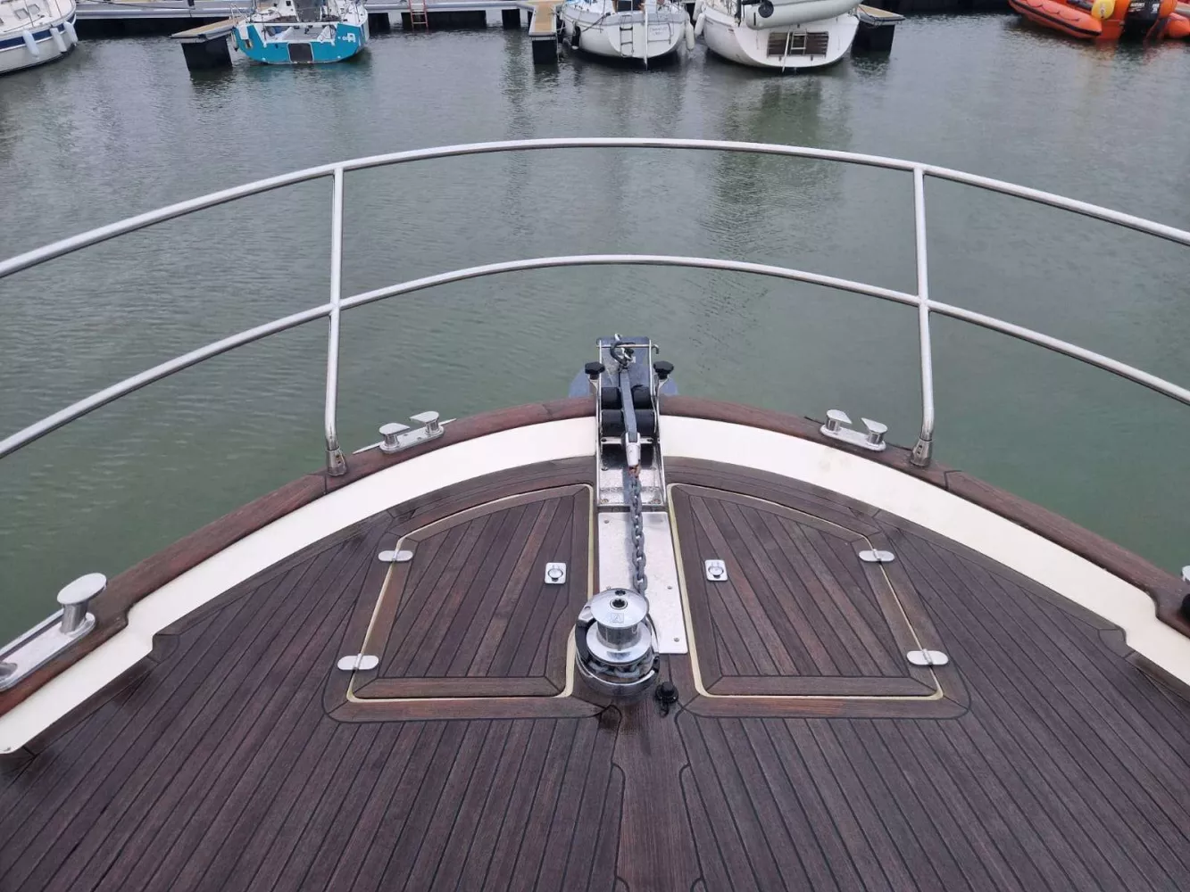 Cockpit arrière, passavant, pont avant, plateforme arrière et fly bridge lattés teck naturel.