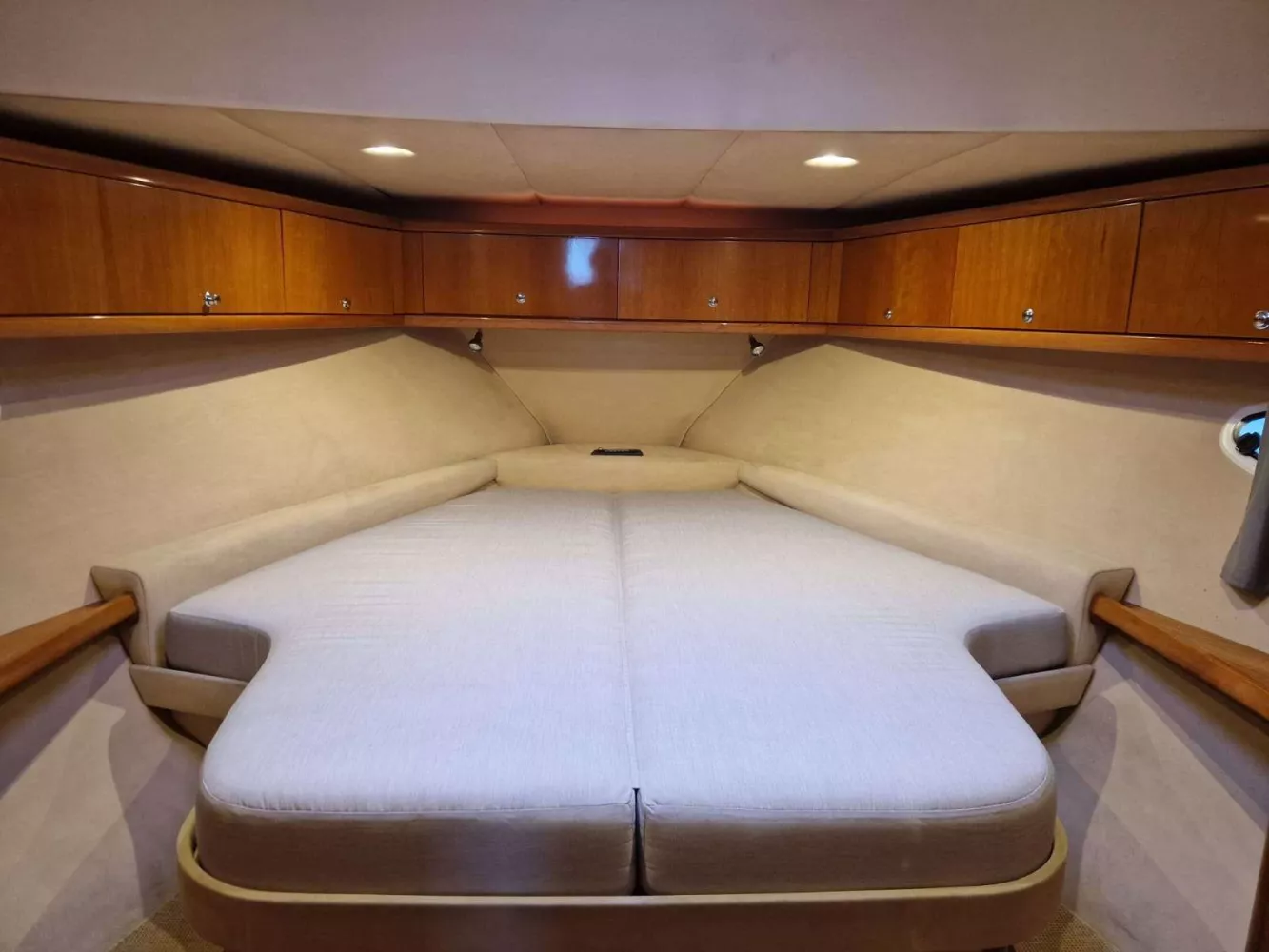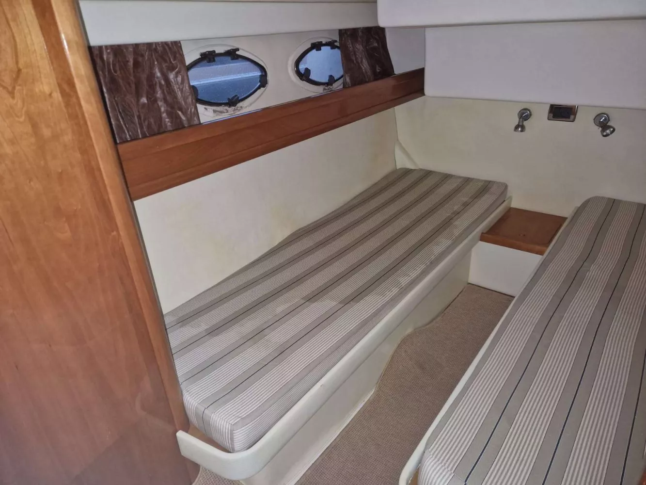 Version 2 cabines 1 SDB avec cabine propriétaire à l’avant et cabine 2 lits simples sur tribord et 2 salles de bain avec douche et WC électriques.