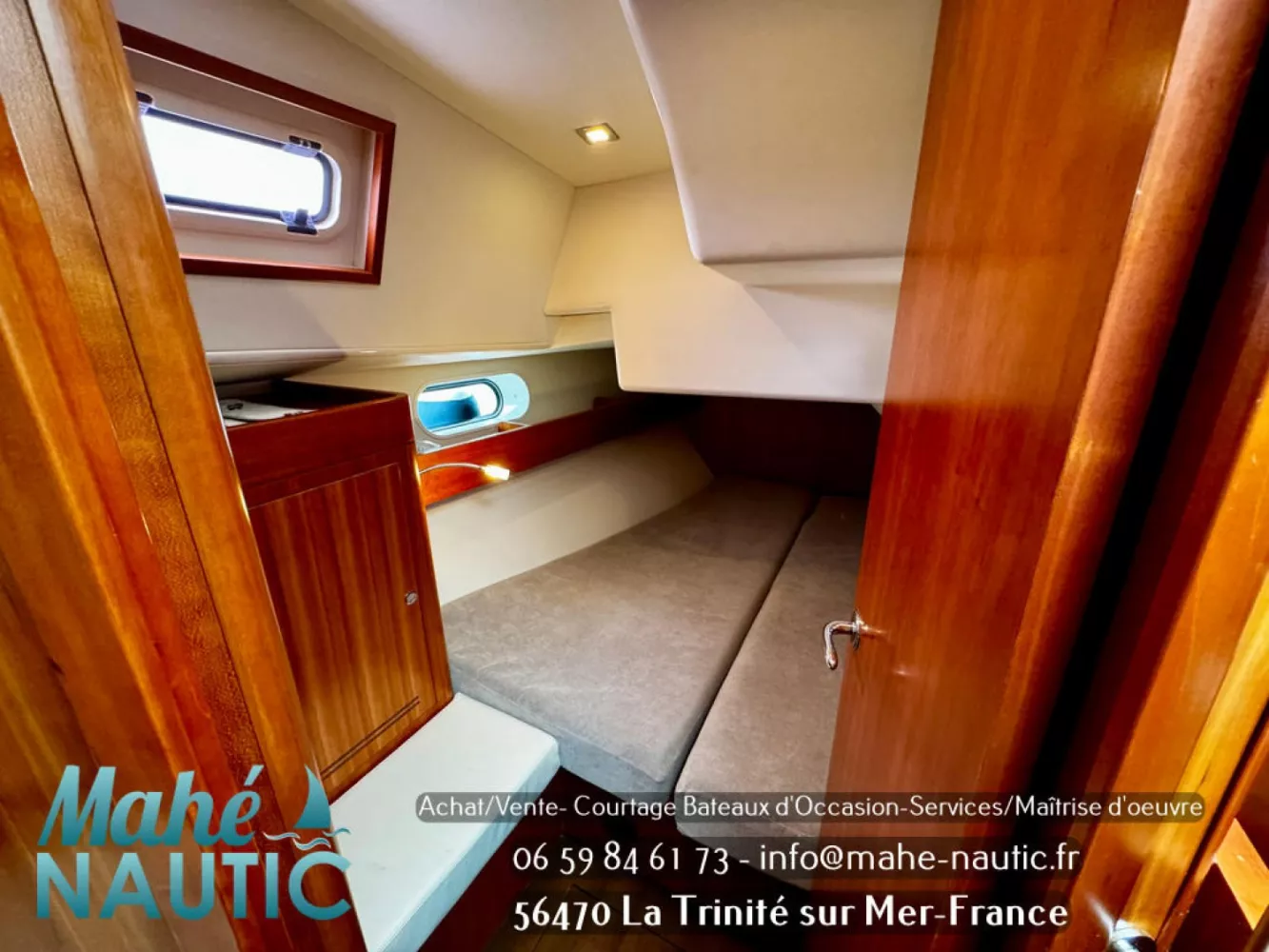 Cabine avant très grand lit avec 2 penderies, 1 cabine double à l'arrière, 1 local technique faisant cabine double, carré avec table transformable en lit, ce qui donne 8 couchages possibles.