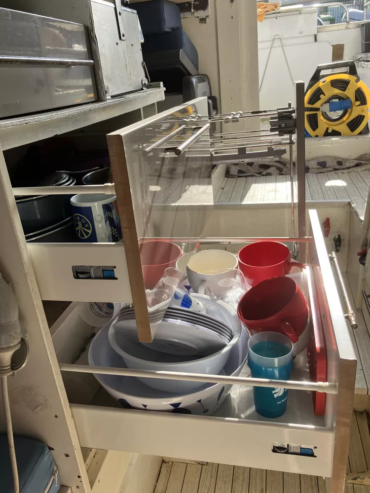 douche ext, WC, frigo, chauffage, TV, coffre de toit, cagnard de cockpit, taud complet arrière