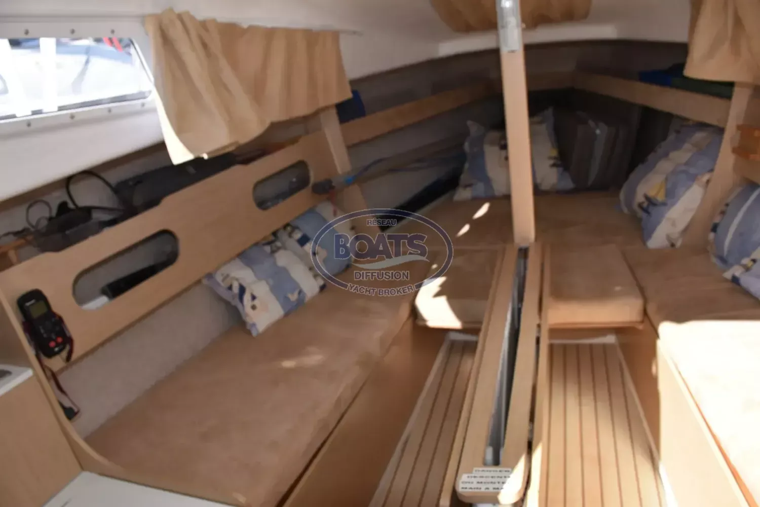 Intérieur : Plancher et planchette en stratifié érable (remplace moquette), coussins déhoussables, rideaux, rangements en bambou.