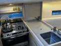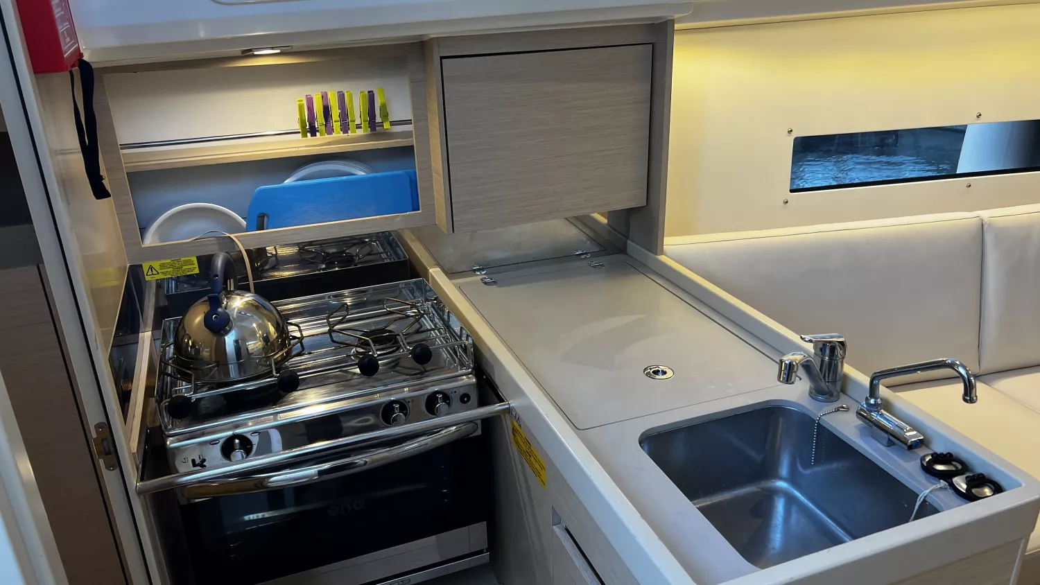 Finition Confort : plateforme arrière latte teck, table de cockpit polyester, moustiquaires sur hublots et panneaux, cuisine équipée (réchaud/four inox 2 feux, glacière avec unité frigorifique 12V), Hifi Fusion + haut-parleurs int/ext, circuit 230V complet, prises USB, chargeur de batterie, batterie 80 Ah supplémentaire, éclairage LED, nombreux rangements.