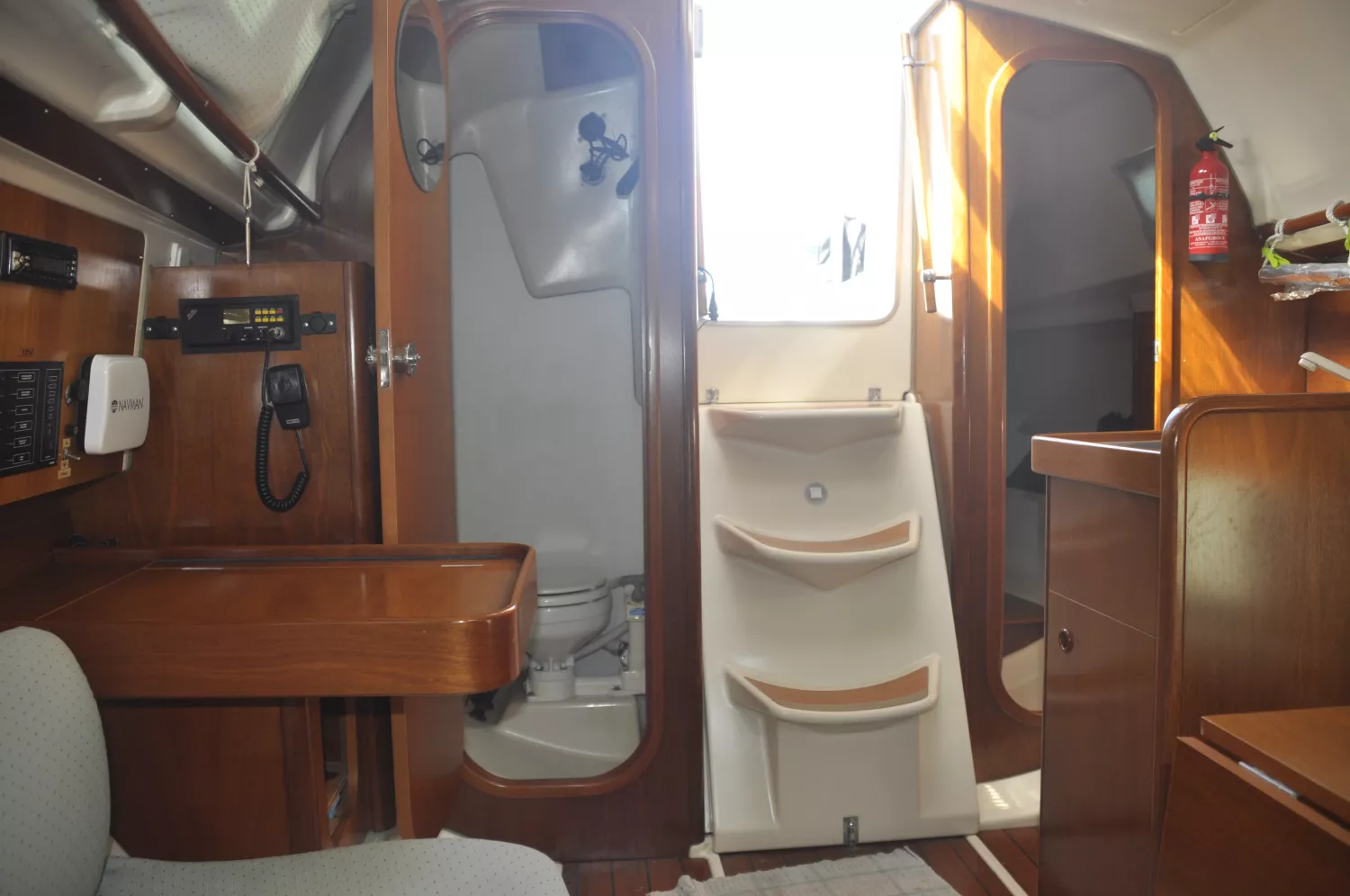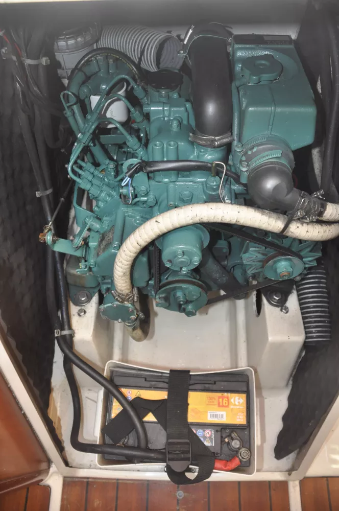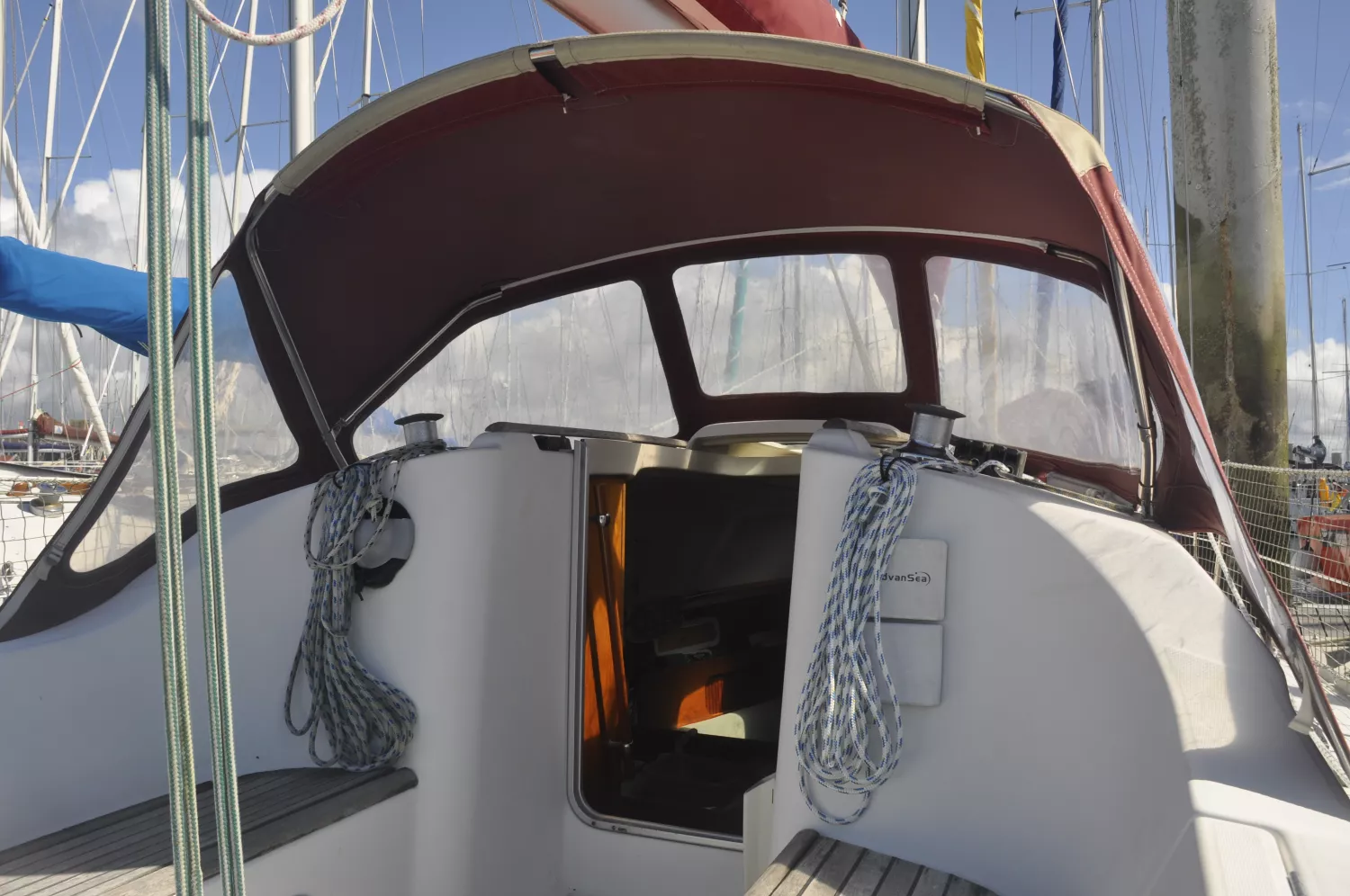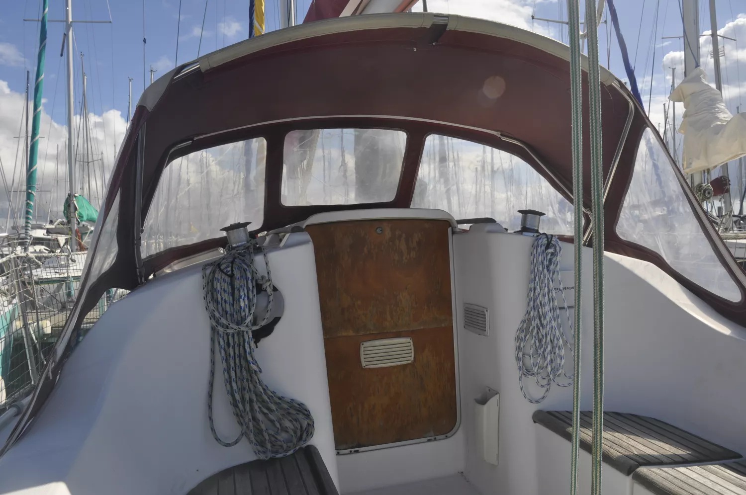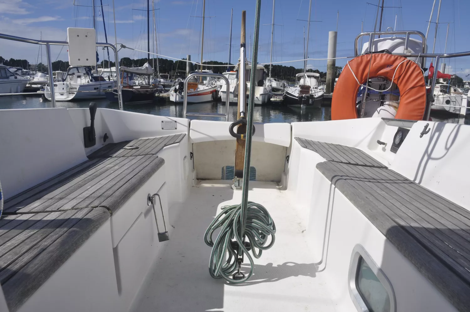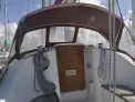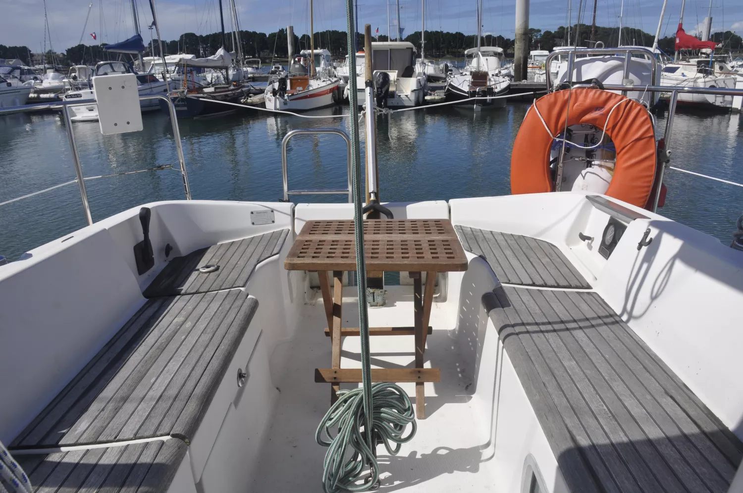 Extérieur : grande voile lattée avec lazy jacks et housse, génois sur enrouleur avec tambour sur le pont et bande UV, voilure en bon état. Capote de descente solide et résistante. Démarrage et arrêt du moteur au cockpit, réservoir de 30l, 2 batteries, hélice tripale. Barre franche. Descente à l’eau avec assise et échelle de bain.