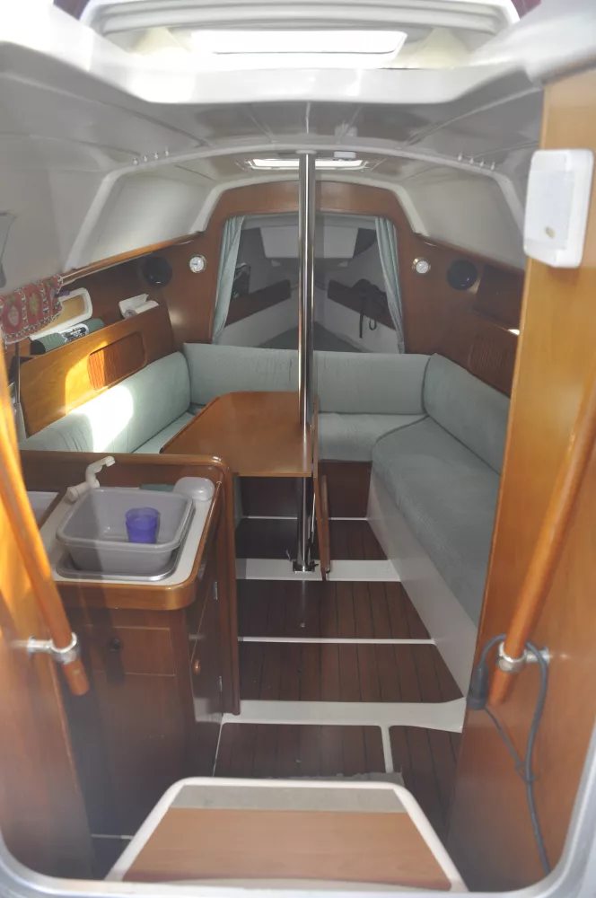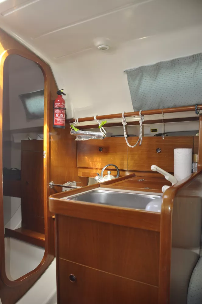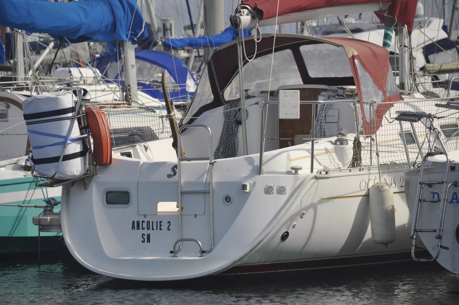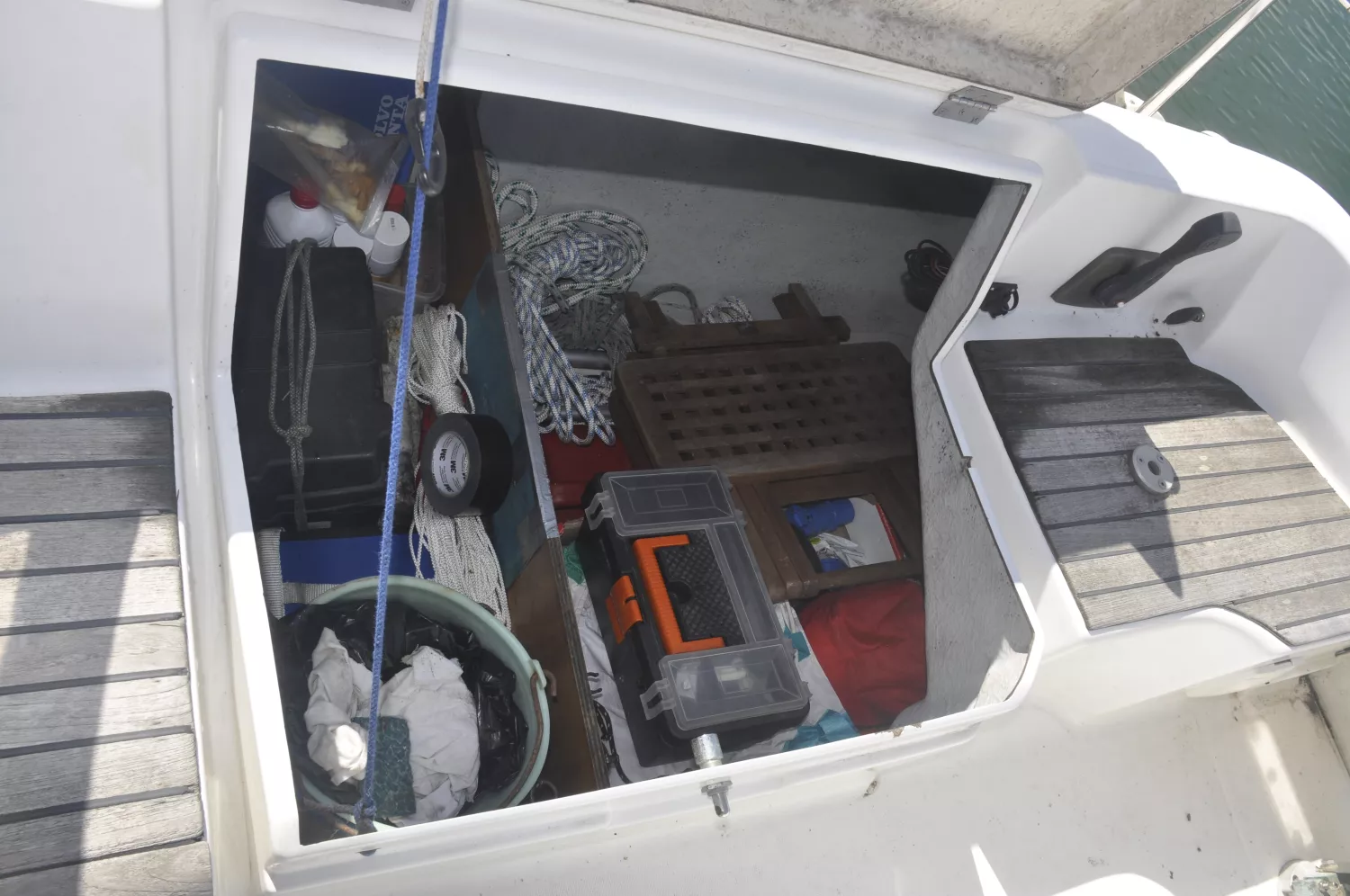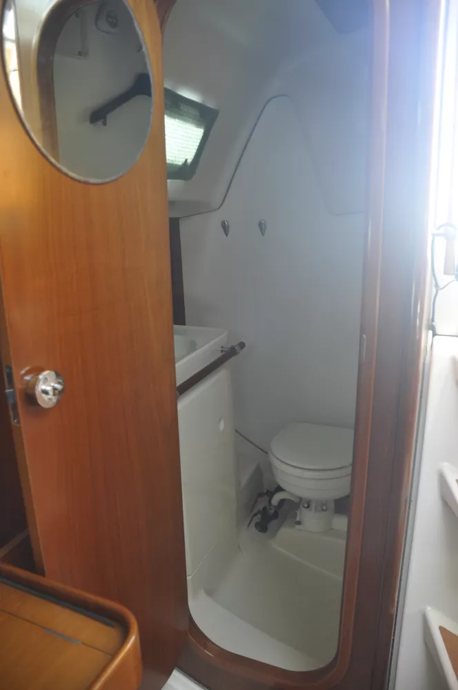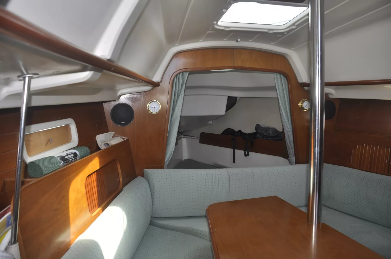 Extérieur : grande voile lattée avec lazy jacks et housse, génois sur enrouleur avec tambour sur le pont et bande UV, voilure en bon état. Capote de descente solide et résistante. Démarrage et arrêt du moteur au cockpit, réservoir de 30l, 2 batteries, hélice tripale. Barre franche. Descente à l’eau avec assise et échelle de bain.
