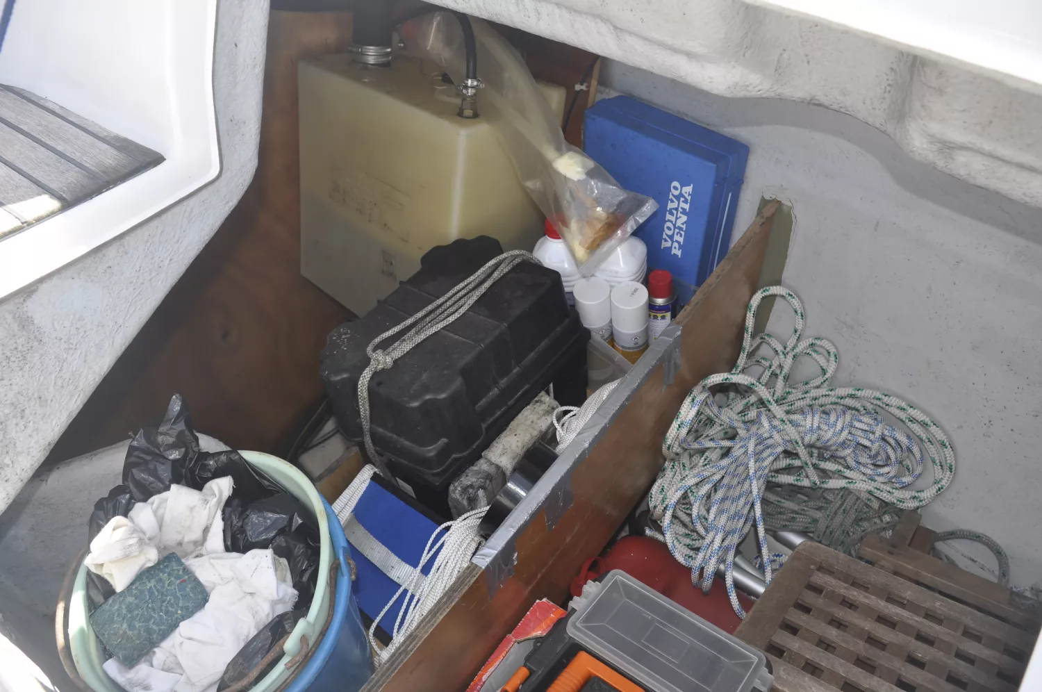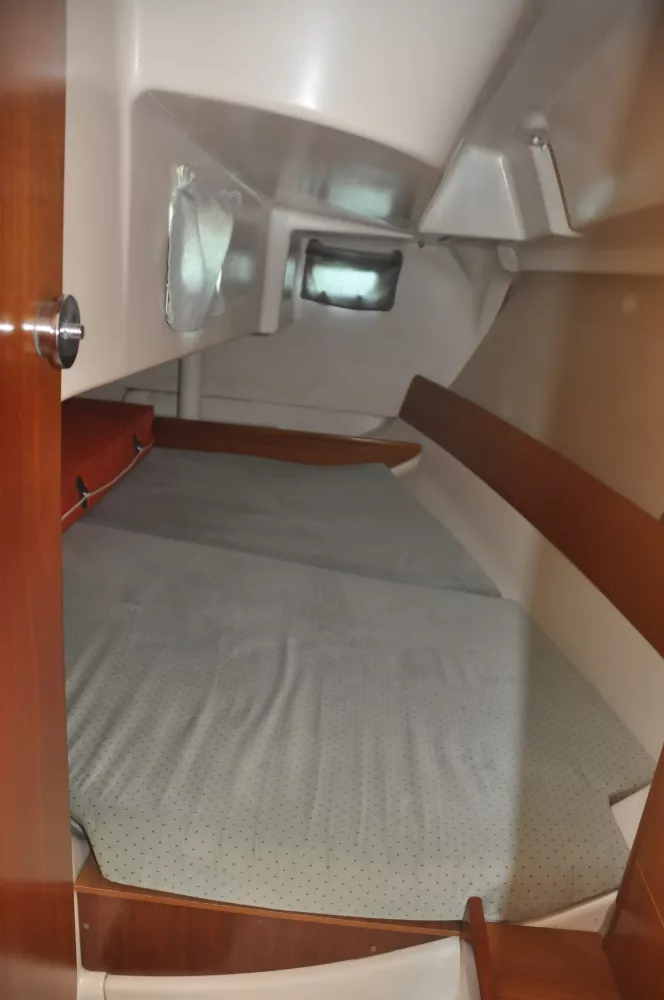Cabine avant, fermeture rideau. Réservoir d’eau douce.