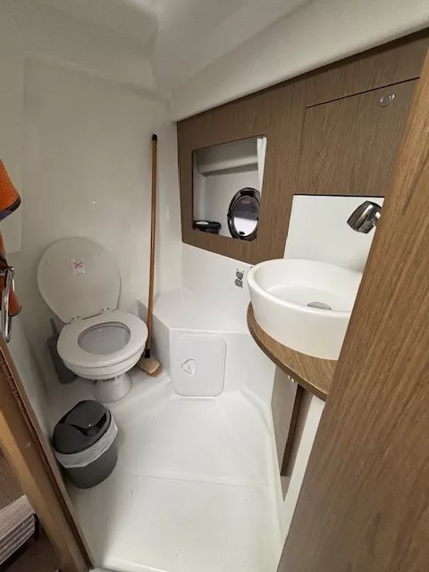 2 frigos (60l) ,réchaud 2 gaz, 2 éviers dont 1 à l'extérieur, eau chaude sous pression, sdb avec WC marin électrique et douche, douchette de pont (eau chaude/eau froide) toit ouvrant électrique,
