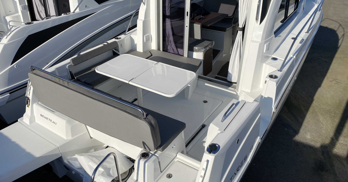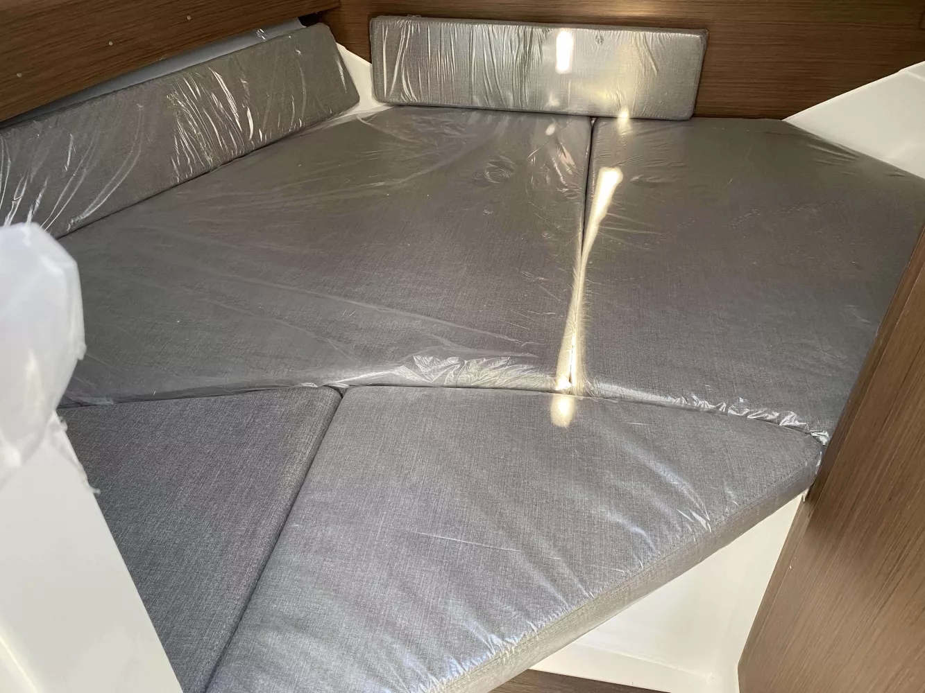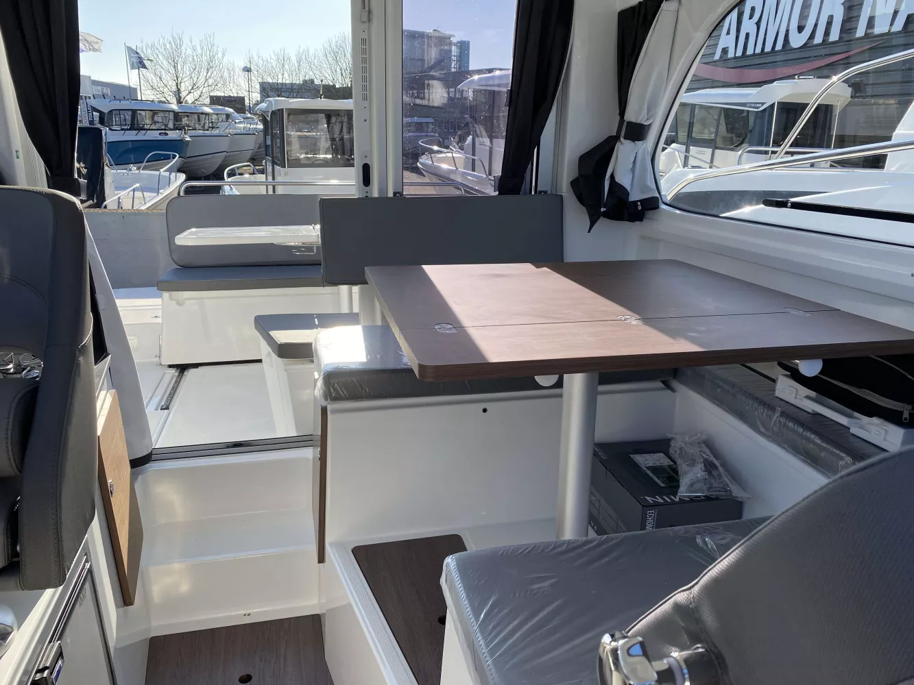 version sellerie élégance cruising, finition confort, Ecran multifonctions GARMIN ECHOMAP UHD 92sv, cartographie garmin pour GPS, guindeau éléctrique, banquette de cockpit latérale repriable sellerie élégance, banquette dos à la baie vitrée, plate-forme de bain polyester, table de cockpit Polyester repliable, propulseur d'étrave, circuit éléctrique 220 V, chauffe-eau, cuisine luxe avec réchaud Gaz, réfrigirateur 42 litres, complément de couchage, WC marin avec réserve d'eau noires, pré-rigging suzuki, coque blanche, panneau de timonerie coulissant avec rideaux occultants, système Trim auto Zipwake.