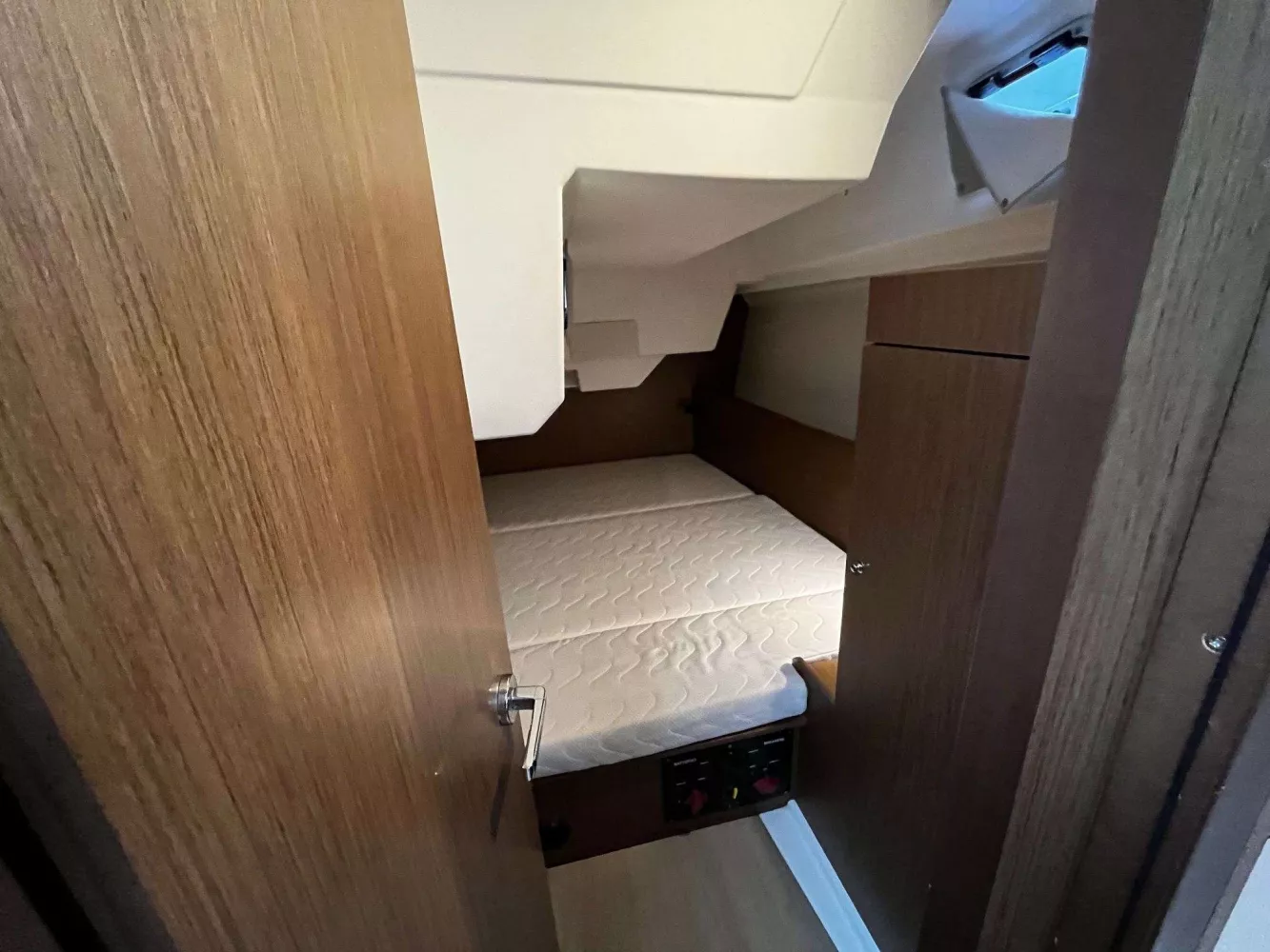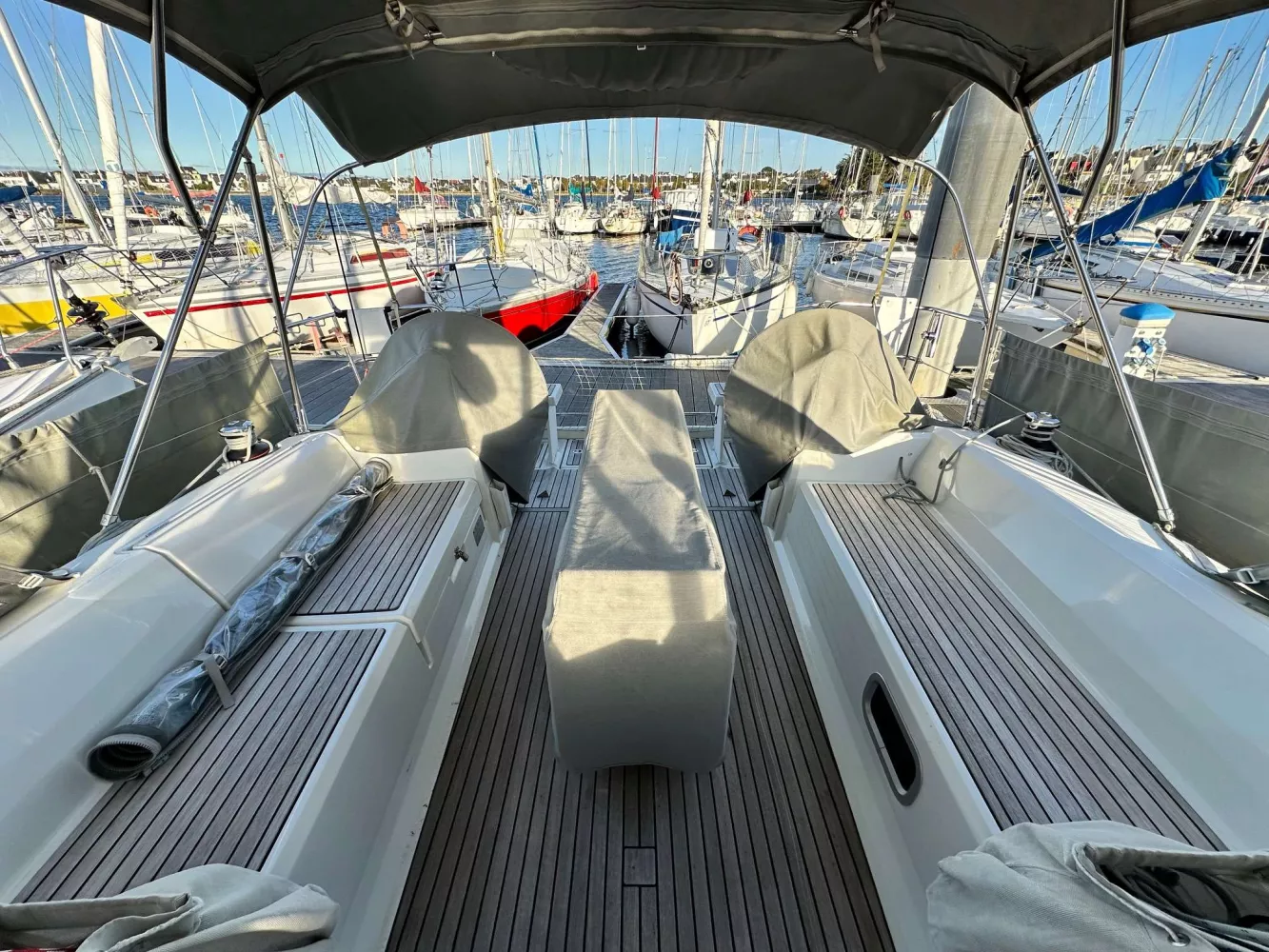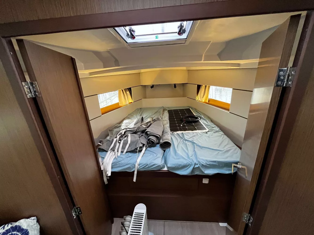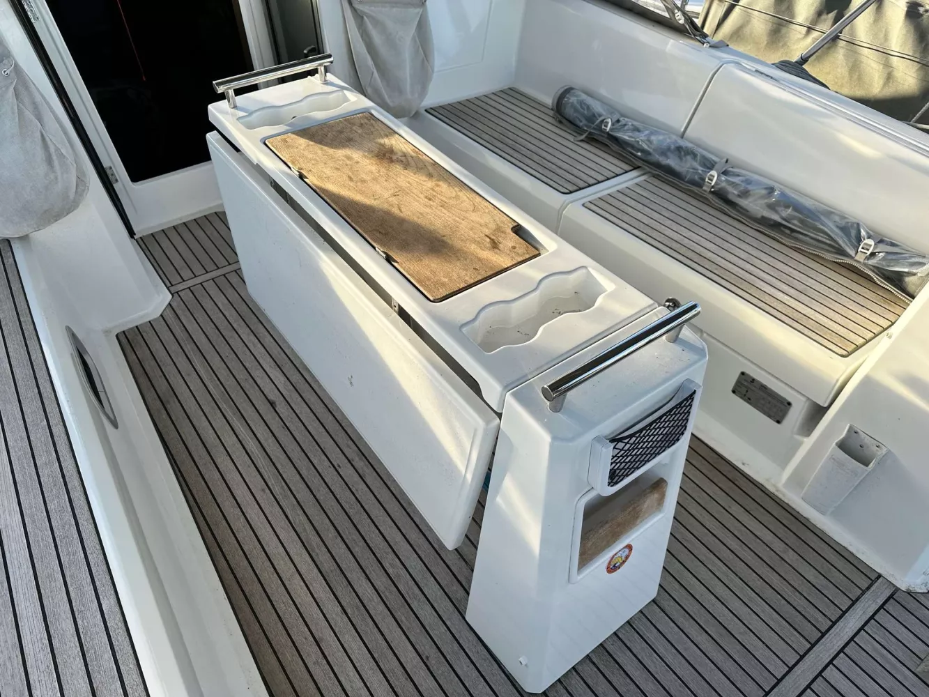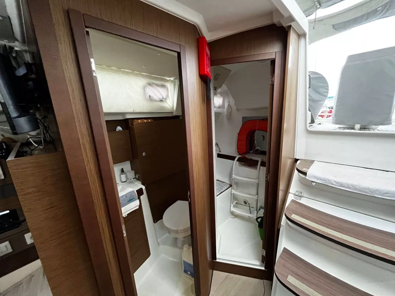 Version 2 cabines - Cuisine en L et salle de douche séparée arrière tribord, Finition Confort, Pack coastal et offshore BandG, Plus value Voiles Mylar DCX, Mât enrouleur, Code 0 sur emmagasineur, Fermeture arrière complète et capote de descente, réglage au cockpit des chariots de génois, Winch