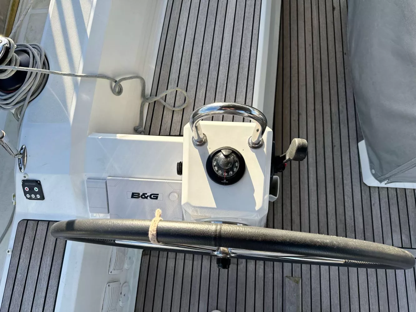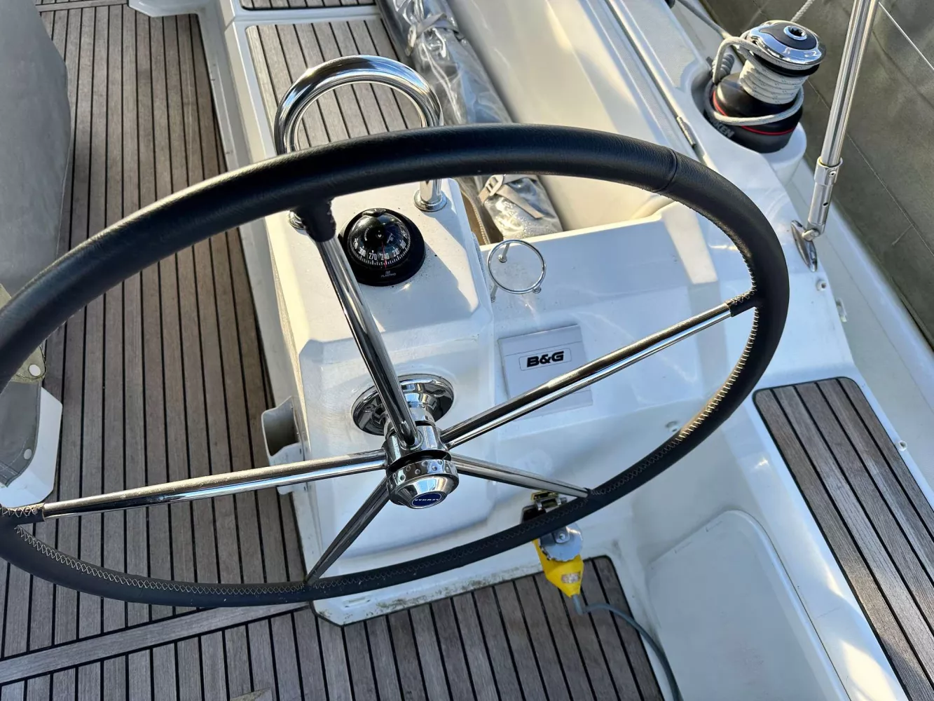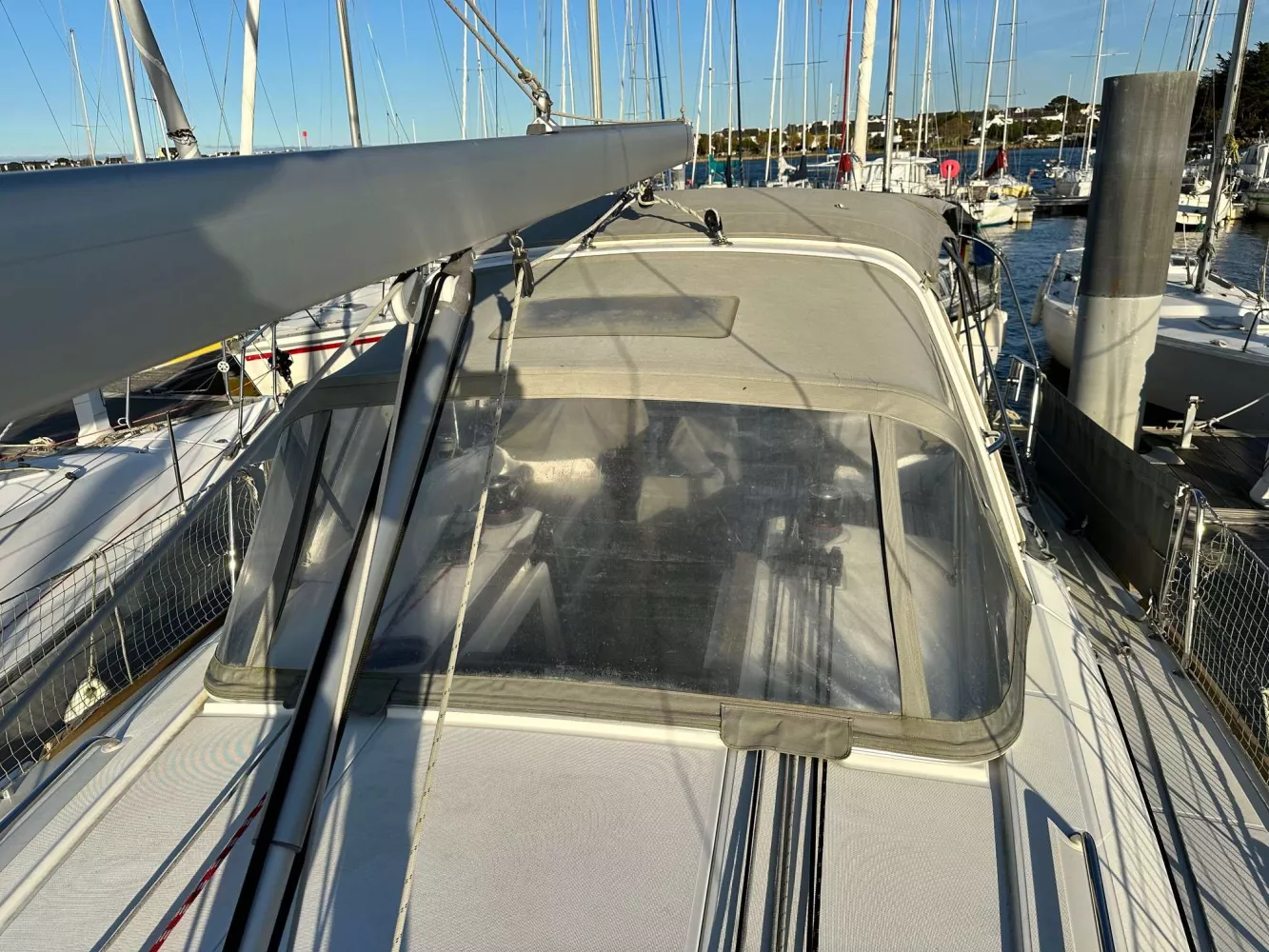 manoeuvre tribord manuel, Arceau de GV, table cockpit luxe-polyester, Propulseur d'étrave, prise eau douce de quai, réserve eau suppl 200L, Chauffage air pulsé, marches descente en bois, sommier à latte cabine avant, WC électrique, hélice tripales repliables, Radar et AIS 500, Pilote auto, fond de cockpit latté bois massif, projecteur de pont, Antenne TV et TV, armement semi-hauturier et radeau de survie, Kit mouillage complet.