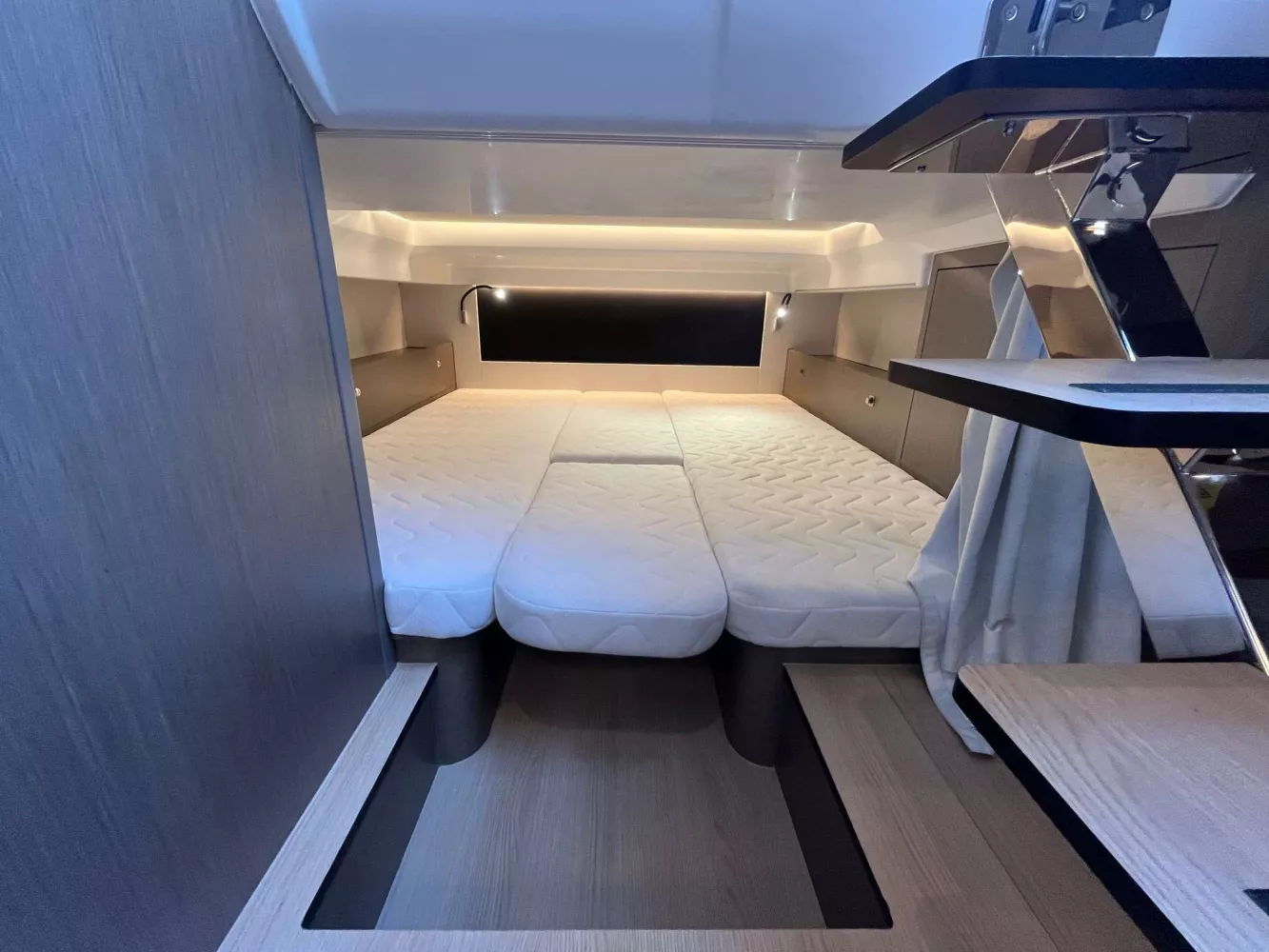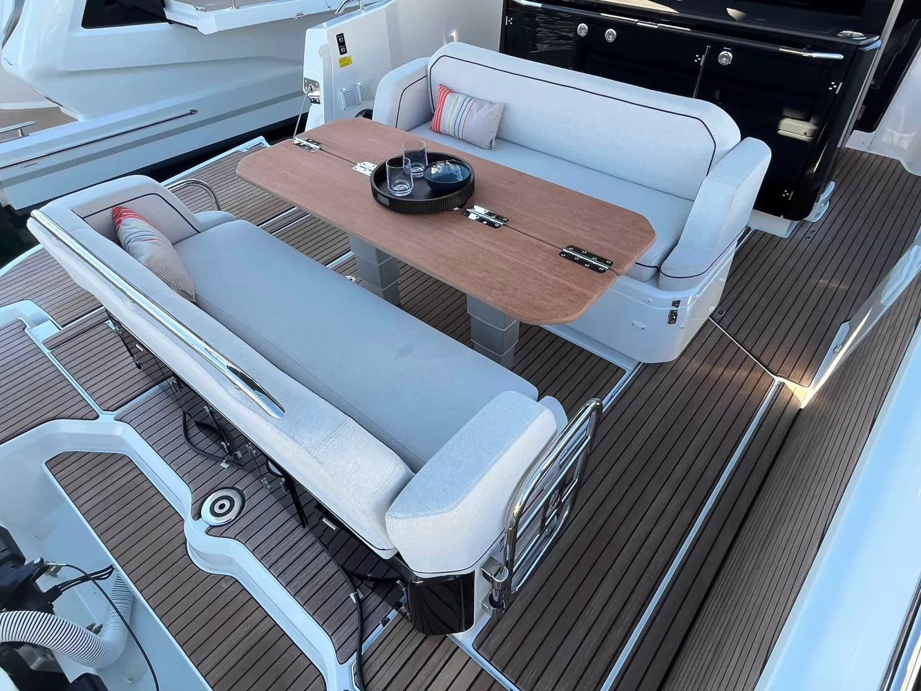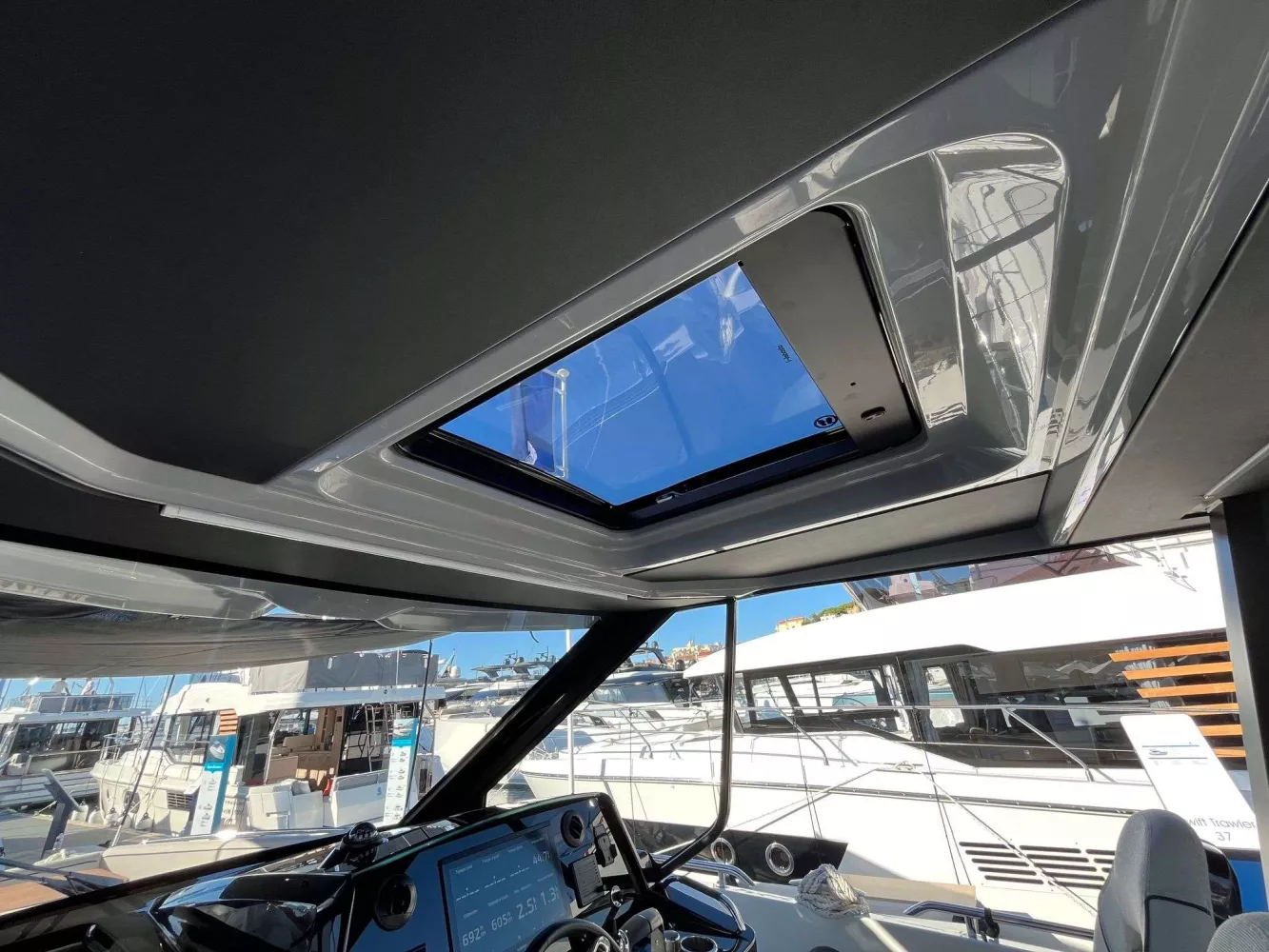 Equipement: Version standard, sellerie de carré et extérieure standard, Finition Lounge, Pack électronique Premium, Pack Sound, Davier rétractable avec guindeau électrique, Kit mouillage complet avec ancre inox, Housse de leaning post, housse de sonsole et housse de cuisine extérieure, Grill de cockpit Kenyon, Taud de soleil de cockpit, Flaps auto Zipwake 750, panneau ouvrant de roof électrique, cockpit et plateformes Iro-deck.