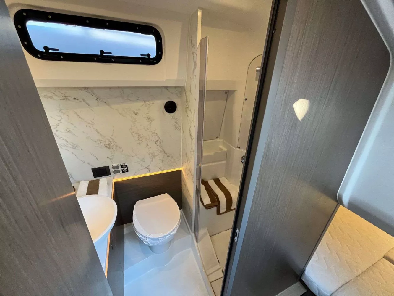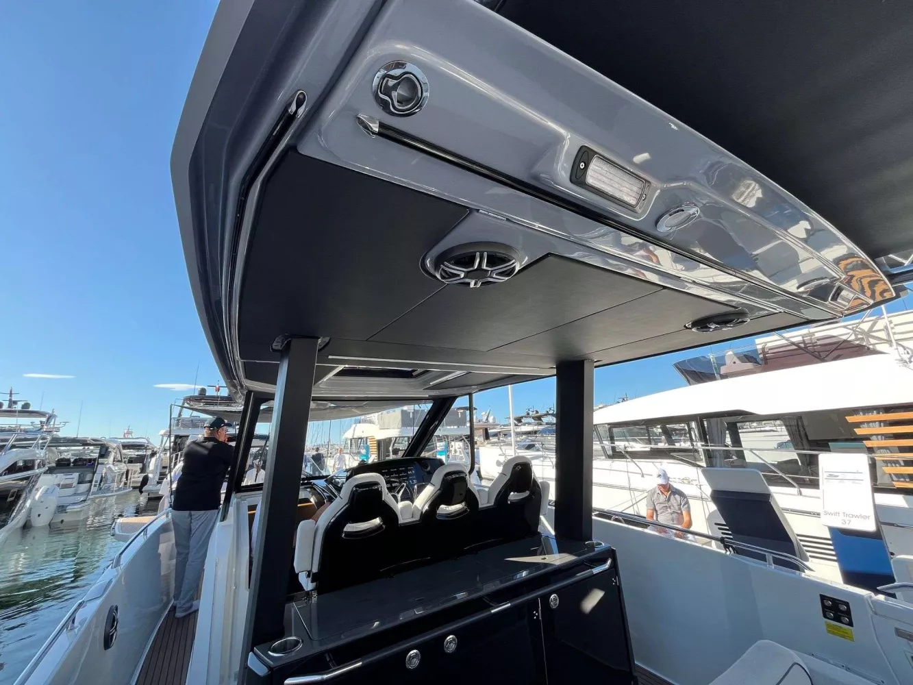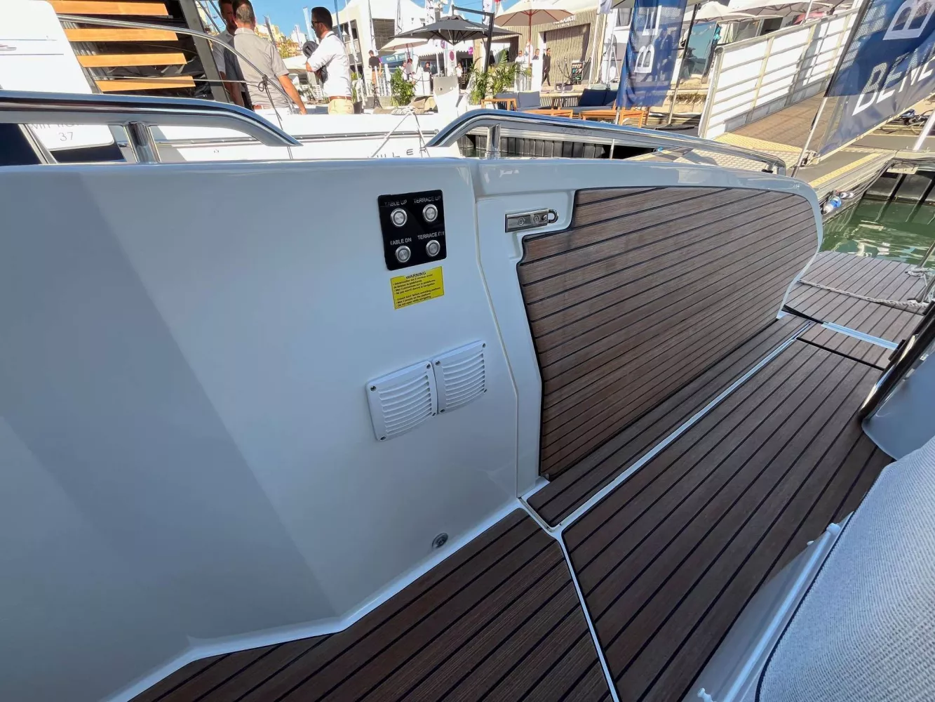 Equipement: Version standard, sellerie de carré et extérieure standard, Finition Lounge, Pack électronique Premium, Pack Sound, Davier rétractable avec guindeau électrique, Kit mouillage complet avec ancre inox, Housse de leaning post, housse de sonsole et housse de cuisine extérieure, Grill de cockpit Kenyon, Taud de soleil de cockpit, Flaps auto Zipwake 750, panneau ouvrant de roof électrique, cockpit et plateformes Iro-deck.