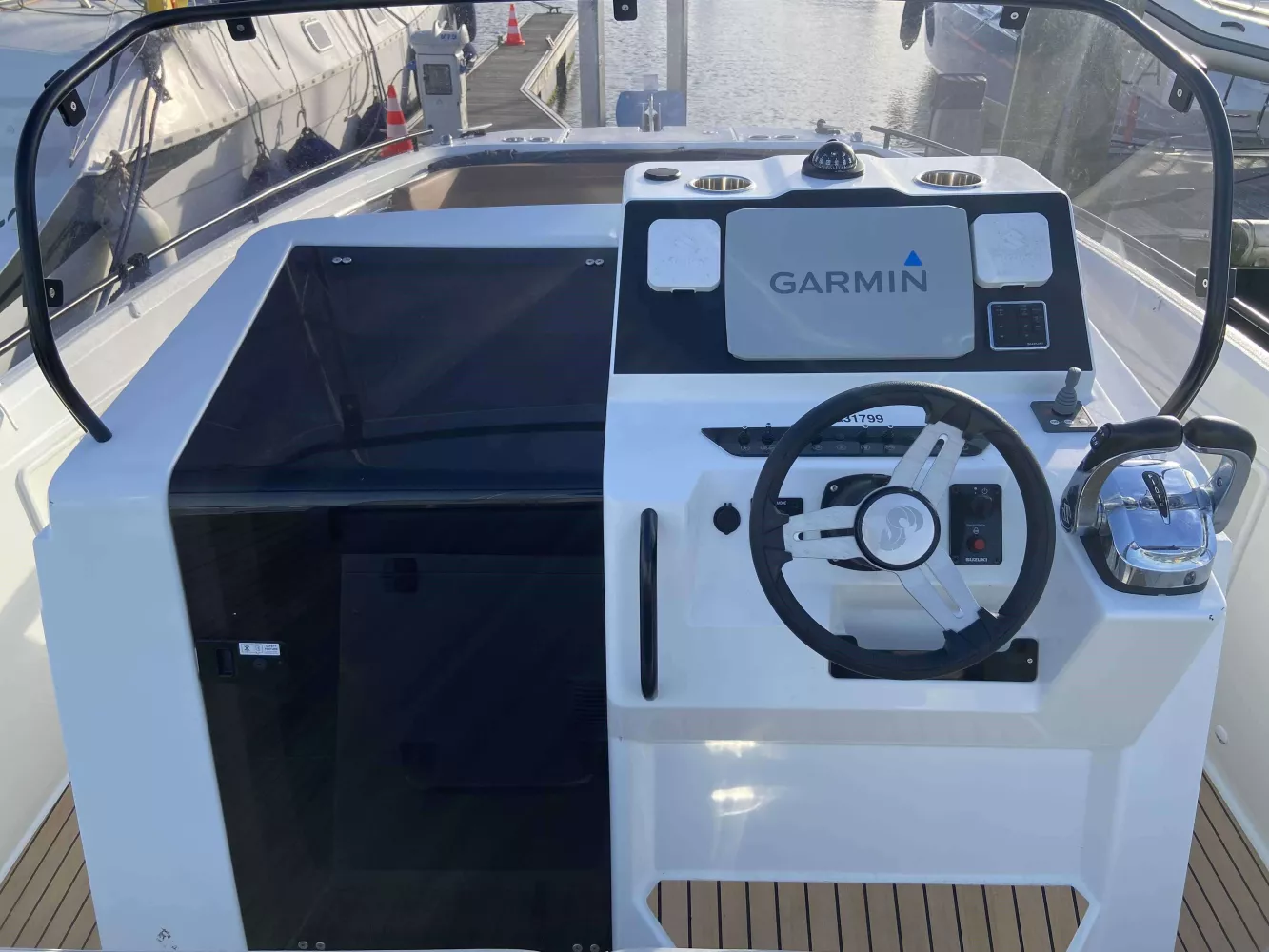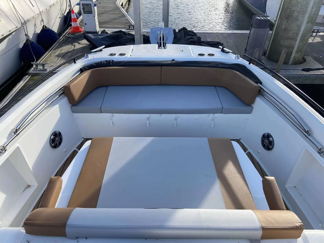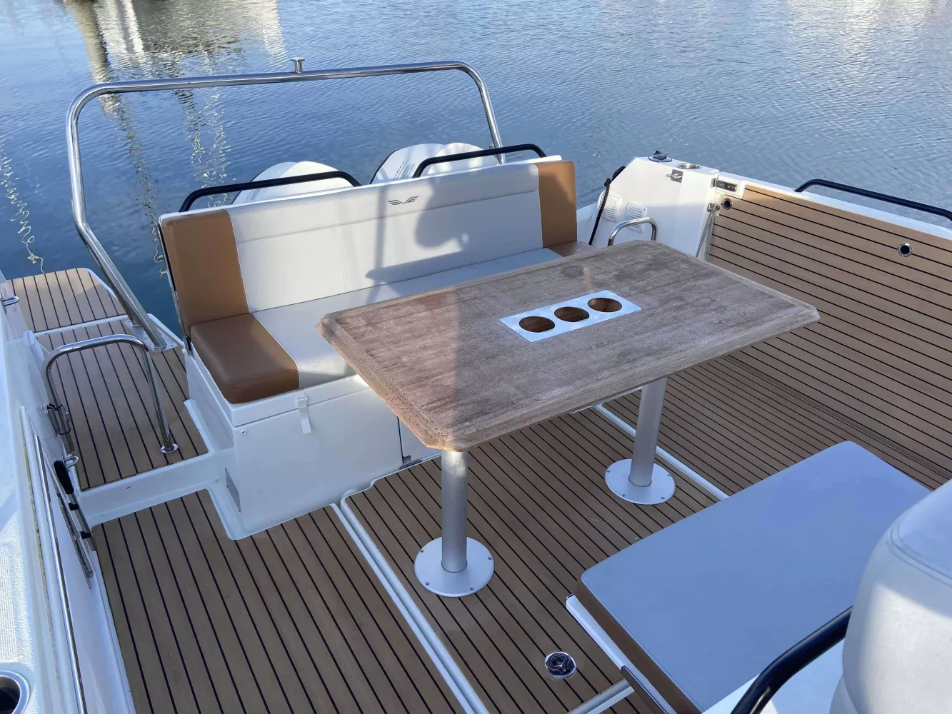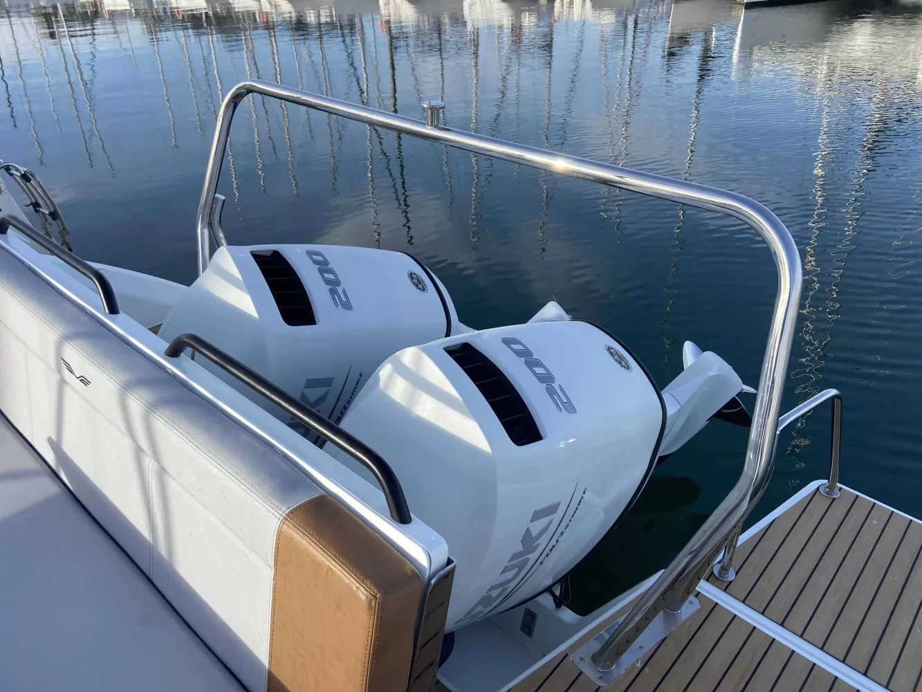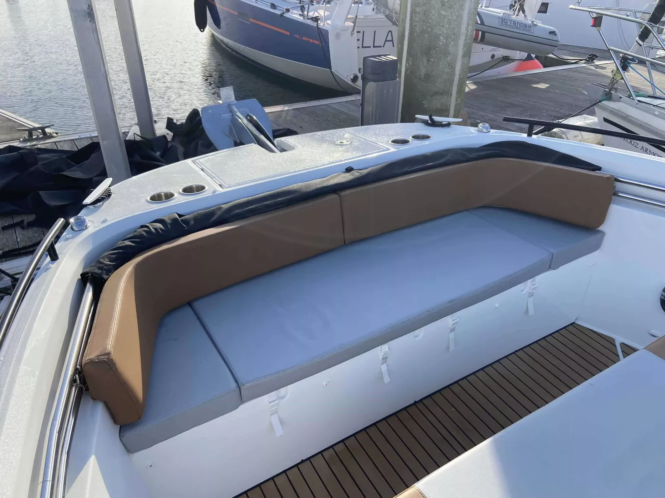 Equipement: Version sellerie Elegance et balcons noirs, Finition confort (Incluant Guindeau électrique, plateformes de bain rapportées, chauffe eau 25L, circuit électrique avec prise de quai et chargeur, Rachaud gaz extérieur, Réfrigérateur 49L dans le cockpit), GPS Sondeur GARMIN Echomap 122 Ultra avec sonde et cartographie, Pack sound Upgraded avec Subwoofer 450W, 4 enceintes signature Plus Chrome 230W et LED bleues, Ampli 1600 W et lecteur Fusion, Bimini arrière de cockpit Graphite, Canopy avant Graphie, Ensemble de housses de protection extérieures Graphite (table de cockpit - console - banquette arrière - Banquette avant - console et leaning post), Flexiteek intégral pont et plateformes de bain, Kit mouillage complet, banquette de cockpit leaning post et latérales repliables, Mât de ski, Propulseur d'étrave, Eclairage de courtoisie LED, Projecteurs sous-marins, matelas cabine avant et Mid-cabine, WC marin et réserve eaux noires, réservoirs carburant 2*280L, Armement de sécurité côtier 8 personnes, Antifouling noir.