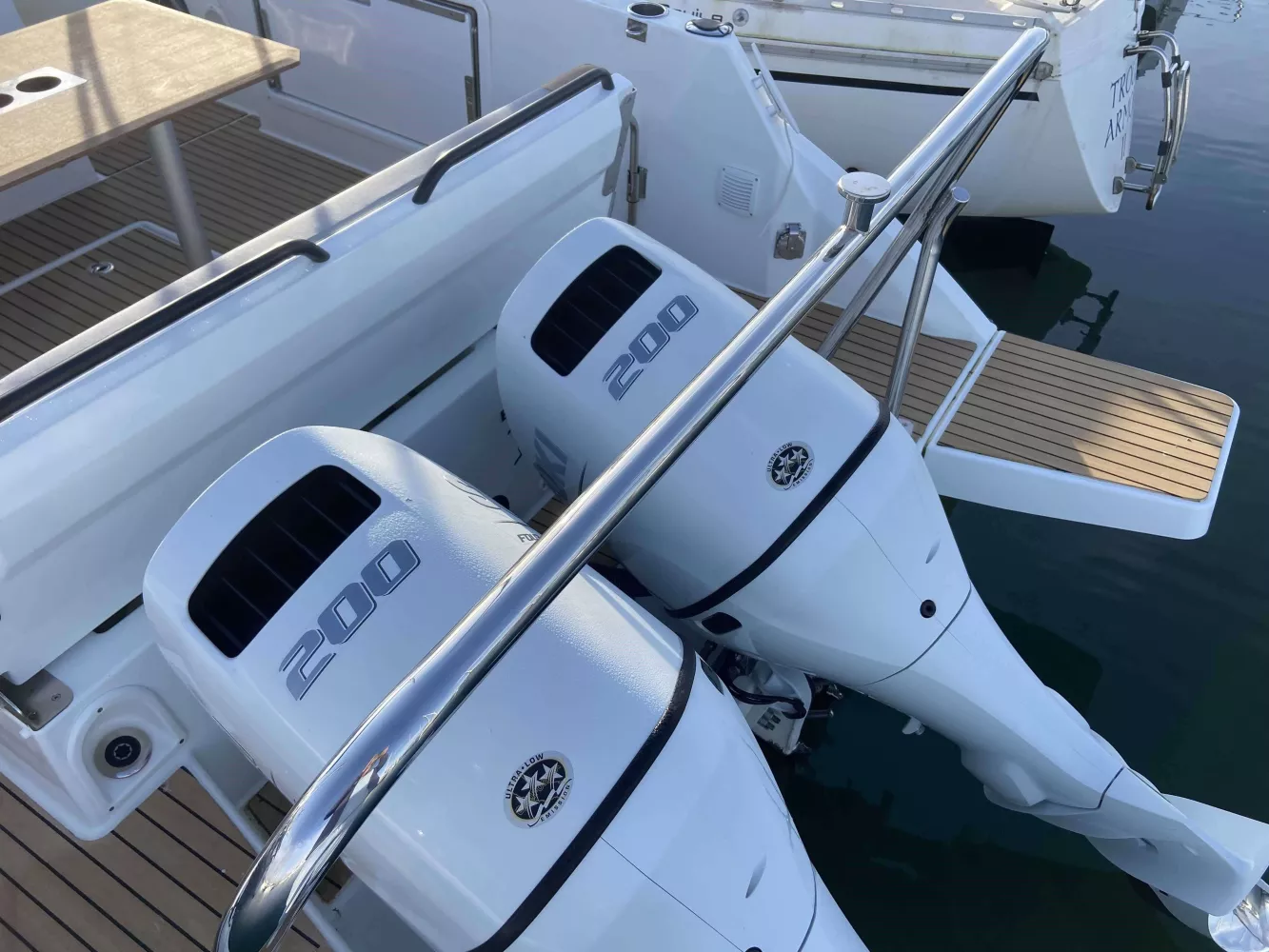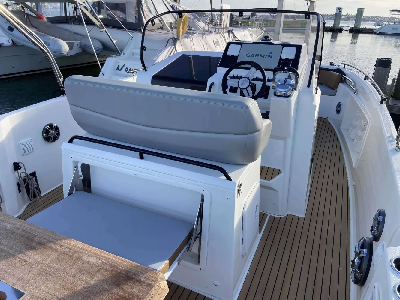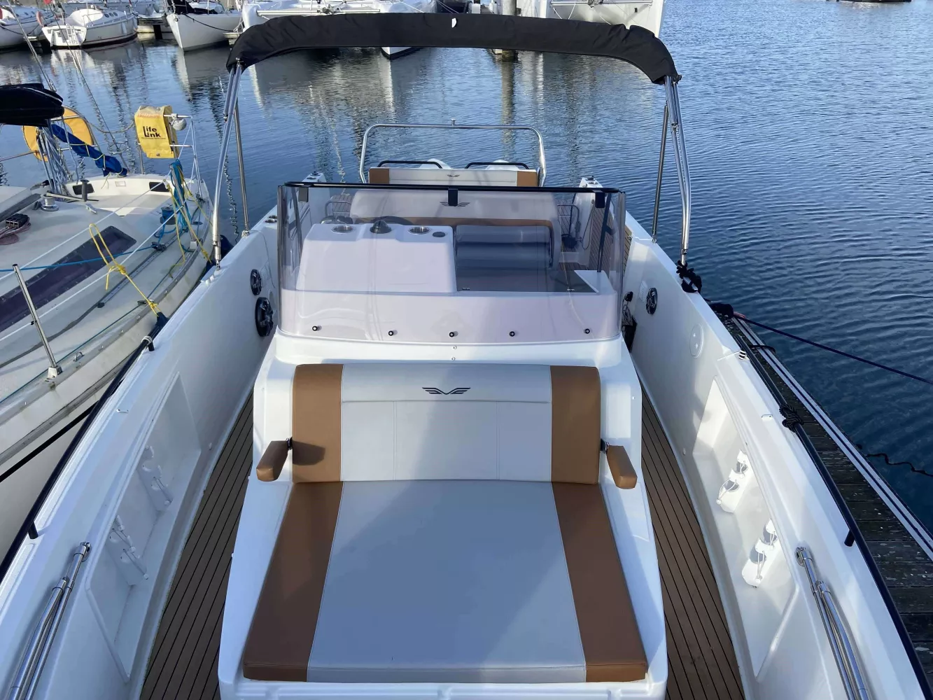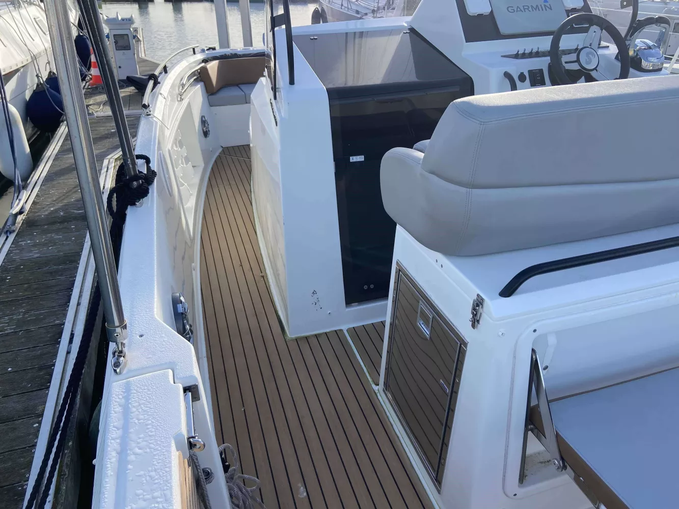 Equipement: Version sellerie Elegance et balcons noirs, Finition confort (Incluant Guindeau électrique, plateformes de bain rapportées, chauffe eau 25L, circuit électrique avec prise de quai et chargeur, Rachaud gaz extérieur, Réfrigérateur 49L dans le cockpit), GPS Sondeur GARMIN Echomap 122 Ultra avec sonde et cartographie, Pack sound Upgraded avec Subwoofer 450W, 4 enceintes signature Plus Chrome 230W et LED bleues, Ampli 1600 W et lecteur Fusion, Bimini arrière de cockpit Graphite, Canopy avant Graphie, Ensemble de housses de protection extérieures Graphite (table de cockpit - console - banquette arrière - Banquette avant - console et leaning post), Flexiteek intégral pont et plateformes de bain, Kit mouillage complet, banquette de cockpit leaning post et latérales repliables, Mât de ski, Propulseur d'étrave, Eclairage de courtoisie LED, Projecteurs sous-marins, matelas cabine avant et Mid-cabine, WC marin et réserve eaux noires, réservoirs carburant 2*280L, Armement de sécurité côtier 8 personnes, Antifouling noir.
