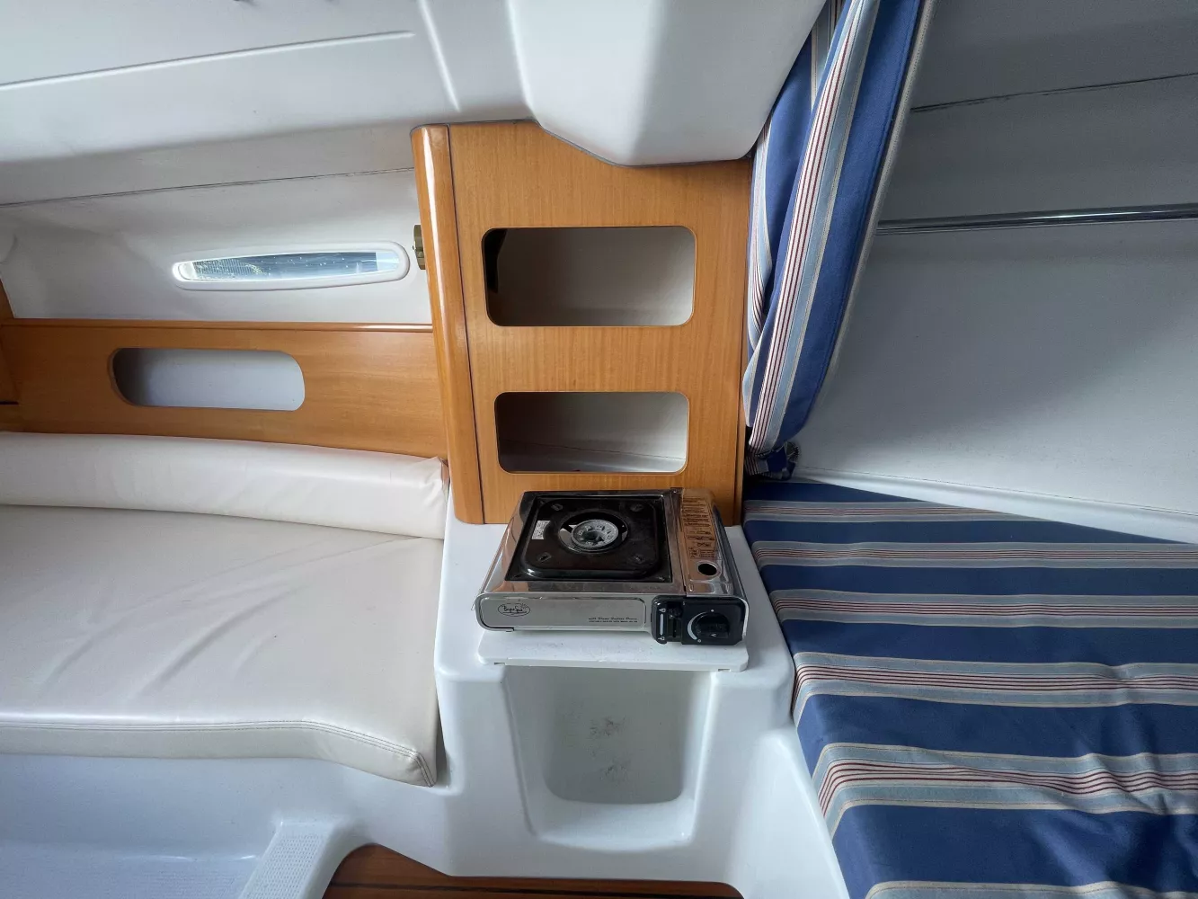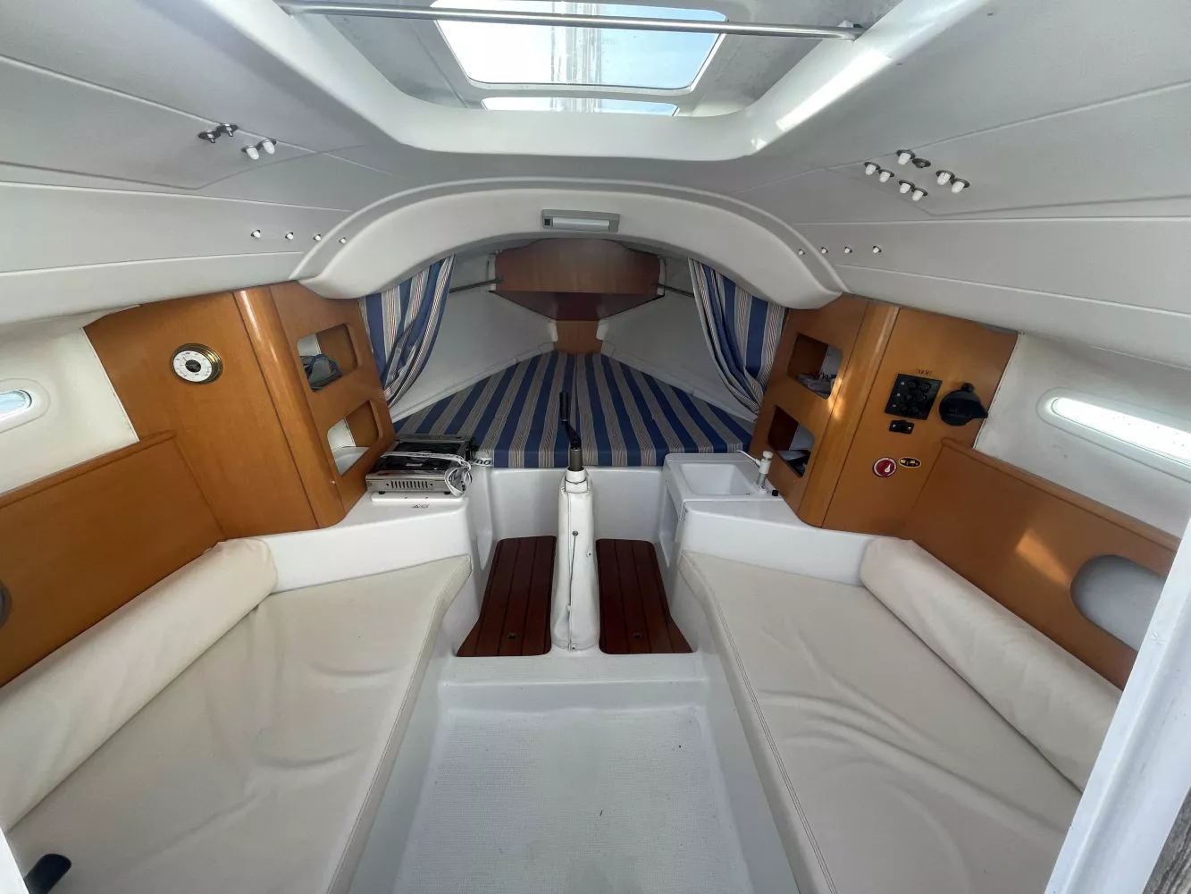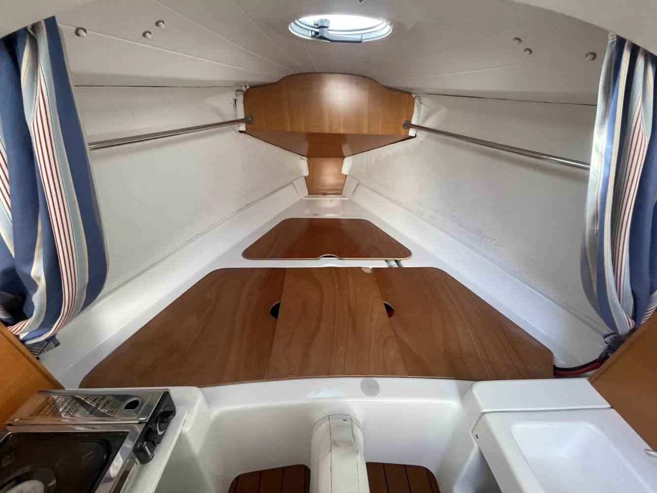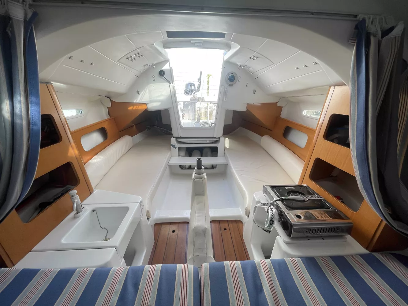 *Intérieur : 1 cabine, 4 couchages, 1 réchaud à gaz, 1 évier avec eau douce, nombreux rangements, table repliable, rideaux intérieurs, hublot ouvrant de cabine, prise 12V.