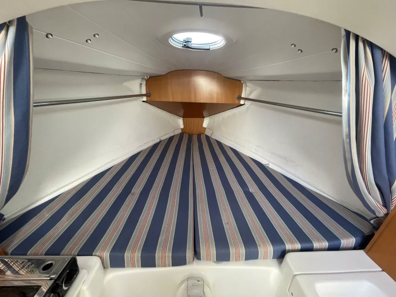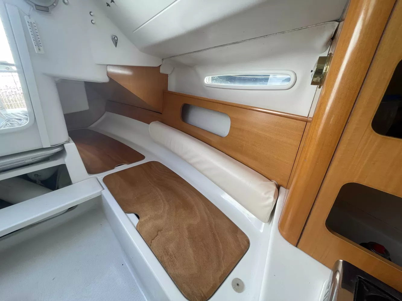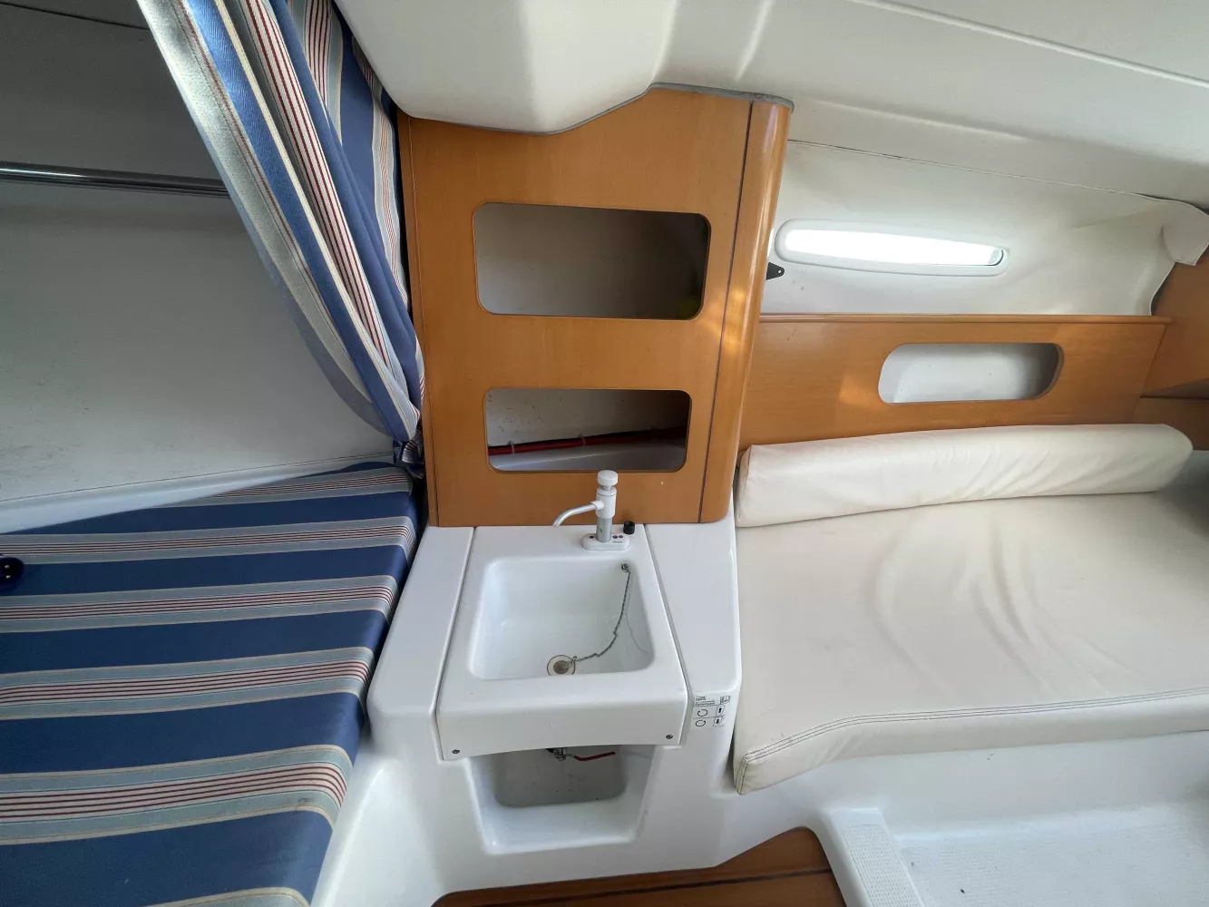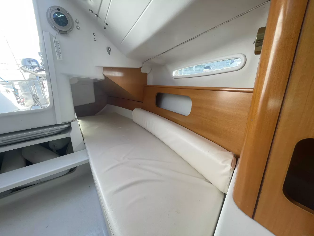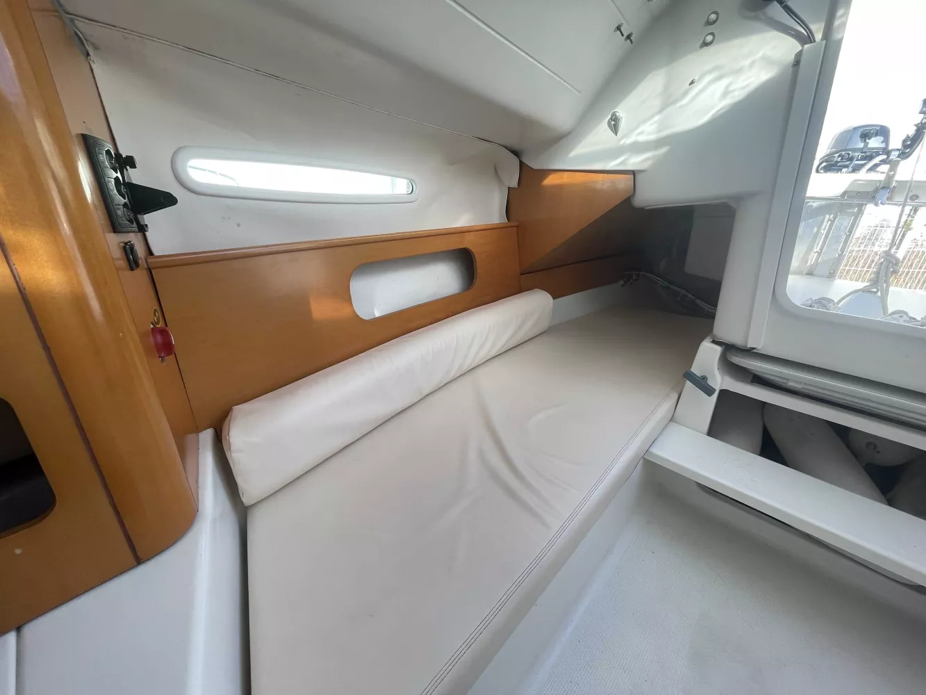 *Intérieur : 1 cabine, 4 couchages, 1 réchaud à gaz, 1 évier avec eau douce, nombreux rangements, table repliable, rideaux intérieurs, hublot ouvrant de cabine, prise 12V.