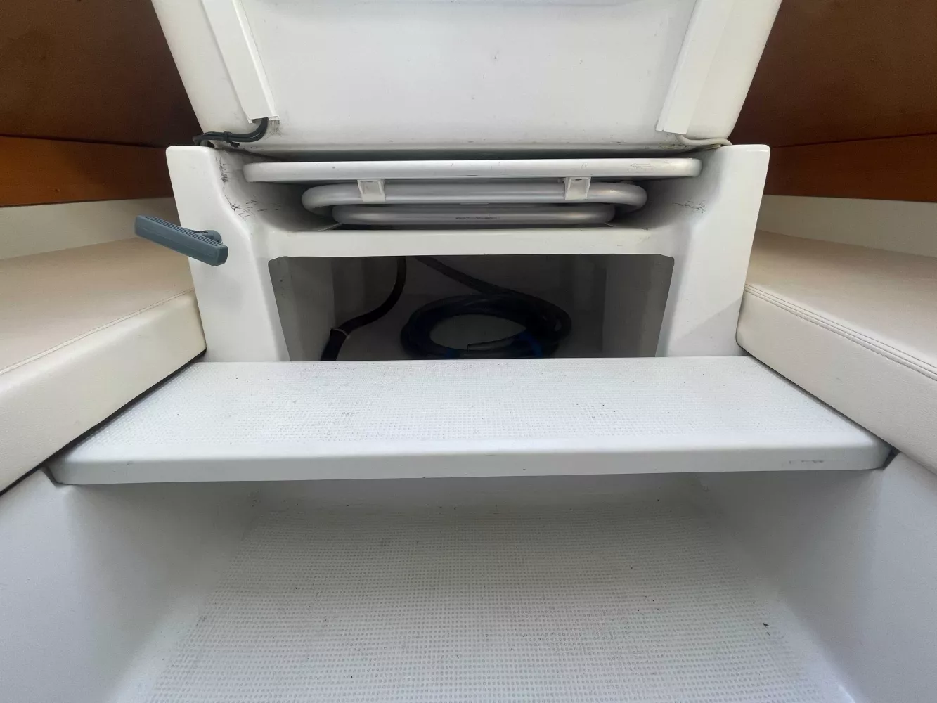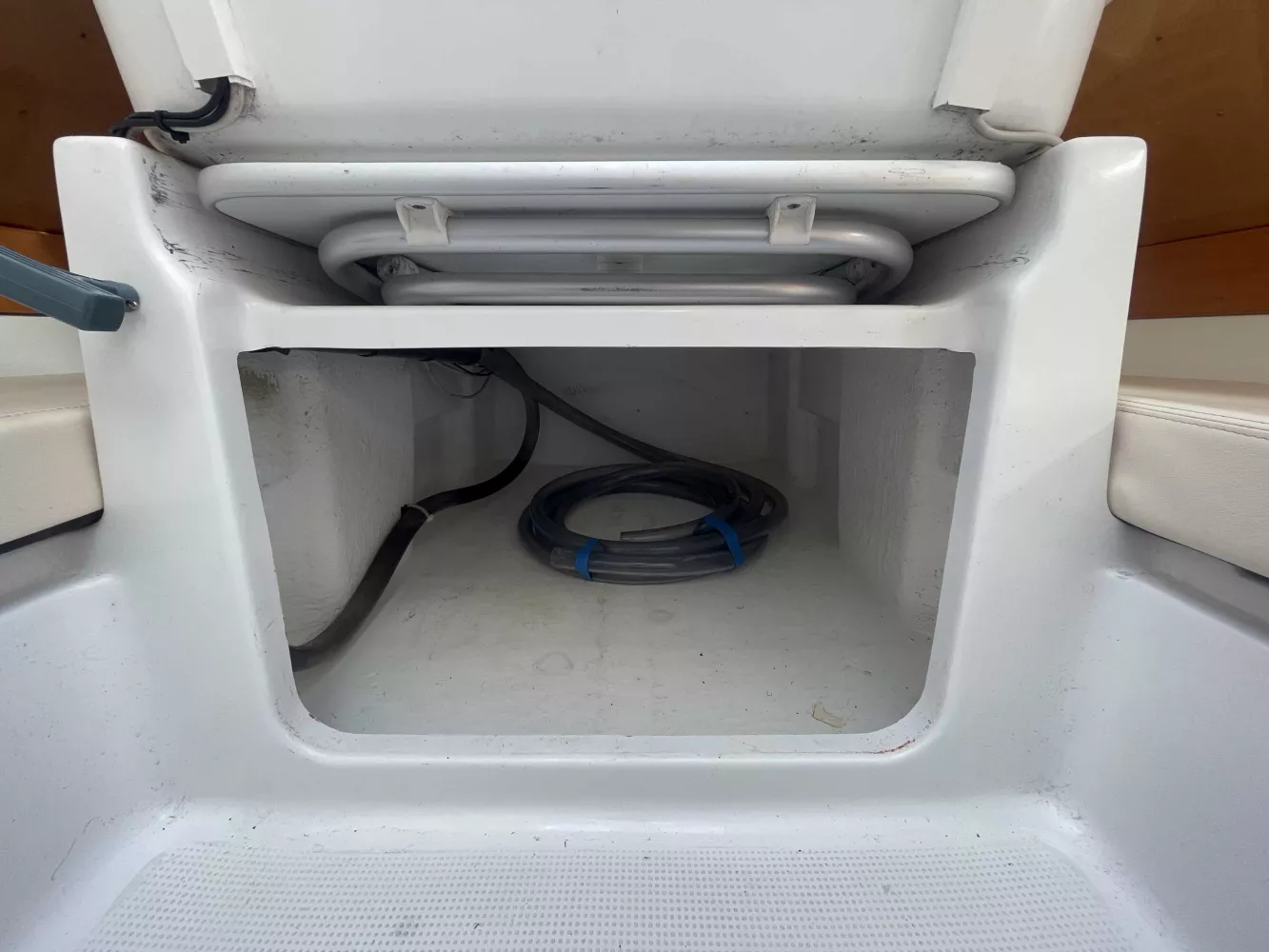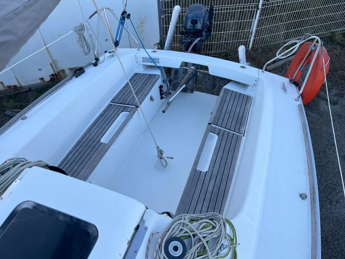 *Extérieur : Barre franche, Bi-safrans, 2 winchs + manivelle de winch, capot de descente, compas, échelle de bain, emplacement pour bouteille de gaz, coffre de rangement dans le cockpit sur tribord et bâbord, 7 Spinlocks, Feu de tête de mât tricolore neuf (2025).