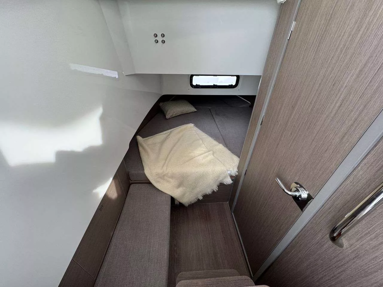 Cet aménagement montre que vous n’êtes pas limité à une simple journée en mer : vous pouvez aisément envisager une escapade d’une nuit, un week-end improvisé ou un déjeuner prolongé à bord. Le salon avant transformable en bain de soleil vient compléter cet ensemble en apportant un espace convivial et modulable.