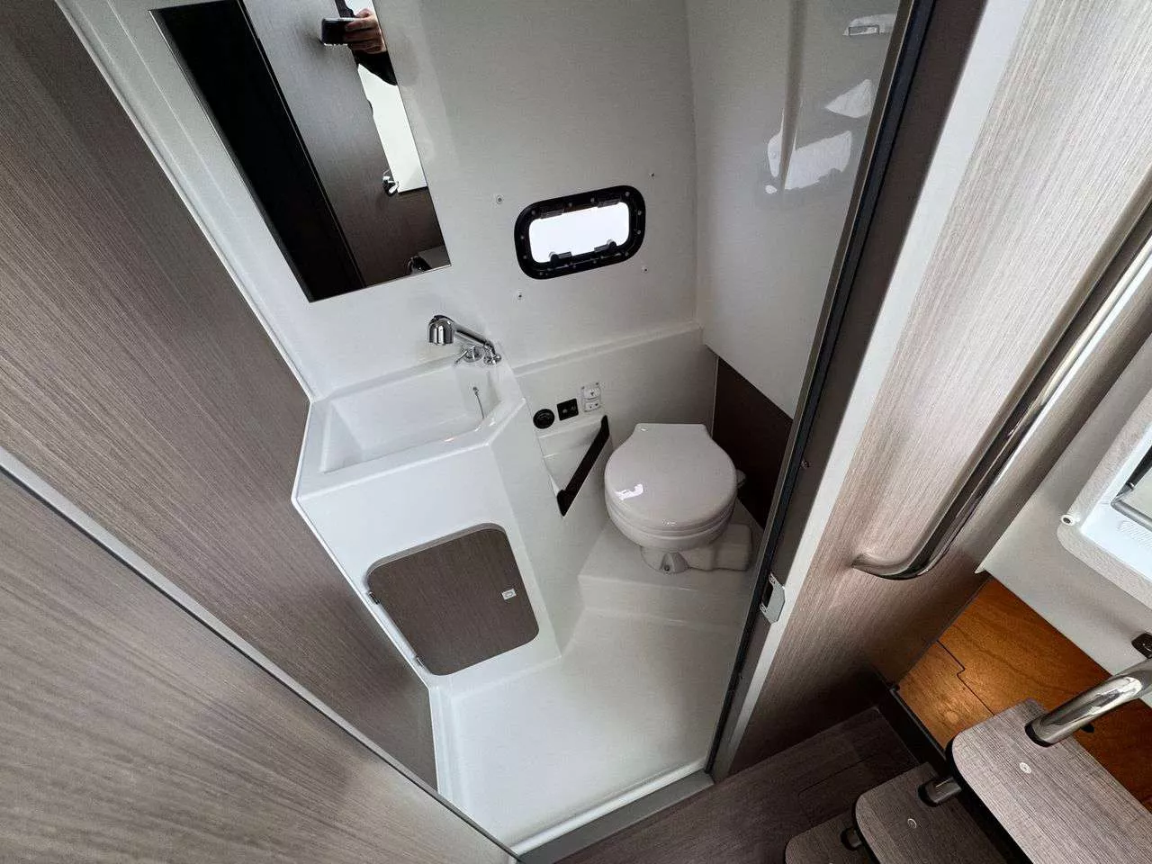 Même dans cette catégorie, Bénéteau a souhaité proposer un confort digne d’un petit cruiser. Le Flyer 9 SPACEdeck dispose d’une cabine offrant deux couchettes, une véritable salle d’eau avec WC et douche séparée, et des rangements bien pensés.