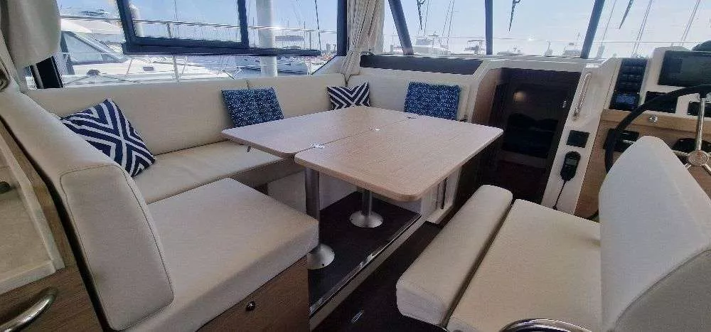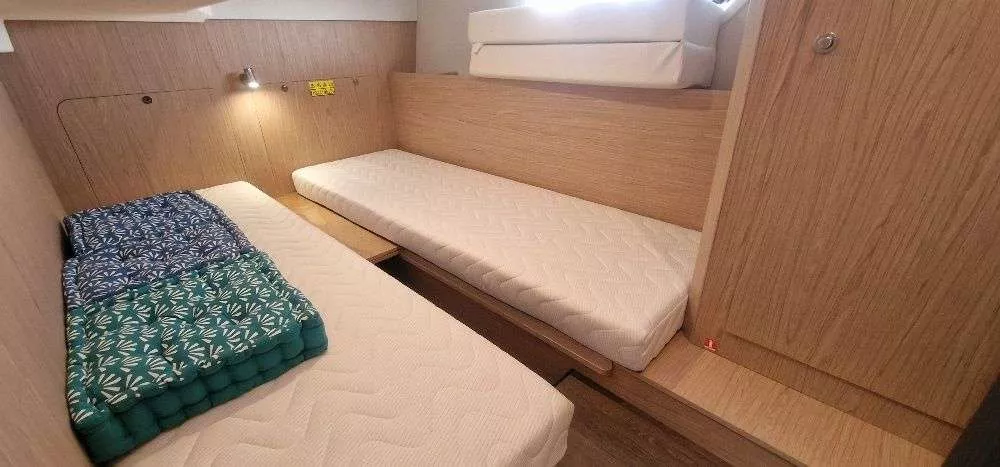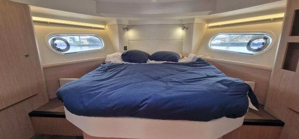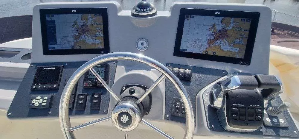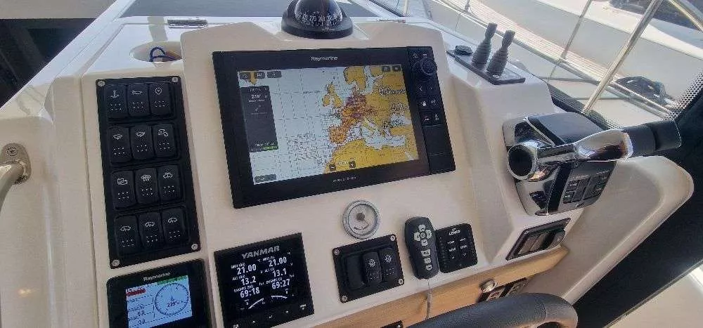 L’intérieur, chaleureux et lumineux, propose 3 cabines élégantes en Alpi Chêne Dosse, 2 salles d’eau, un carré raffiné et convivial en configuration vis-à-vis, et des équipements haut de gamme : pack électronique Raymarine complet, propulseurs d’étrave et de poupe, flybridge équipé avec frigo, bain de soleil, table portefeuille et bimini Oyster.