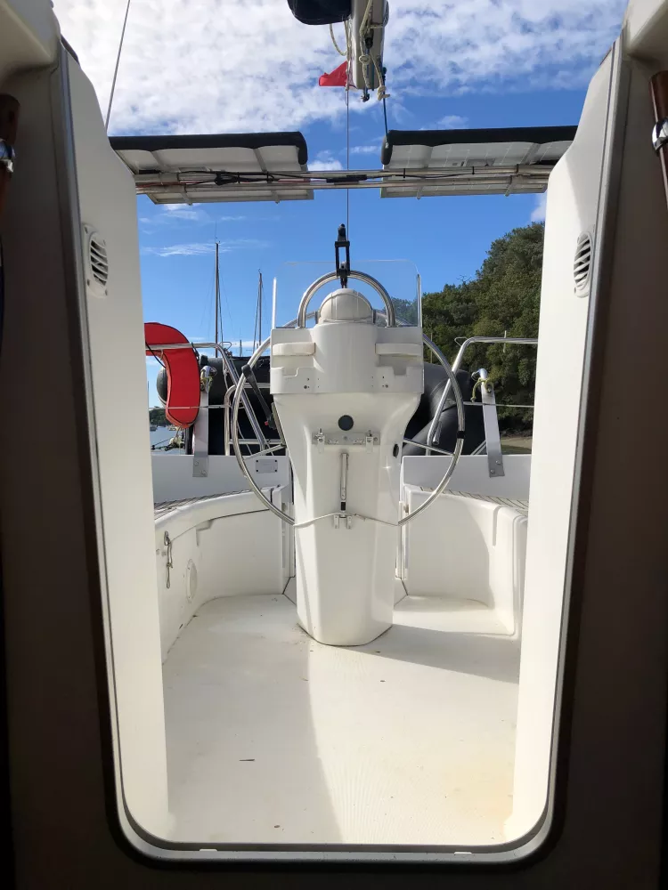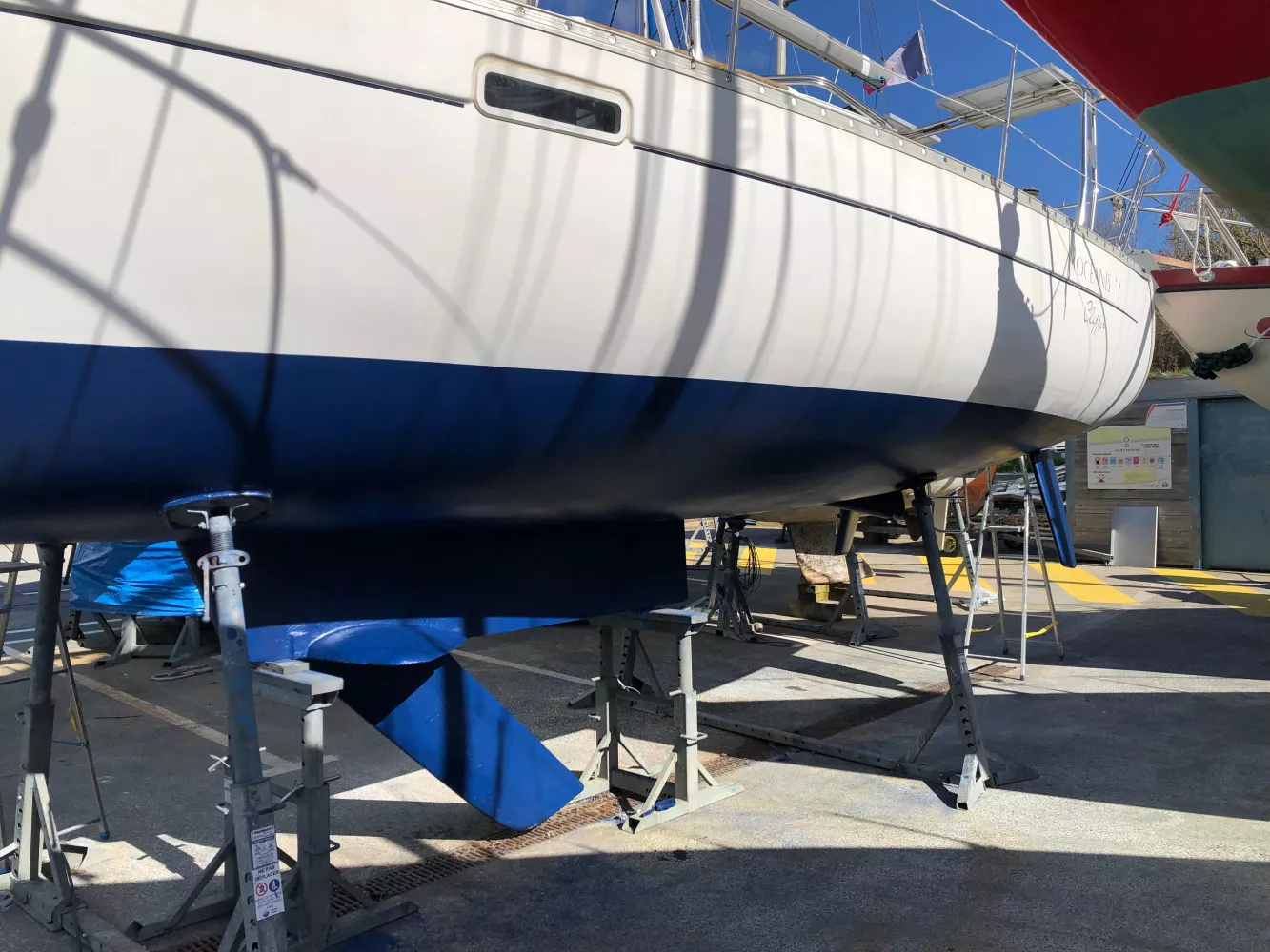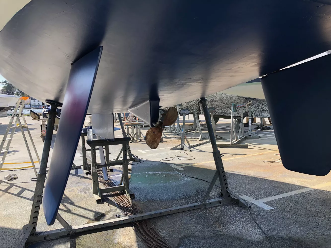 Coque décapée des anciens antifouling en mars 2025 (couche de primaire)