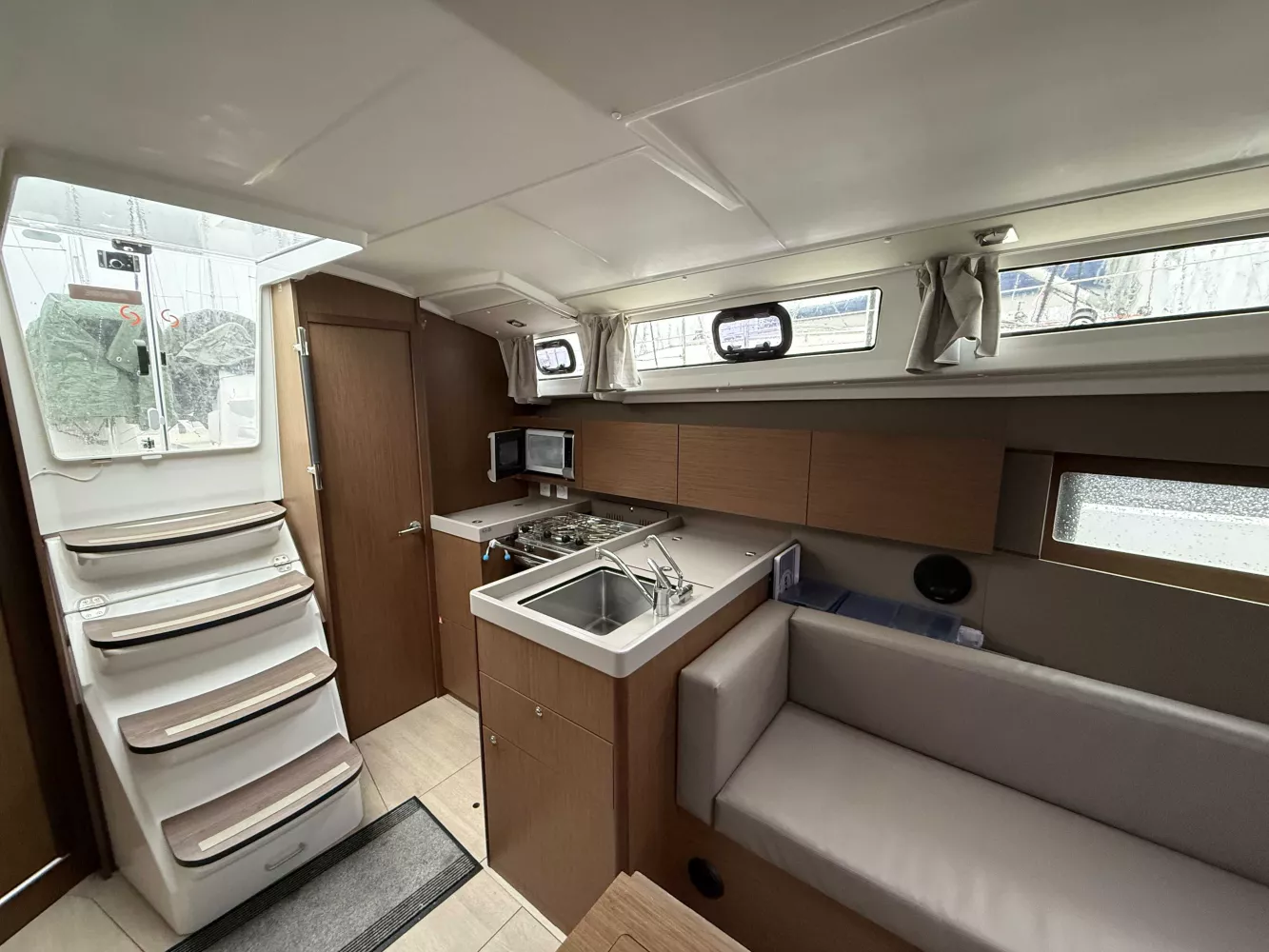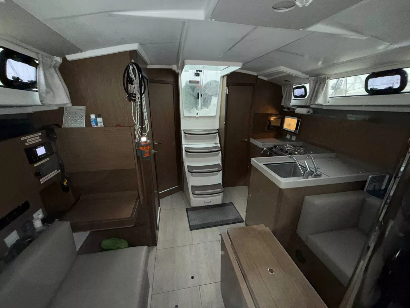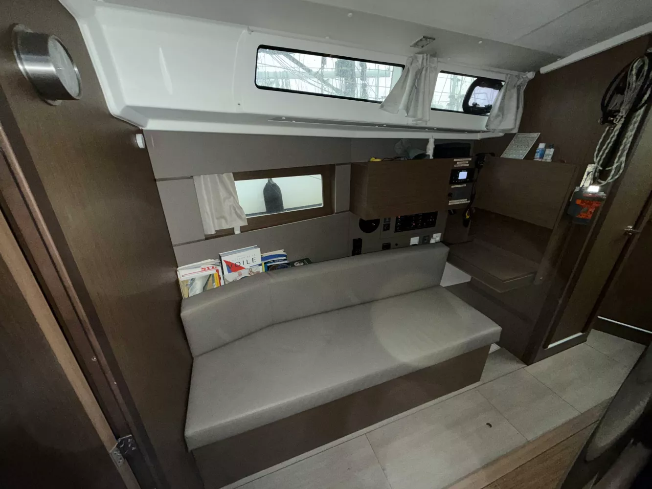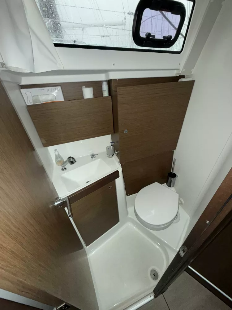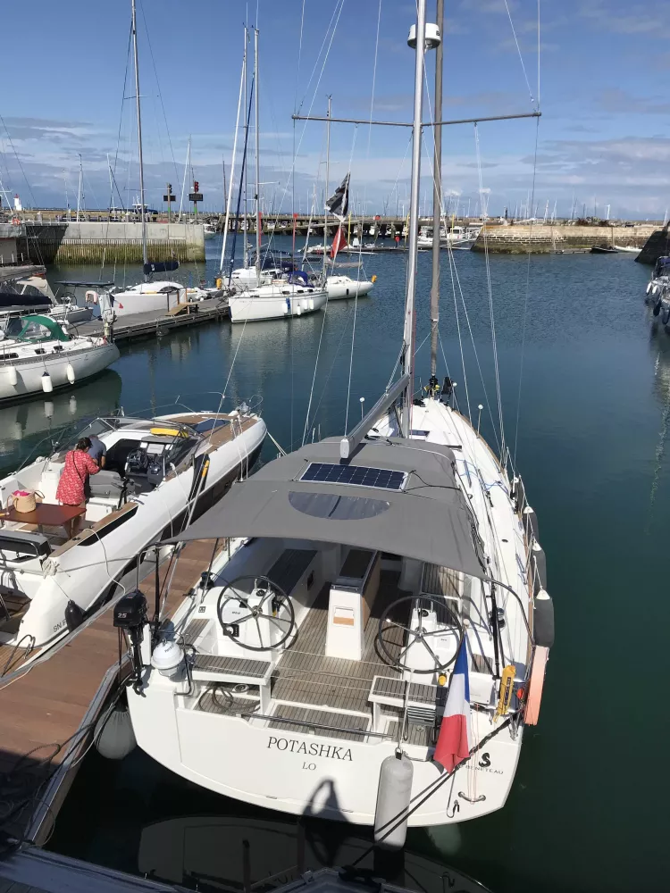 Coque grise, Version 2 cabines - Sellerie du carré PVC Taupe - Cuisine en L et salle de douche séparée arrière tribord, Finition Confort, Pack coastal et offshore BandG, Mât enrouleur et Grand génois sur enrouleur, Arceau de Grand-Voile, Code 0 sur emmagasineur (Stormlite 210 + Bande UV Charcoal Grey 60m² et emmagasineur Facnor FX 2500 Click), Spi asymétrique sur emmagasineur, Trinquette sur étai largable et avec sac de pont, Fermeture arrière complète et capote de descente Charcoal Grey + Housses de barres et consoles, réglage au cockpit des chariots de génois, Winch manoeuvre tribord manuel, Winch électrique manoeuvre babord, Arceau de GV, table cockpit luxe-polyester + Housse de table, Coussins de cockpit, Propulseur d'étrave, prise eau douce de quai, réserve eau suppl 200L, Chauffage air pulsé, marches descente en bois, Capitionnages Taupe, sommiers à lattes, WC électrique, Four micro-onde, hélice tripales repliables, Radar et VHF +AIS 500, Pilote automatique, fond de cockpit latté bois massif, Support moteur hors-bord, armement semi-hauturier et radeau de survie, Kit mouillage complet avec Ancre Spade 15Kg.