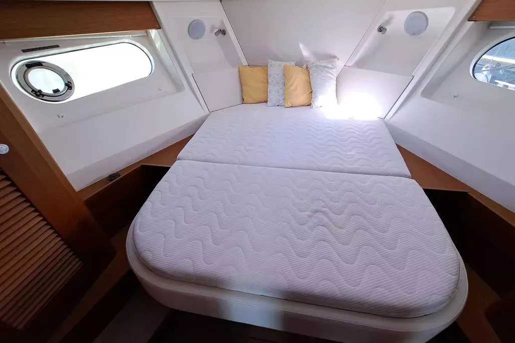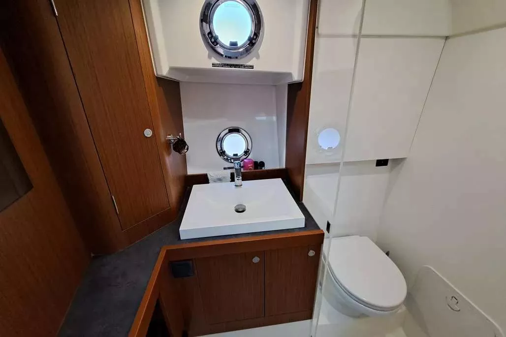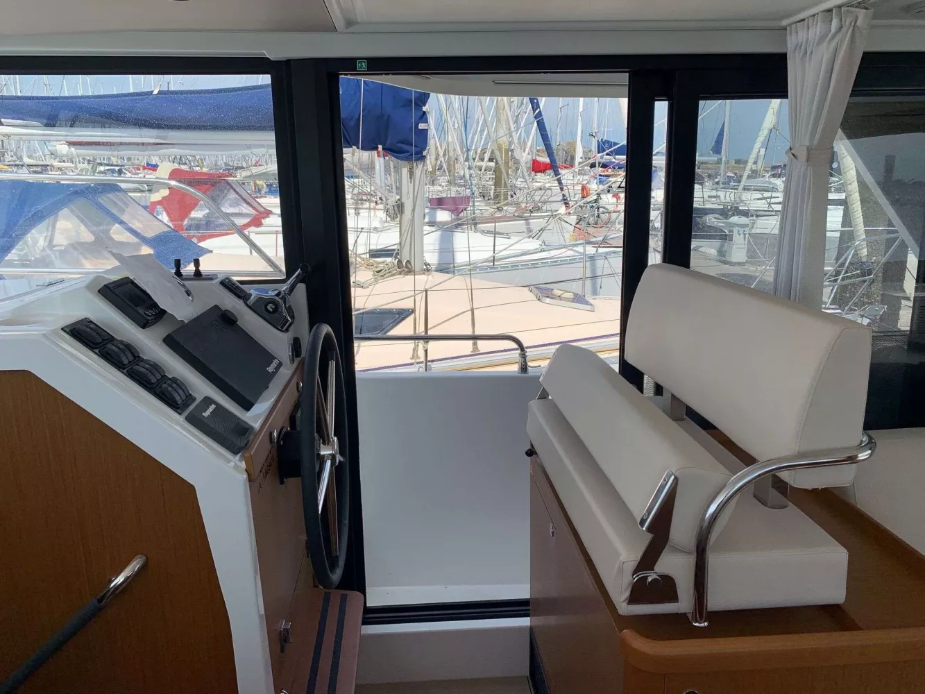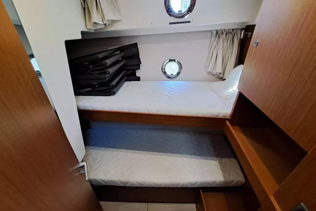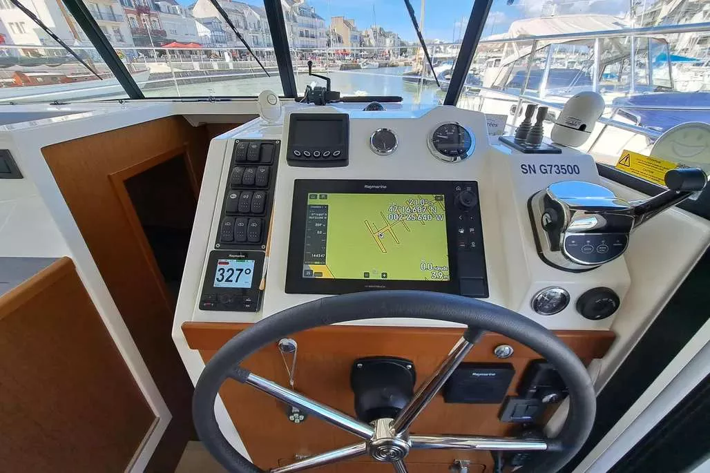 Equipement: Coque blanche, Boiseries intérieures New Teck avec Portes persiennes, Selleries intérieures et extérieures Marlin Brilliant White, Finition Comfort (incluant Guindeau électrique 1000W, Pompe de lavage de pont, Convertisseur 12-200V 700VA, VHF Double Poste AIS, porte gobelets, Ensemble de housse de flybridge, Prise eau douce de quai et tiroir réfrigéré au fly), Pack Electronique Raymarine avec Ecran 12 pouces au fly et en timonerie et Pilote automatique double poste, Pack entertainement cabine avant et carré (pré-dispos TV et Fusion Apollo 670), Kit mouillage complet, 2 banquettes de cockpit repliables, Propulseurs de poupe et d'étrave, Projecteur de pont, Chauffage Fuel air pulsé, Portes Persiennes New Teck, Batterie service AGM Supplémentaire, Rideau de séparation carré-cuisine, Zipwake autotrim system, Moustiquaires hublots et portes, Passavant tribord et fond de cockpit bois massif.