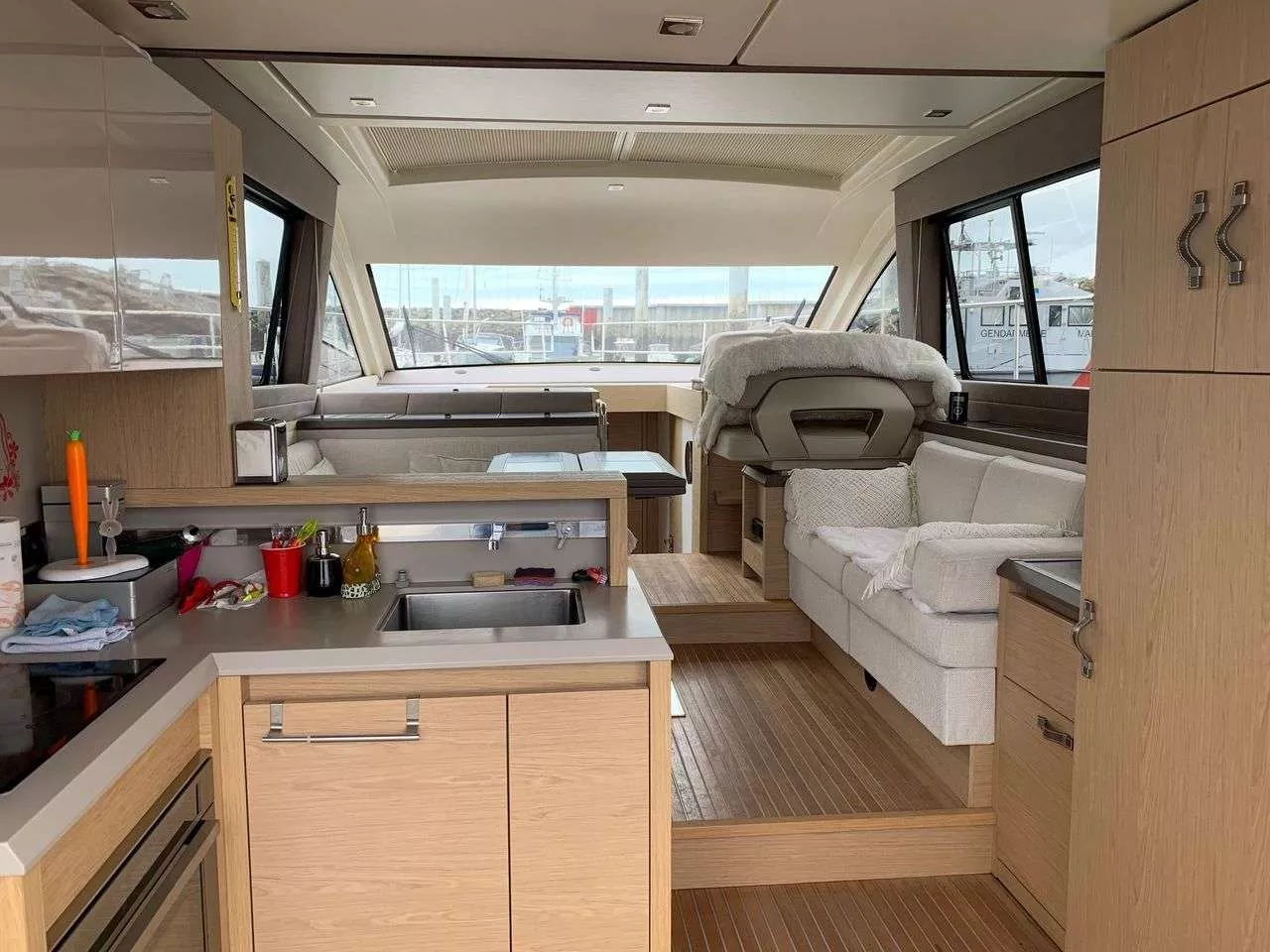 Le carré central, baigné de lumière grâce à ses larges vitrages, se distingue par sa nouvelle sellerie et son atmosphère chaleureuse. C’est un véritable espace de vie, idéal pour recevoir ou prolonger la navigation dans une ambiance conviviale.