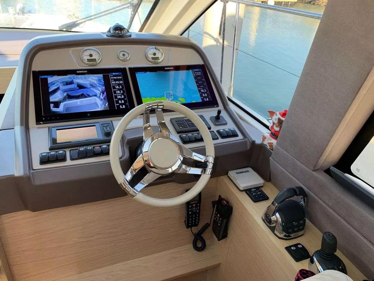 Le poste de pilotage, ergonomique et épuré, intègre une double instrumentation SIMRAD NSO16 avec radar, sondeur, AIS et pilote automatique — un ensemble complet qui assure confort, sécurité et précision en toutes conditions.