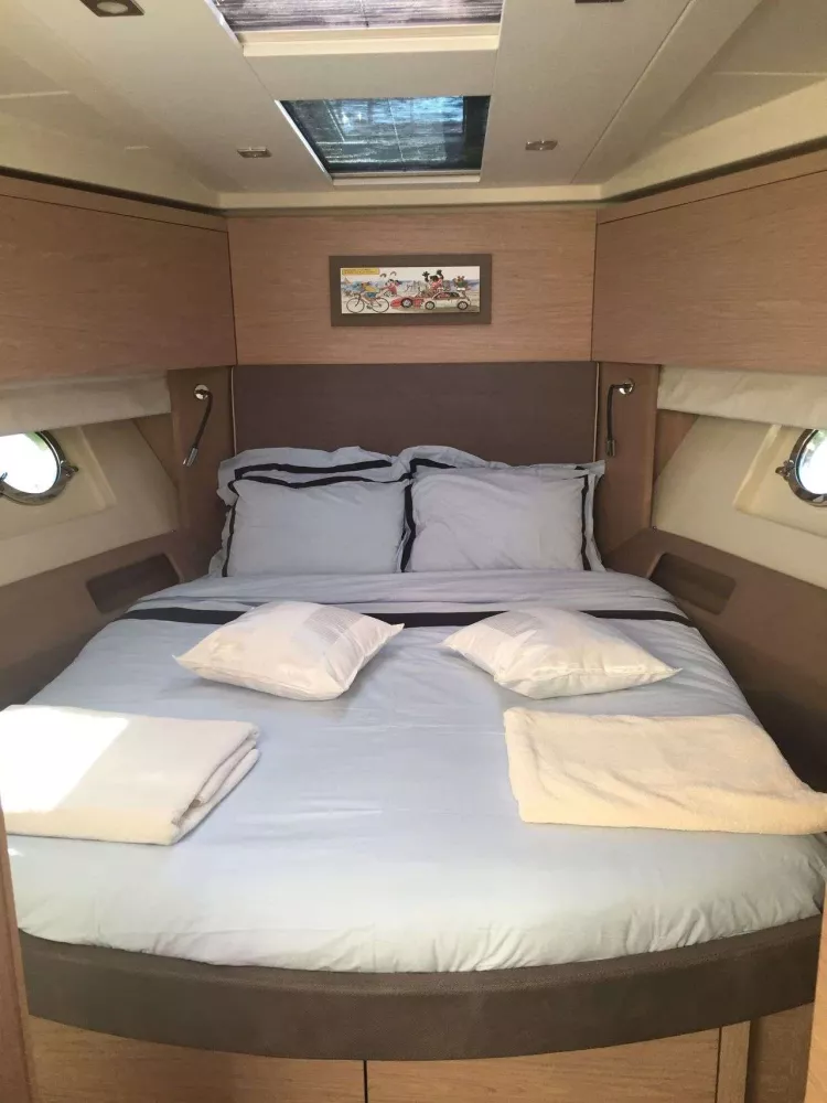 La cabine propriétaire, située en pleine largeur, bénéficie d’une superbe luminosité grâce à ses hublots panoramiques, d’une TV LED 32’’ avec système Bose, et d’un mobilier en chêne brossé, signature de la finition haut de gamme Monte Carlo.