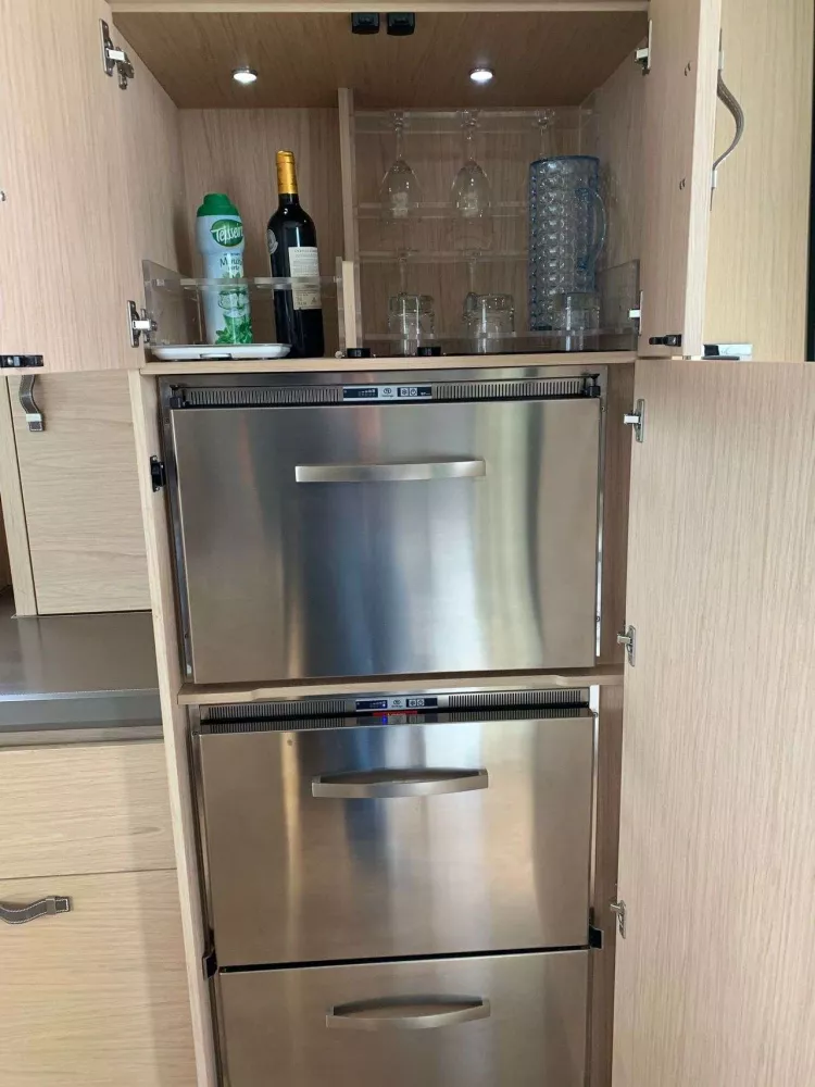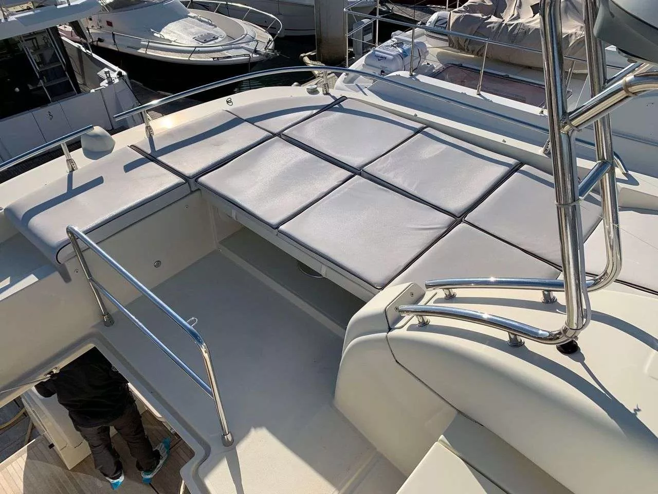 La convivialité extérieure est renforcée par la plateforme hydraulique, un atout majeur pour les amateurs de loisirs nautiques ou pour faciliter l’accès à bord lors des baignades.