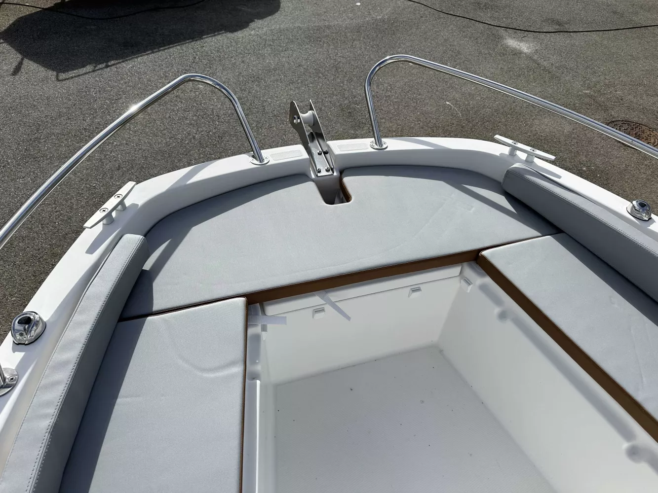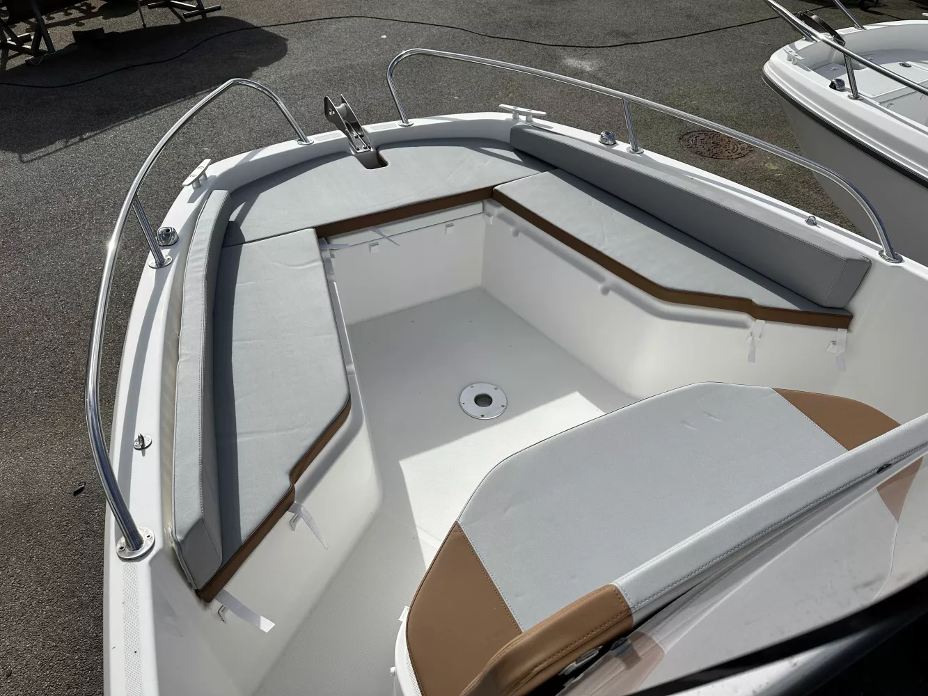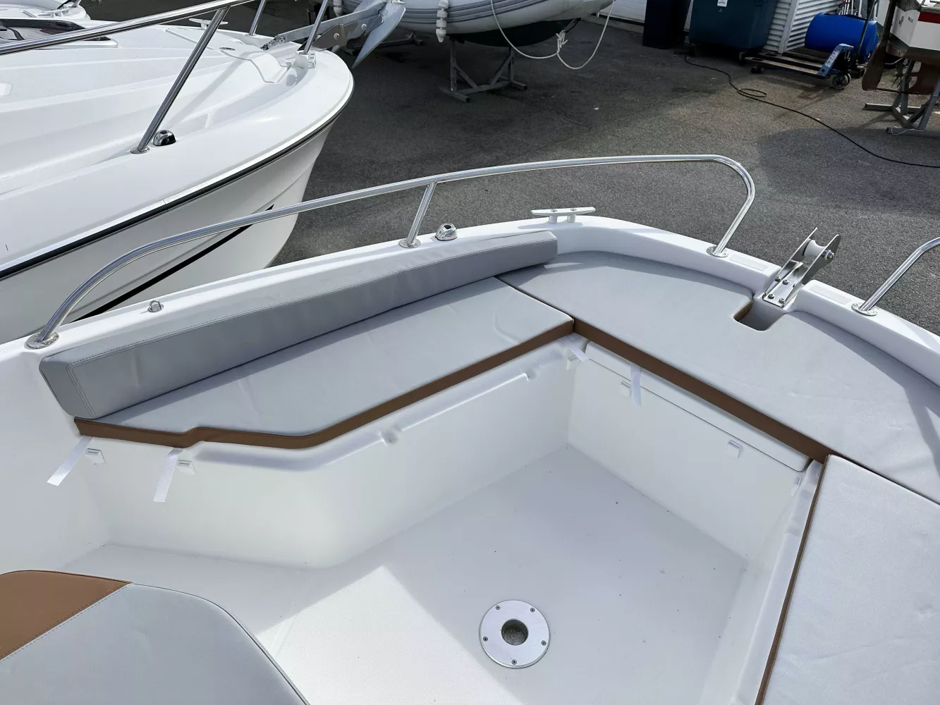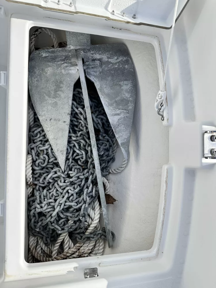Équipements : pack électronique Garmin Echomap UHD 72CV avec sonde GT23, plateformes de bain en polyester, bimini de cockpit, housses de console et de leaning post graphite noir, bain de soleil avant rigide, armement de sécurité à jour.
