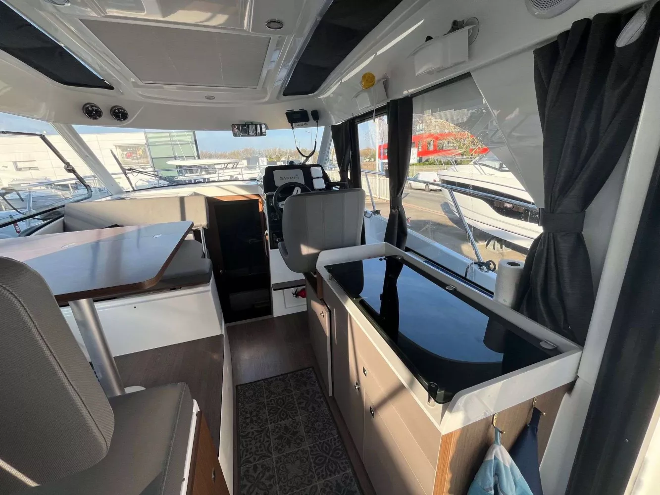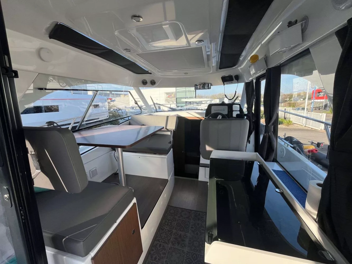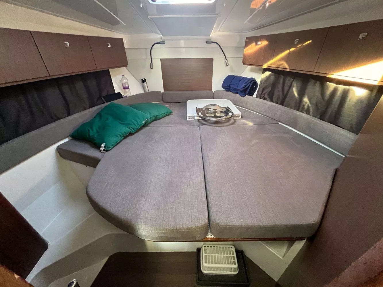 Version Sellerie Elegance, Finition Confort (Incluant table intérieure, vitre latérale babord coulissante, 2eme essuie-glace et lave glace, Cale Pieds Pilote, 2 Portes-cannes, porte-gobelet, Table de cockpit polyester, Rideaux intérieurs, Plateformes de bain rapportées, Guindeau électrique et plancher Chène brun en timonerie), Pack cuisine équipée Gaz (Incluant Réchaud Fixe 2 Feux, Réfrigerateur 60L, Abbattant en verre de protection du plan de travail, Evier inox), Pack électronique GARMIN 92 xsv avec sonde et cartographie, sytème audio FUSION avec 4 Haut-parleurs, Taud de soleil Inox et Fermeture de cockpit CADET Grey, Carré de cockpit convertible bain de soleil, Propulseur d'étrave, Chauffe-eau 25L, Circuit électrique complet 220V, Complément de couchage dans le carré, Meubles de rangement haut dans la cabine avant, Système de trim auto Zipwake, VHF Garmin 215, Kit mouillage complet avec ancre FOB 14Kg et 35M de chaine + 40M de bout , armement de sécurité semi-hautirer 4 personnes avec radeau de survie Plastimo Coastal 4 places.