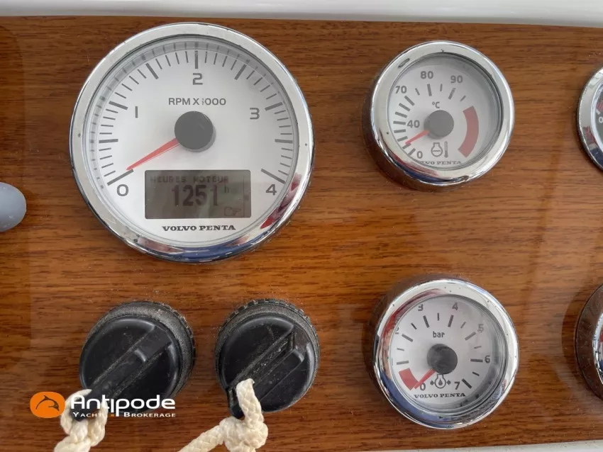 SWIFT TRAWLER 42, 2009, VOLVO D4, 2 x 300 cv (1248h), Propulseur d'étrave, 1 cabine avant propriétaire, 1 cabine invités : lit double et 1 lit simple superposé (démontable), 2 cabinets de toilettes et douche, Planchers stratifiés, Selleries carré tissu Altra Chanvre, Table de carré convertible en couchette double, Cockpit latté teck, Cagnards de flying bridge dans les filières (2023), Guindeau électrique - LEWMAR, Commandes guindeau à pied, aux postes de fly et de timonerie, Bimini flying bridge, Sellerie flying bridge, Housse de siège flying bridge, Tauds de fermeture arrière complète du cockpit, Taud extérieur de timonerie, Pilote automatique in board Raymarine ST6002, Anémomètre Raymarine ST 40, GPS / lecteur de carte au poste de timonerie - RAYMARINE E120, GPS / lecteur de carte au poste de flying bridge - RAYMARINE E80, Cartographie électronique Europe, Radar avec radôme sur support de mât - RAYMARINE, AIS class B (transpondeur) - SIMRAD 50 , VHF ASN double poste - RAYMARINE RAY240E, Radio-CD-AUX-USB + HP, Hauts-parleurs cockpit (radio CD), Télévision dans le carré & antenne TV Glomex, Unité réfrigérante 12 V porte frontale, Chauffe-eau 220 V + échangeur, Eau chaude et froide sous pression, Gazinière 3 feux + four, Prise de quai 220 V + chargeur de batteries - Cristec 40A, Prises intérieures 220 V, Chauffage à air pulsé WEBASTO (2 unités), Réservoir rigide eaux noires, WC électrique (salle d'eau propriétaire), Douchette de cockpit eau chaude / eau froide, Radeau de survie 6 personnes Type 2, Mouillage principal ancre Kobra 25kg + 90m de chaine (2017), Coupe orins (2017), Amarres et défenses, Bateau de propriétaire, jamais loué, Visible Bretagne Sud, Pour plus d'informations ou pour fixer un rendez-vous de visite, contact : Jean-Baptiste Lemaire 06 10 25 00 03 - jb@antipode-yachts.com