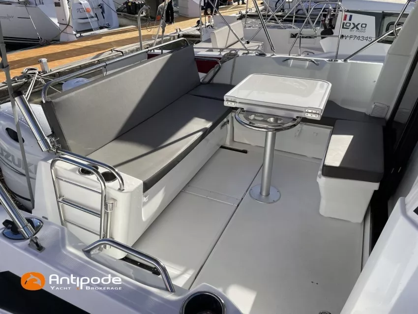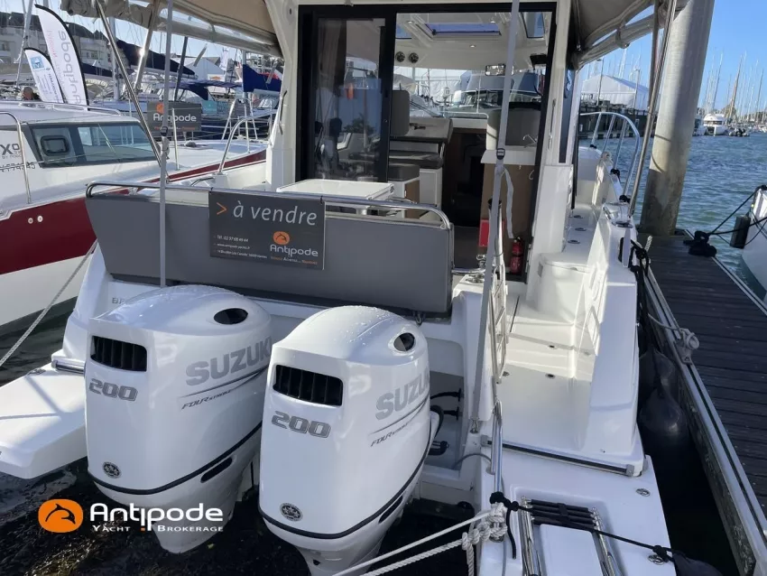 Antares 9 OB, 2022, 1ère main, Suzuki DF200 APX blanc (x2), 2 x 200 cv (192 h), Propulseur d'étrave, Version Elégance, Finition Confort, Planchers stratifiés chêne brun, Selleries Silvertex sterling & Diamante meteor, Vitre latérale babord coulissante, Rideaux intérieurs, Moustiquaire de panneau de pont ouvrant (coulissant), Table de cockpit d'origine + table custom, Carré de cockpit convertible en bain de soleil, Bimini top cockpit, Coussins de cockpit, Guindeau électrique avec télécommande filaire, Commande guindeau au poste de timonerie, Tauds de fermeture arrière complète du cockpit, GPS / lecteur de carte / sondeur Garmin 9 pouces, Sonde Garmin GT21-TH, Cartographie électronique, VHF ASN AIS - Garmin 215 i, Système audio Fusion MS-RA70N (4 enceintes), Trim automatique Zipwake, 2ème essuie-glace électrique et lave glace, Unité réfrigérante 12 V - 60 litres porte frontale, Chauffe-eau 220 V (25 litres), Eau chaude et froide sous pression, Gazinière 2 feux, Précablage four à micro-ondes, Prise de quai 220 V + chargeur de batteries - Cristec 25A et ligne de quai (25 m), Batteries service AGM 2 x 130A, Prises intérieures 220 V et USB, Contrôleur / gestionnaire de batteries - Victron BMV 702, Réservoir rigide eaux noires avec trappe d'accès pour actionner la gaffe, Jauges aditionnelles eaux noires et eau douce, Eclairages intérieurs à Leds, Radeau de survie 4 places à jour, Equipement de sécurité semi-hauturier 4 personnes, Mouillage principal ancre Fob 14kg + 35m de chaine et 40m de bout, Amarres et défenses, Visible Bretagne. Pour plus d'informations ou pour fixer un rendez-vous de visite, contact : Jean-Baptiste Lemaire 06 10 25 00 03 - jb@antipode-yachts.com