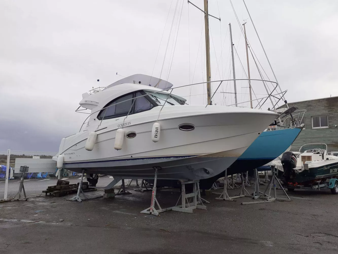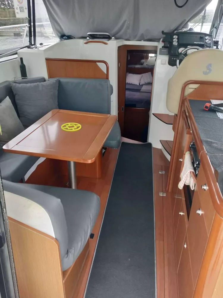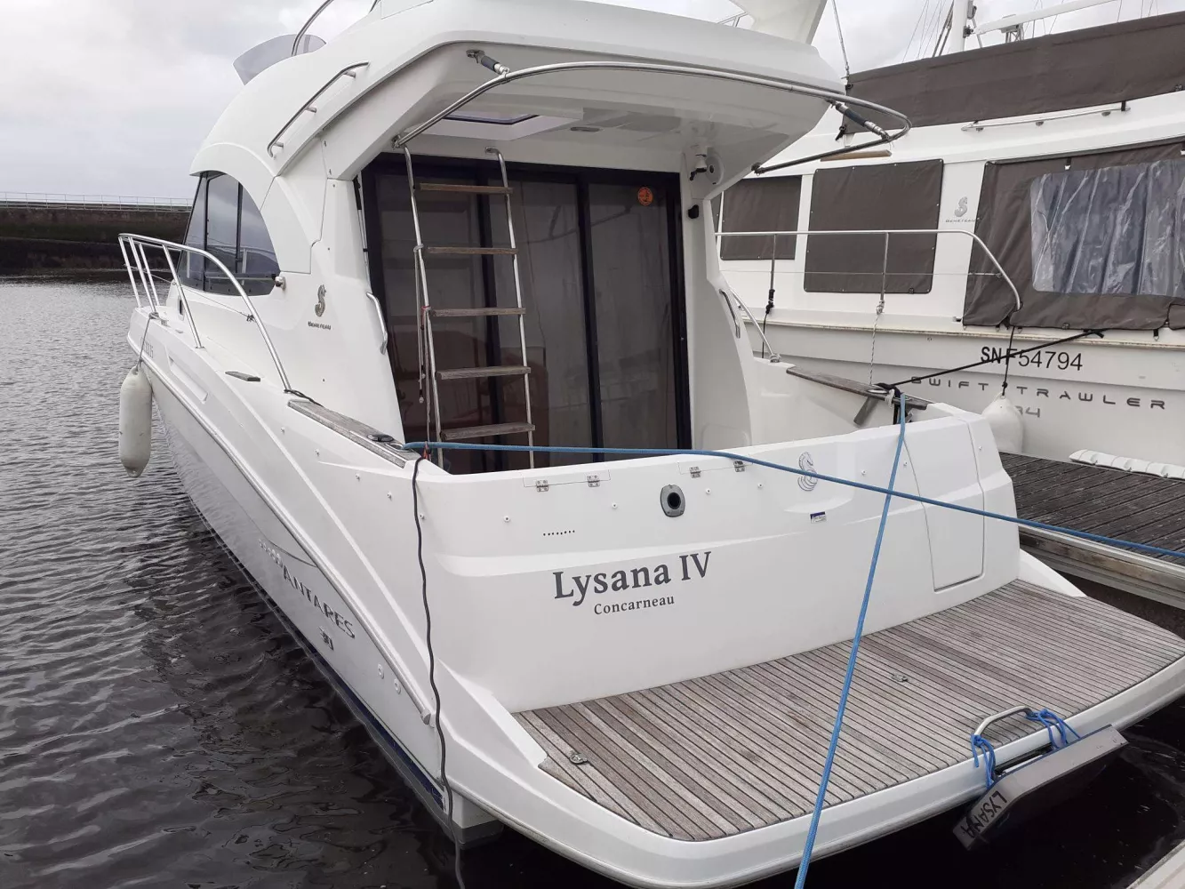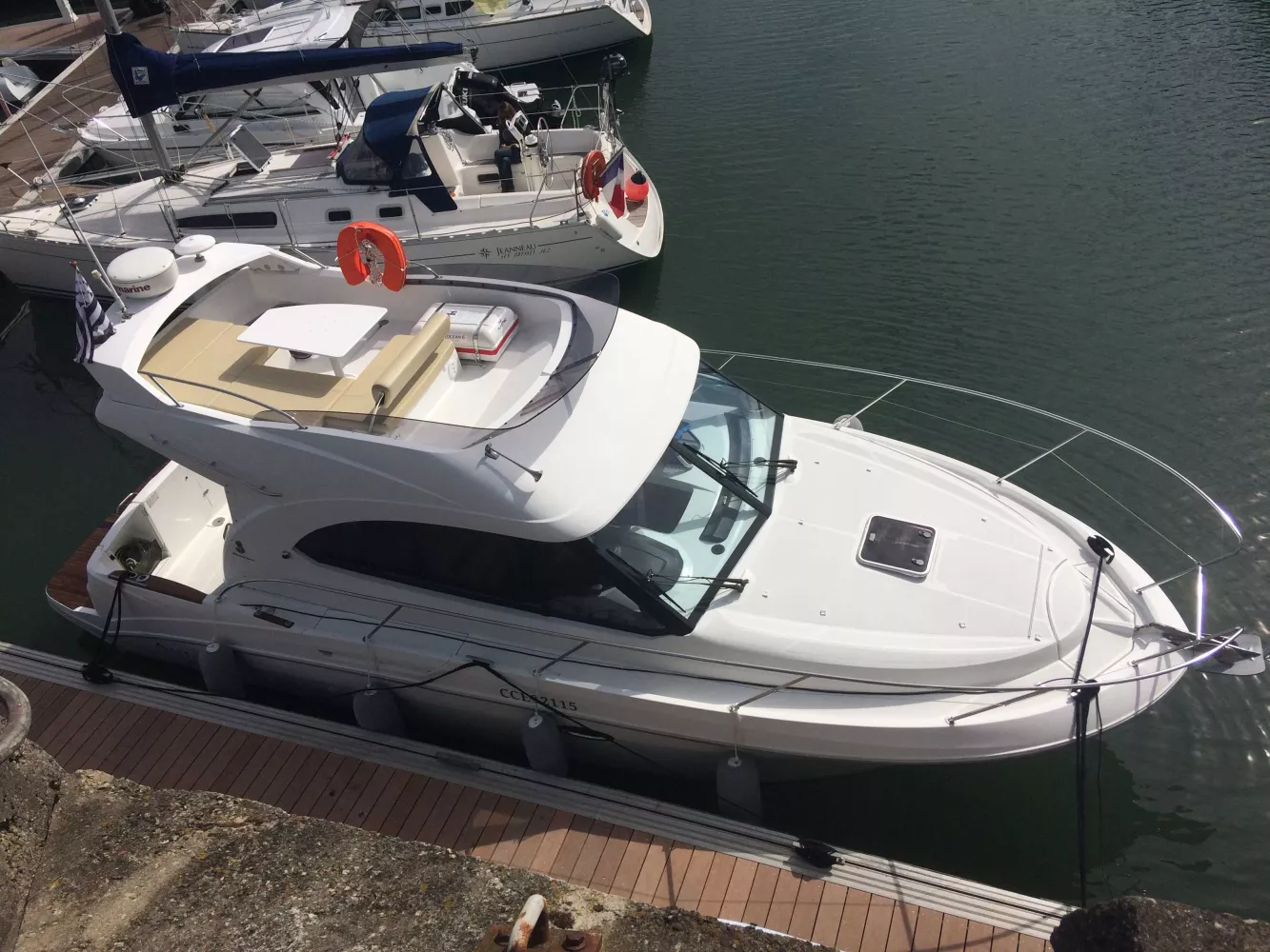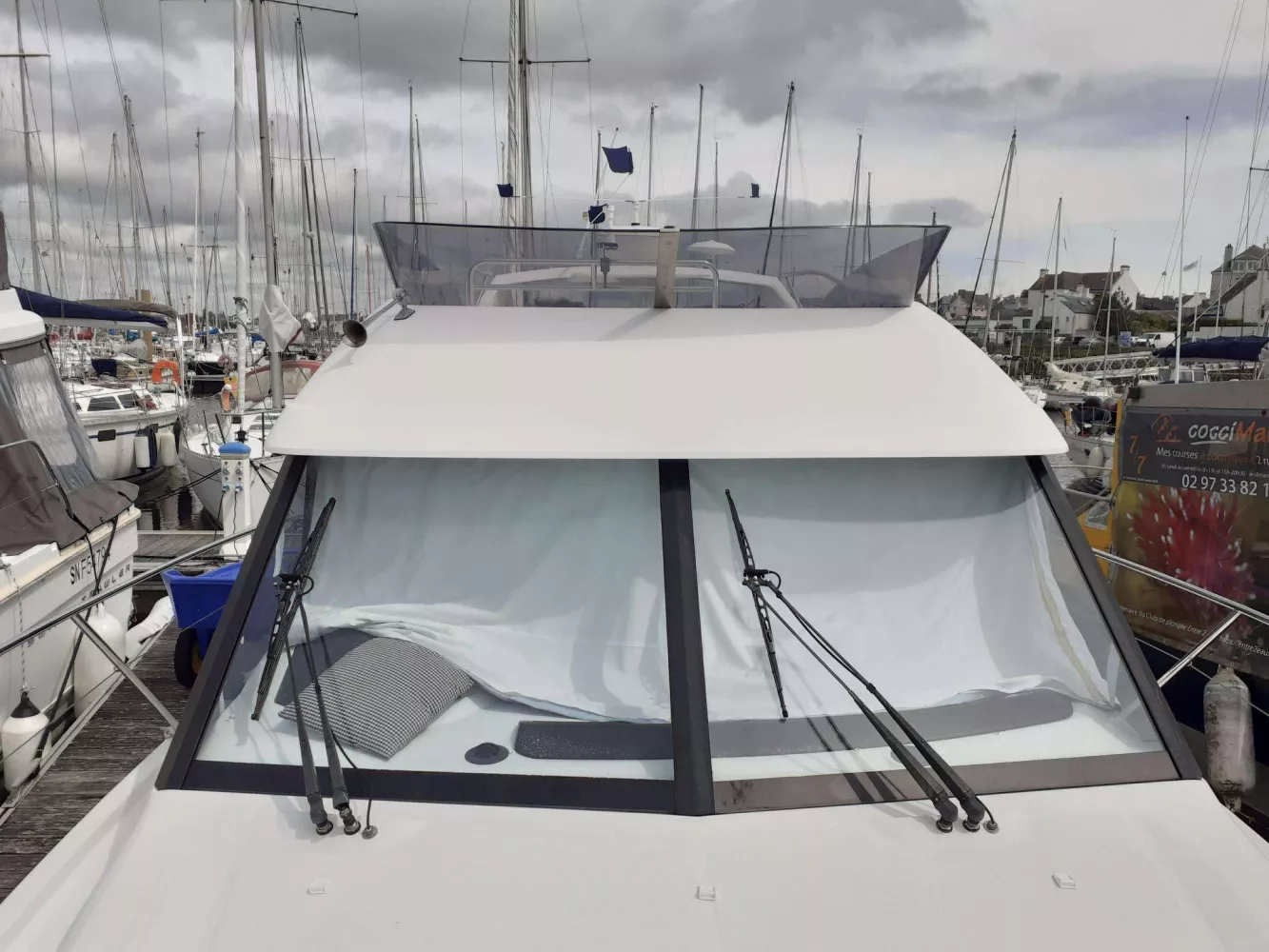 *Équipements : Guindeau électrique, Propulseur d'étrave, Protection d'hélice, Coupe orins, Flaps électriques rétractables, Plateforme arrière en teck, Portes cannes, Pompe de lavage eau de mer, Douchette de cockpit eau chaude / froide, Taud de soleil, Taud de fermeture arrière du cockpit, Toile de protection des vitres avant du poste de Pilotage, Échelle de bain, Table de cockpit amovible à l'arrière, 2 essuie-glaces (2022), Réchaud à gaz fixe 2 feux, Four, Réfrigérateur, Eau douce sous pression 145L, WC Marin + réservoir à eaux noires, Douche, Chauffe eau 25 L, Pompe de cale électrique, Éclairage leds, Prise de quai 220V + chargeur, 4 batteries (2 de servitudes, 1 moteur et 1 propulseur)(2018), Table de cockpit , TV dans le carré, Taud de flybridge, Vivier avec pompe à eau de mer.