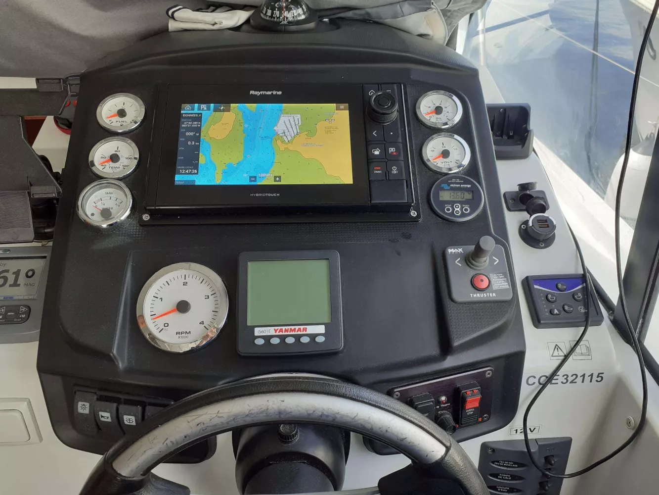 *Électronique : Combiné GPS traceur Raymarine Axiom 9 PRO (2019) avec carte Navionics 46 XG, GPS LOWRANCE HDS8 en extérieur, Radar Raymarine RD418D, VHF fixe Radio Ocean RO6700, Radio Boss Marine (2017) + hauts parleurs, Pilote automatique RAYMARINE ST70 sur Mèche avec télécommande, Sondeur, Speedo.