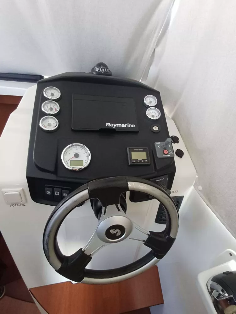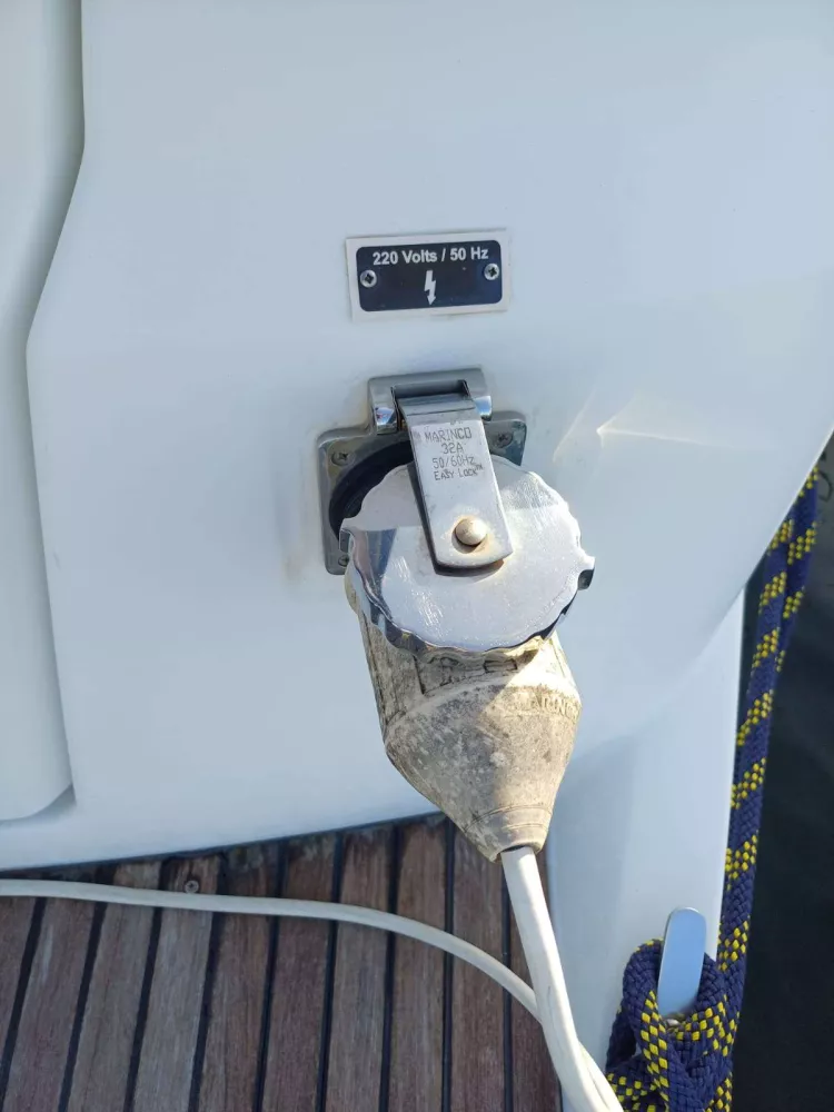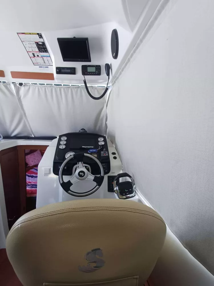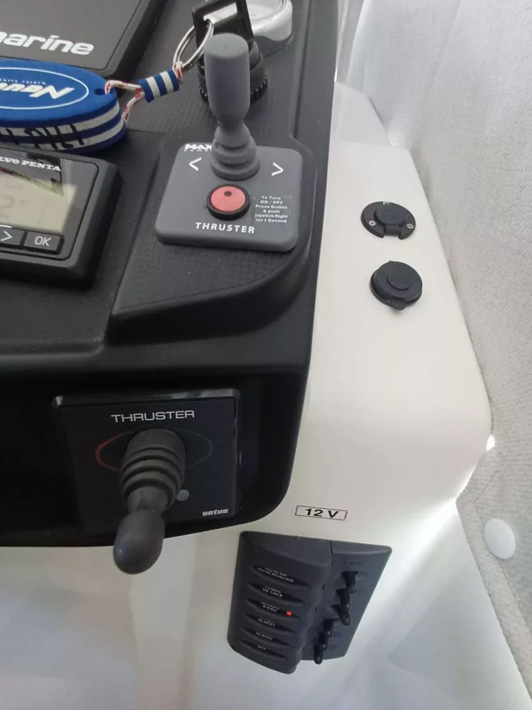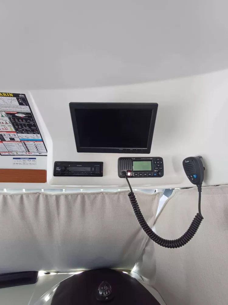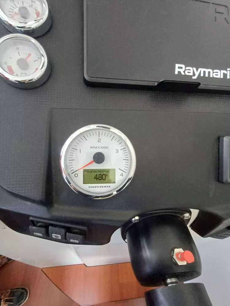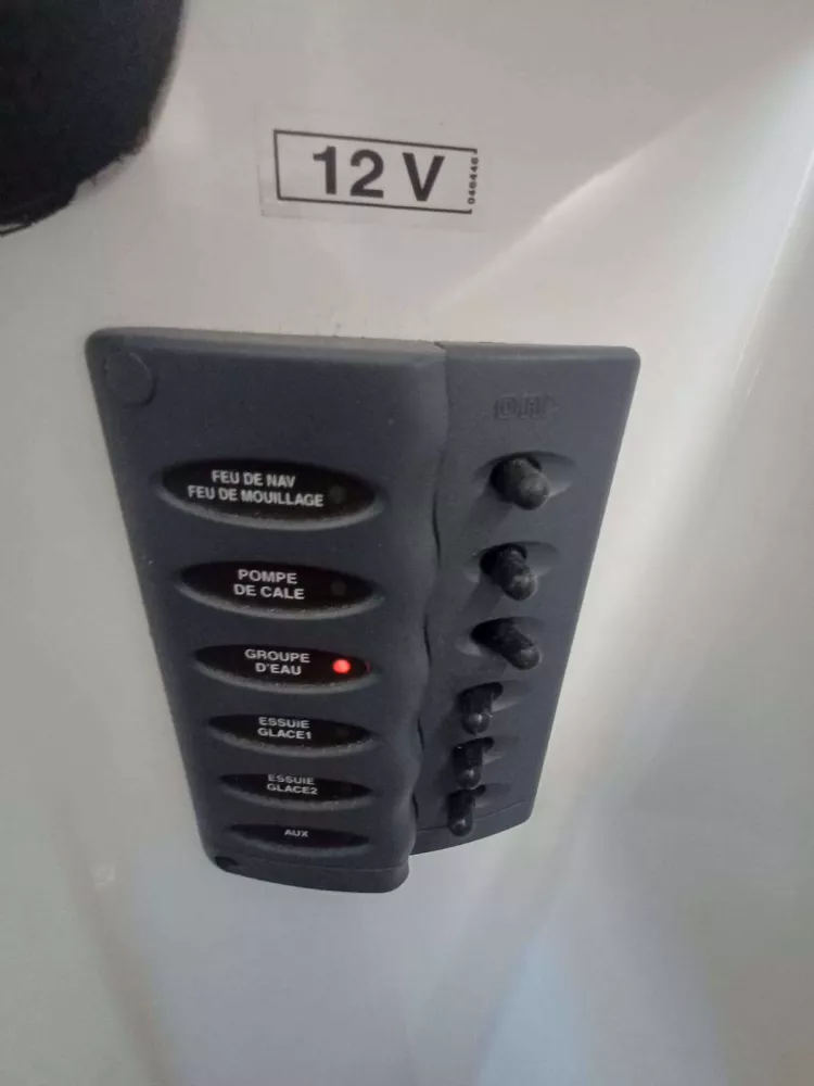 *Électronique : Circuit 12 V et circuit 220 V - 230 V - chargeur de quai- 1 batterie moteur et 1 batterie servitude - prise électrique arrière tribord - Commandes et démarrage moteur - commandes de propulseur - Antenne TV -GPS et sondeur de pêche Raymarine axiom - Traceur - VHF ASN - VHF Portative