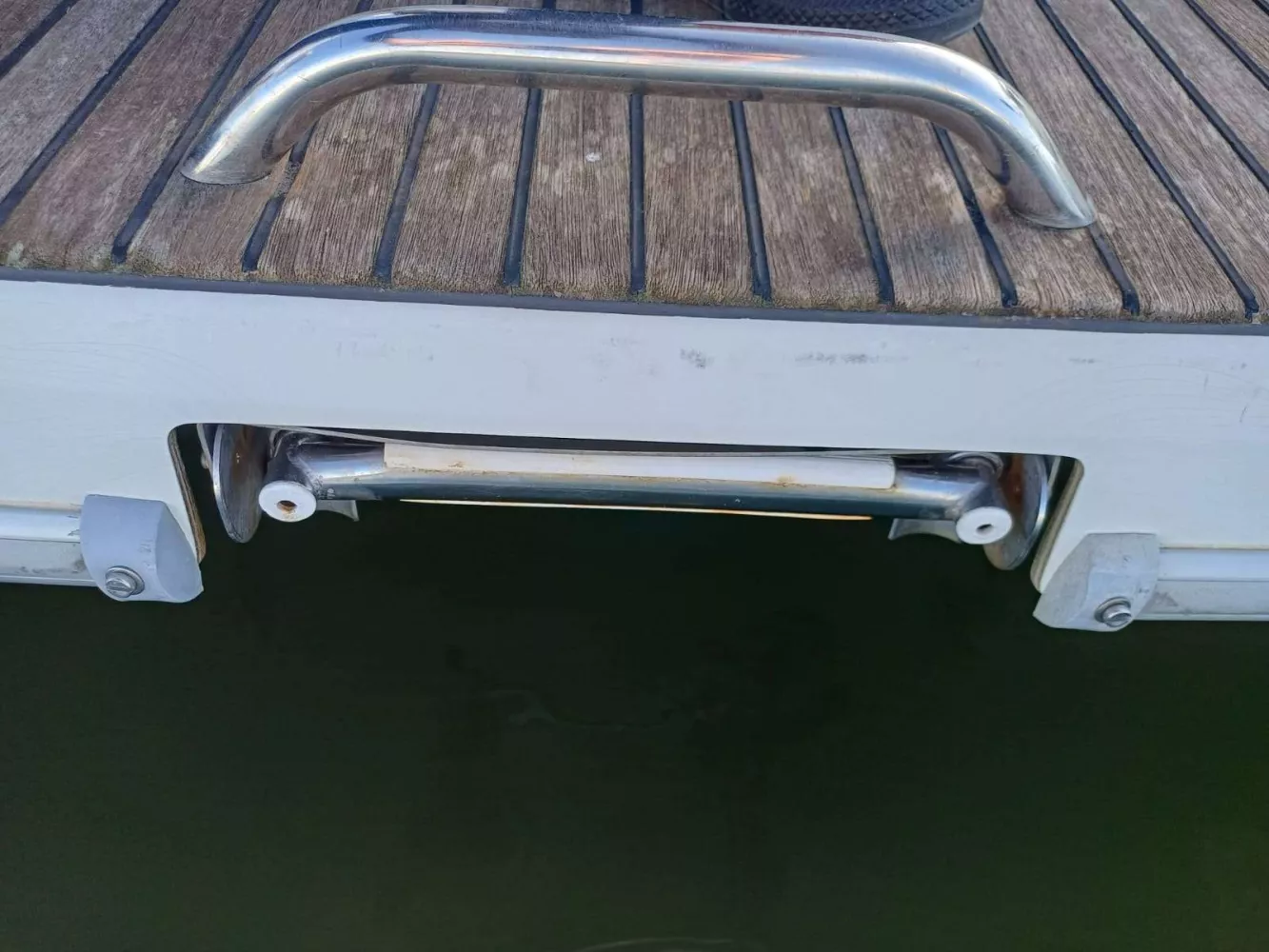* Extérieur : Fly bridge (poste de pilotage) - Cockpit - Sellerie complète extérieur - échelle de bain - plateforme arrière en teck - Guindeau électrique, Propulseur d'étrave avant et arrière, Plateforme arrière en teck, Pompe de lavage eau de mer, Douchette de cockpit eau chaude / froide, Taud de soleil, Taud de fermeture arrière du cockpit, Échelle de bain, Table de cockpit et Fly amovible à l'arrière, 2 essuie-glaces,Eau douce sous pression 145L, Pompe de cale électrique, Éclairage leds