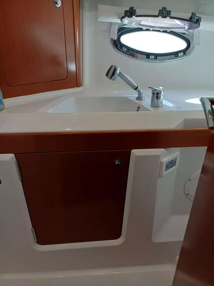 * Intérieur: Cabine double avec penderies- rangements- Une salle de bain avec WC électrique (lavabo- douche sur tribord)- Une cabine double sur bâbord- A tribord arrière une cuisine équipée (Réchaud à gaz fixe 2 feux, Four, Réfrigérateur)