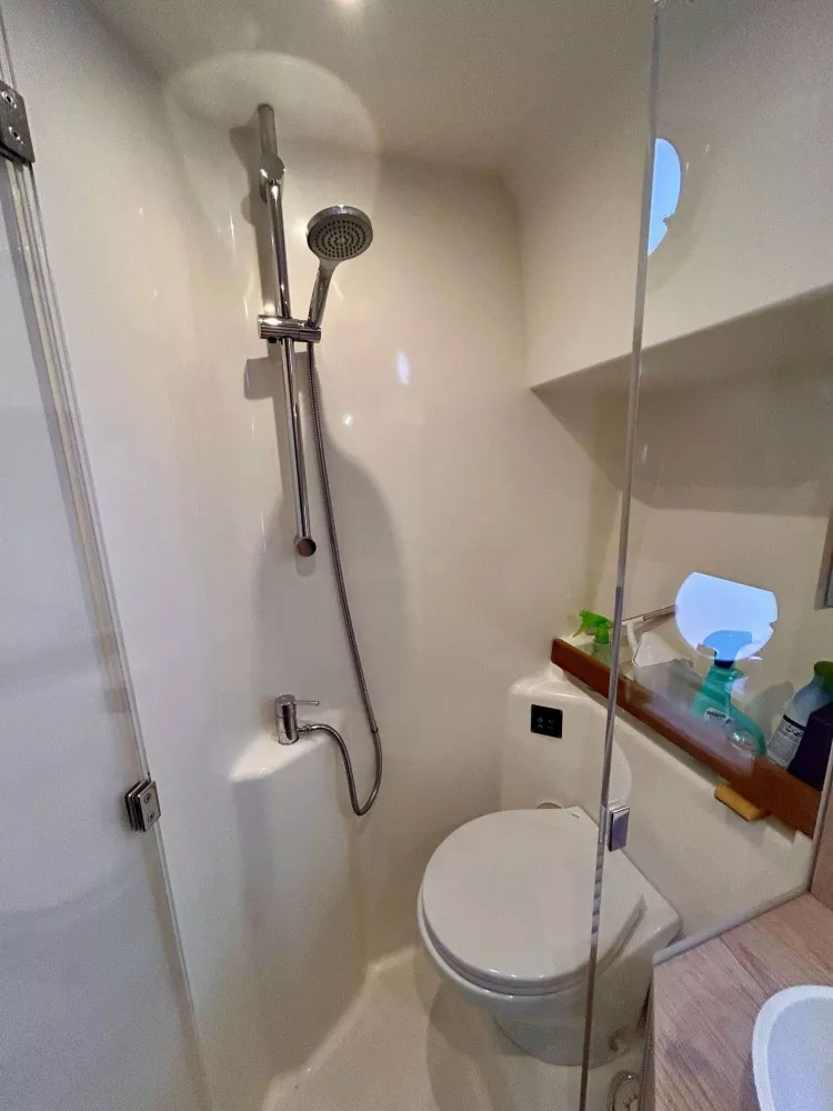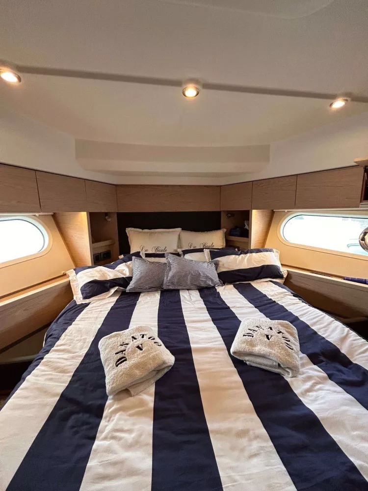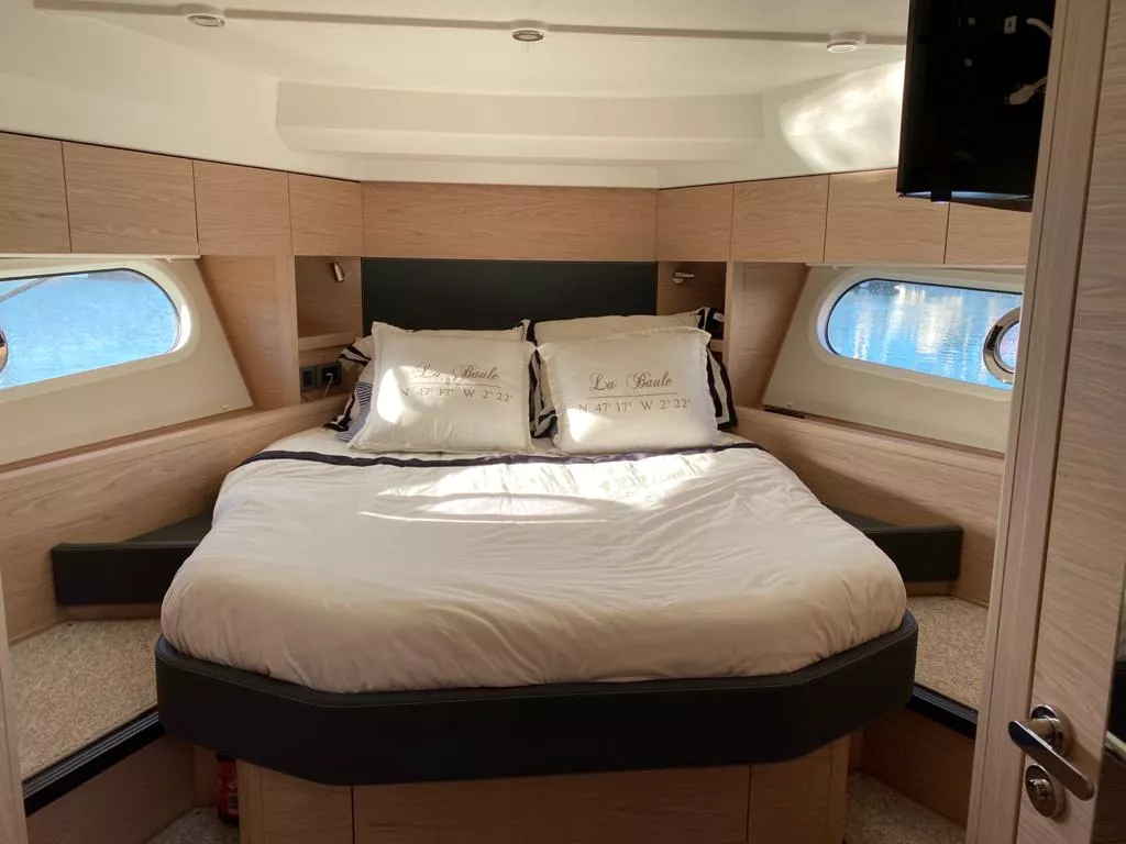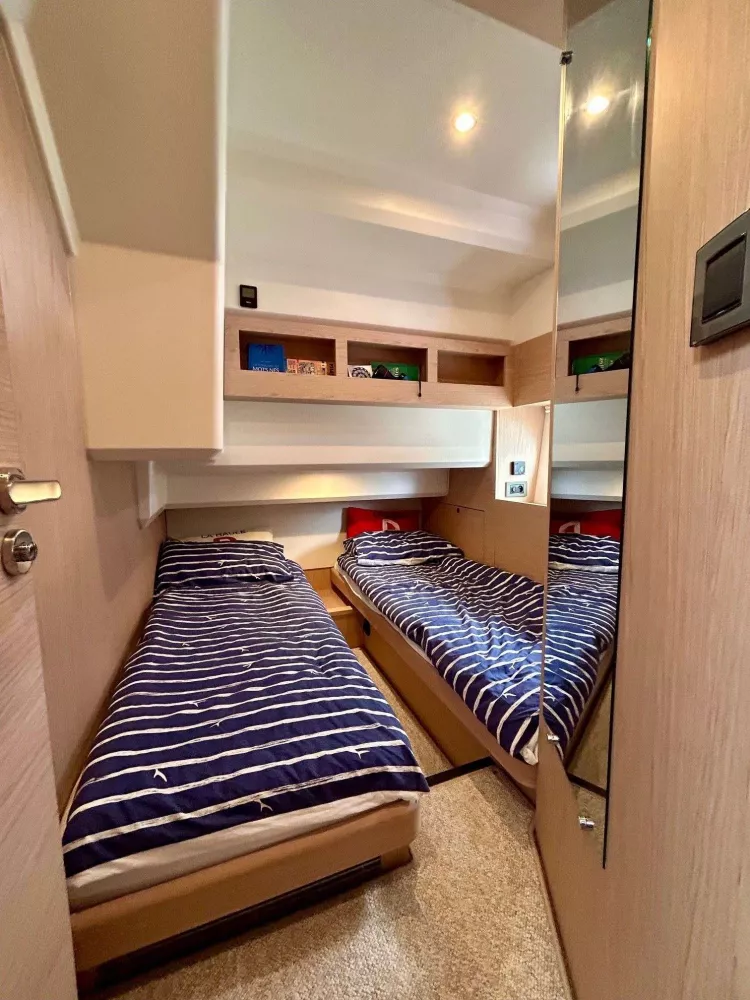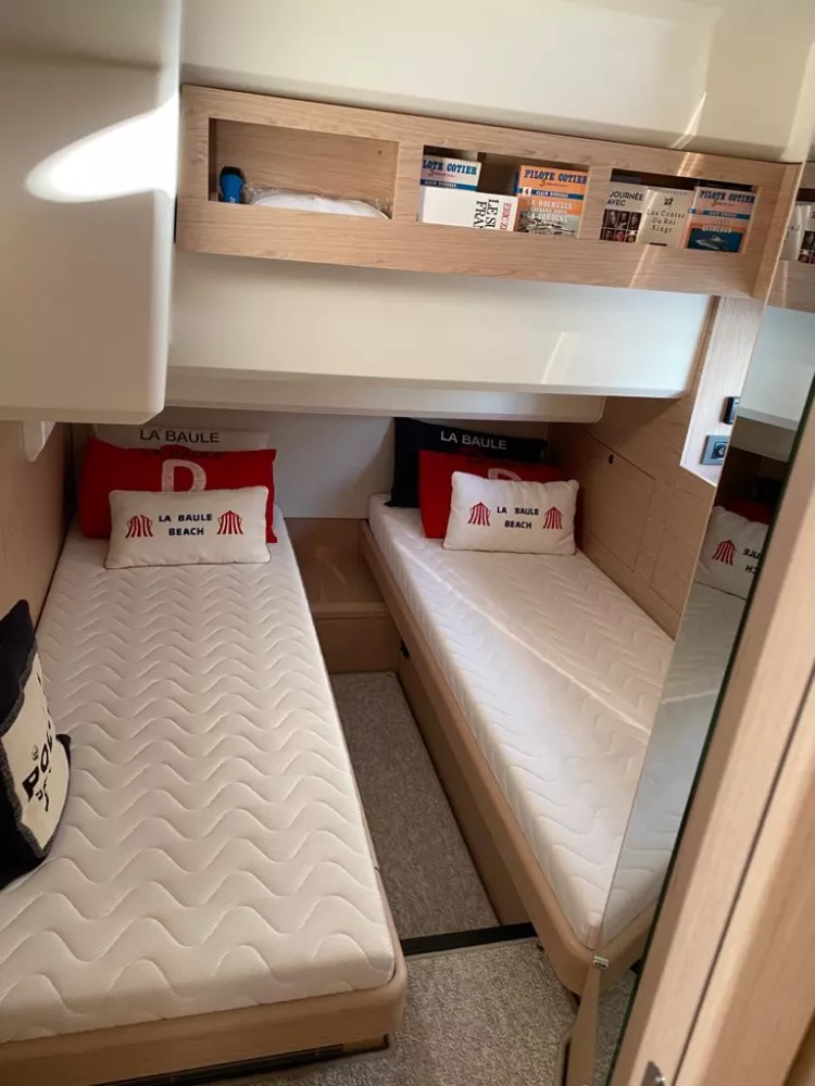 • 1 cabine propriétaire avant, 1 cabine VIP à babord avec 2 lits simples, 1 cabine double à tribord avec lit double