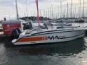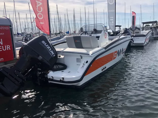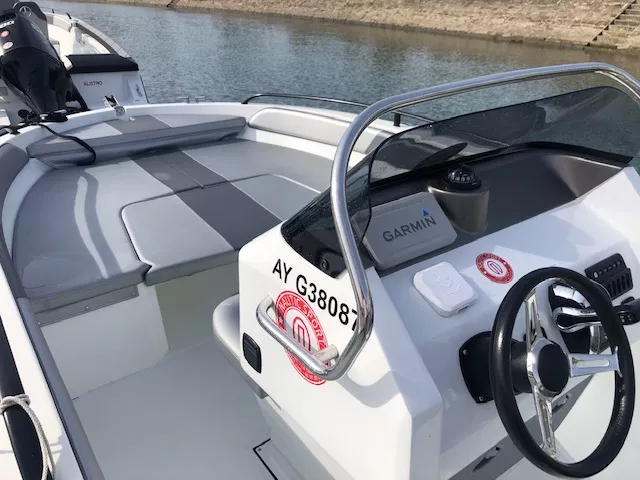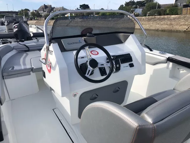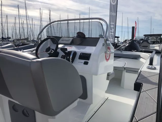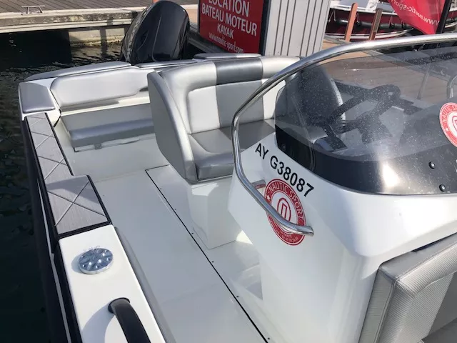 Options inclus : GPS-Sondeur Garmin, direction hydraulique, pack Touring : coffre en U – bain de soleil proue, table et extension bain de soleil, siège super confort, tissu luxury, volant Touring, coussins protection proue, coussins spoiler poupe)