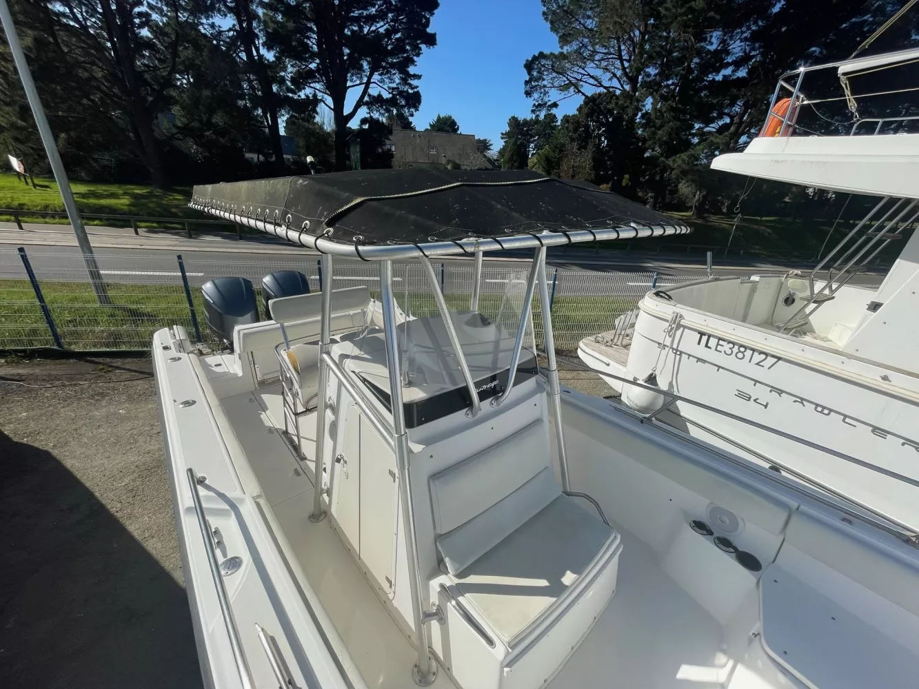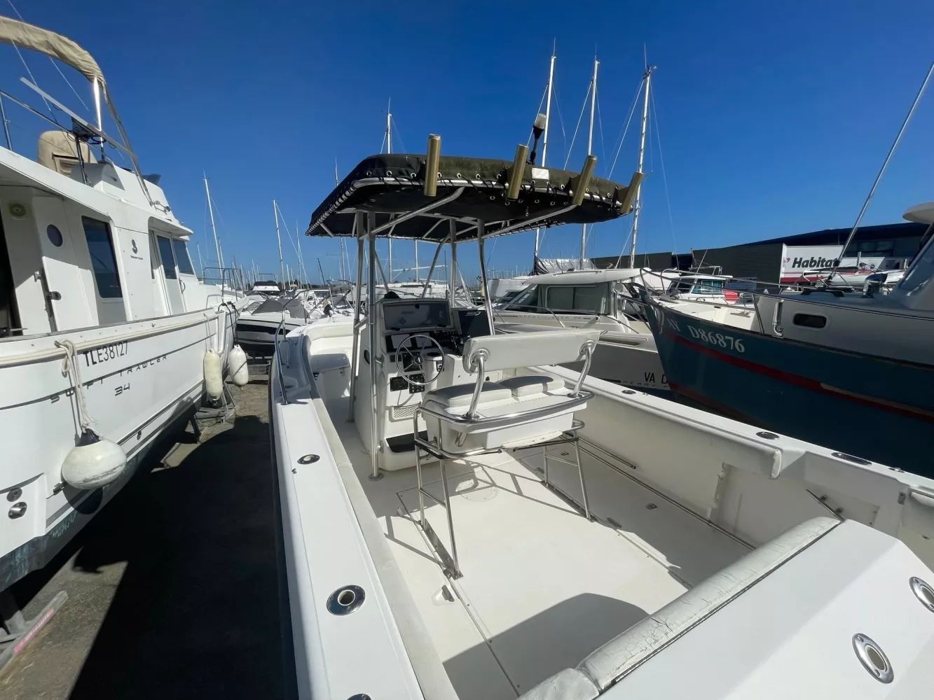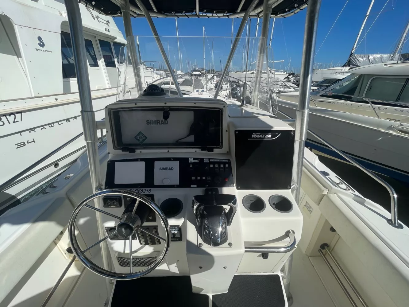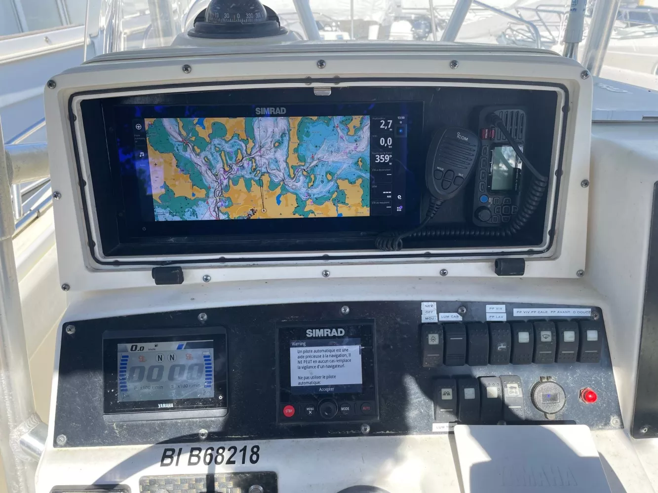 Moteurs récents / T-Top / Banquette arrière repliable / WC marin manuel / Coussins de cockpit / Table / Échelle de bain / Eau douce / Porte-cannes / Vivier / Guindeau électrique avec commande au poste de pilotage / Pack audio avec haut-parleurs / Pompe de cale électrique / Centrale de navigation / Ecran Simrad 15 pouces / GPS / Sondeur / Radar / Répétiteur / Pilote automatique.
