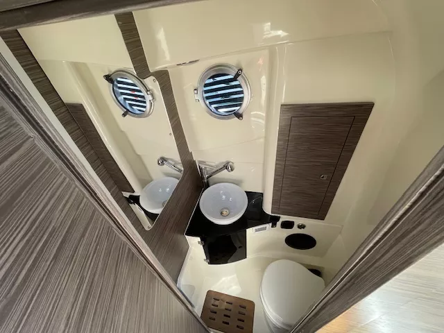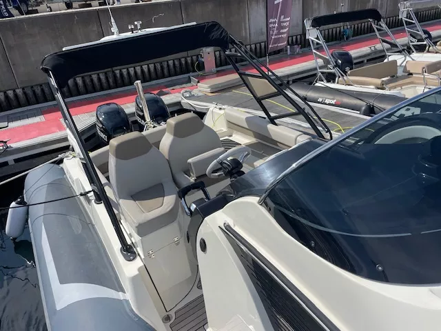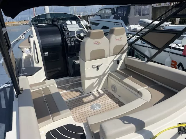 OPTIONS INCLUS : Cabine double couchette avec sellerie – Salle d’eau avec douche et WC électrique – Pack Garmin GPS / Sondeur 1223 SV – Système son – VHF intégré – Guindeau Electrique – Propulseur d’étrave – mât de ski – Roll Bar Elegance – Taud de soleil – Douchette – Bain de soleil avant / arrière avec banquette en U – Planchette arrière extra longues – Table – Réfrigérateurs – Feux de navigation – Echelle de bain – Armement sécurité