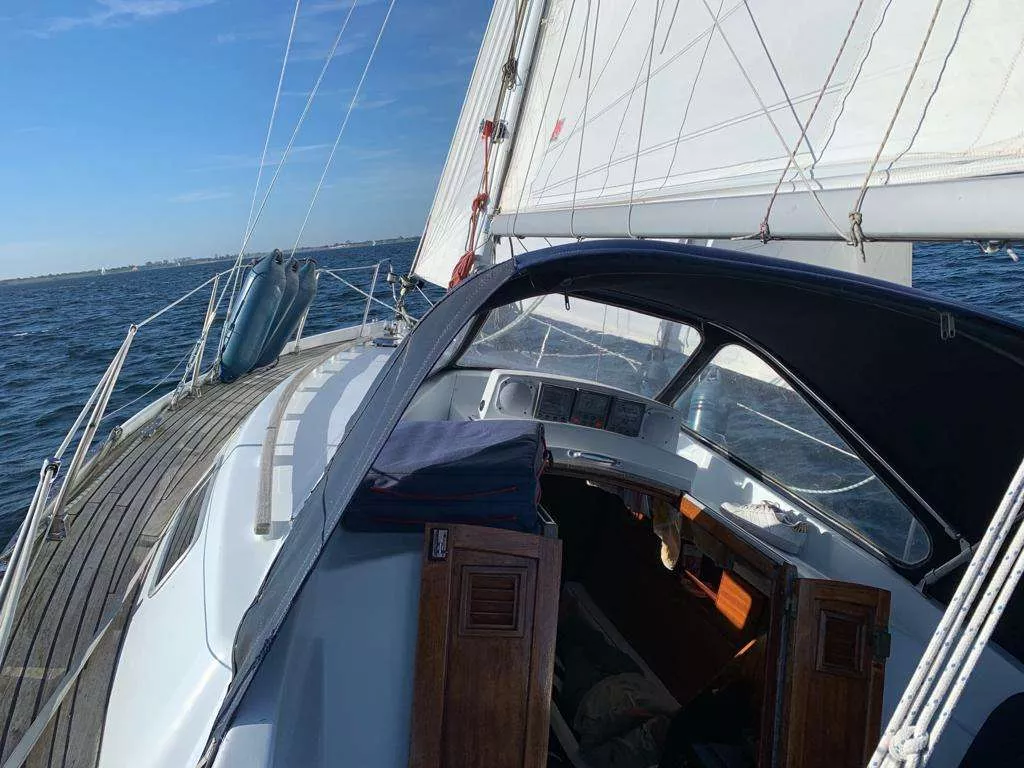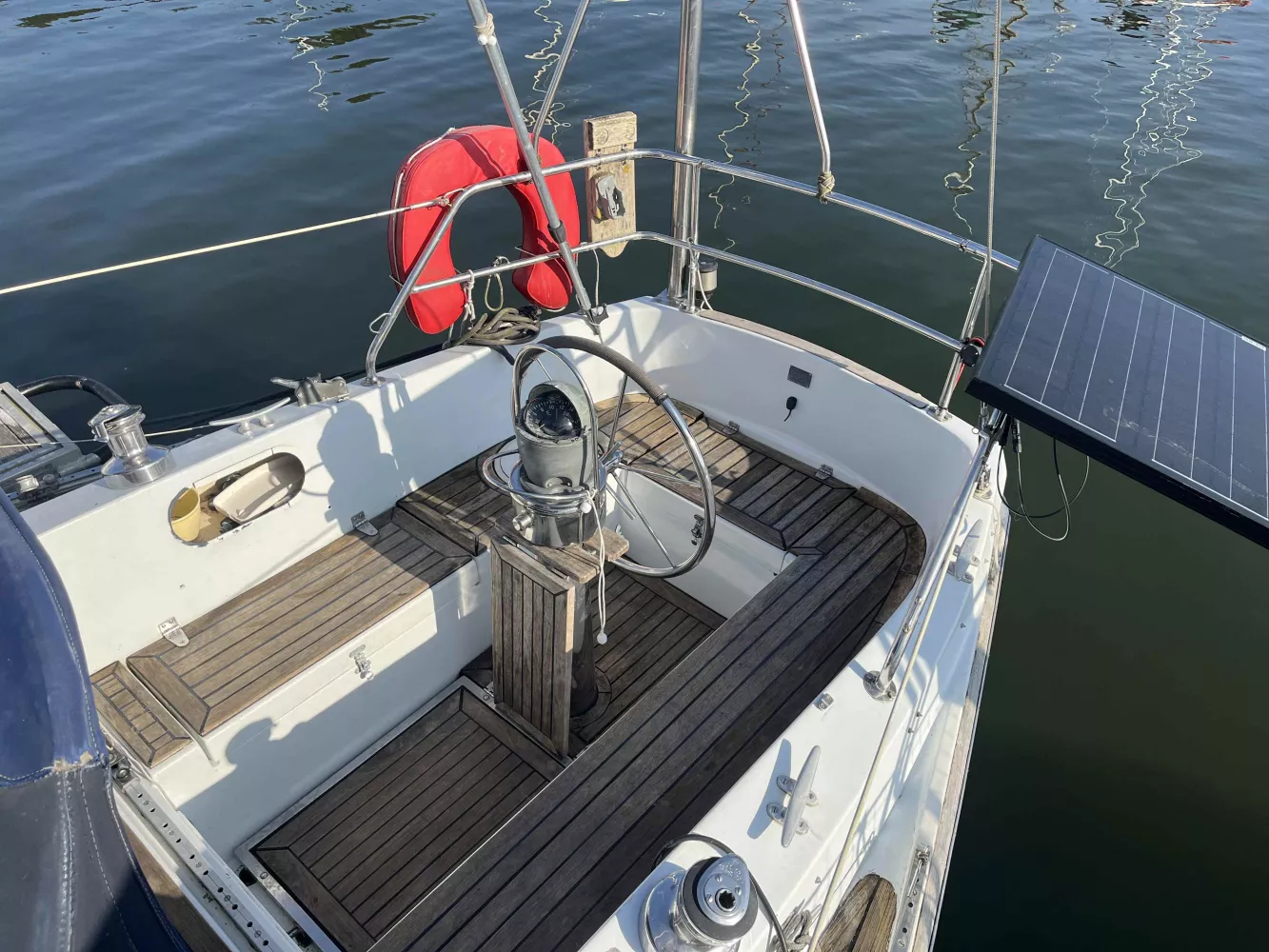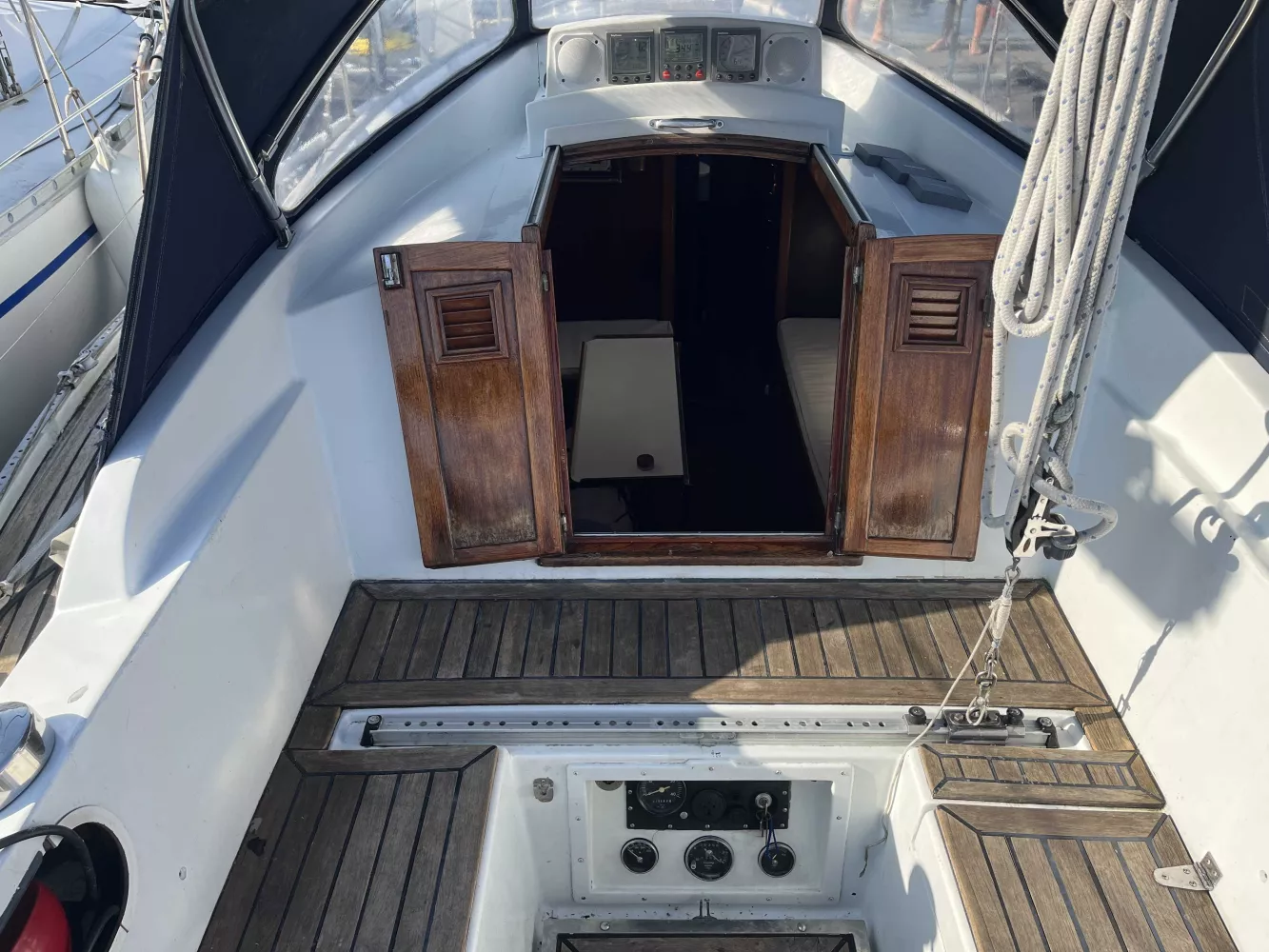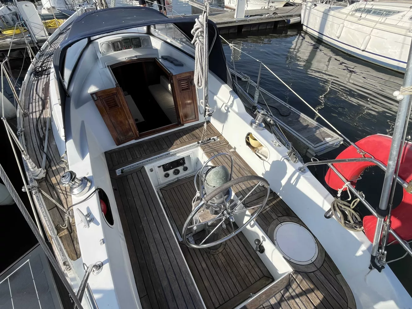 *Extérieur : Pont en teck, Barre à roue, Table de cockpit, Coffre de cockpit tribord, Capote de roof, Taud de soleil + toiles complètes pour fermeture de cockpit, Guindeau électrique, Échelle de bain, Emplacement pour bouteille de gaz, Lignes de vie.