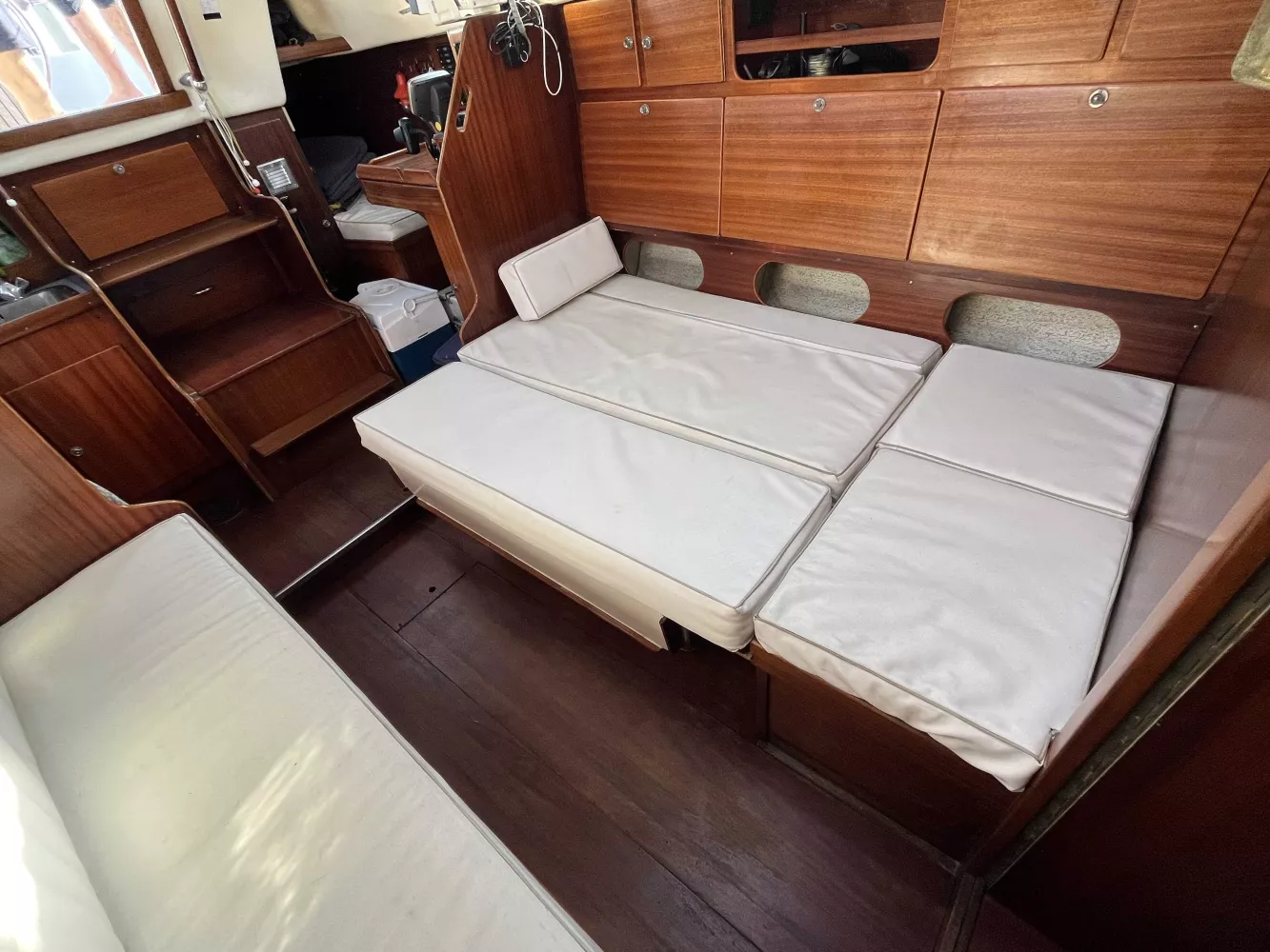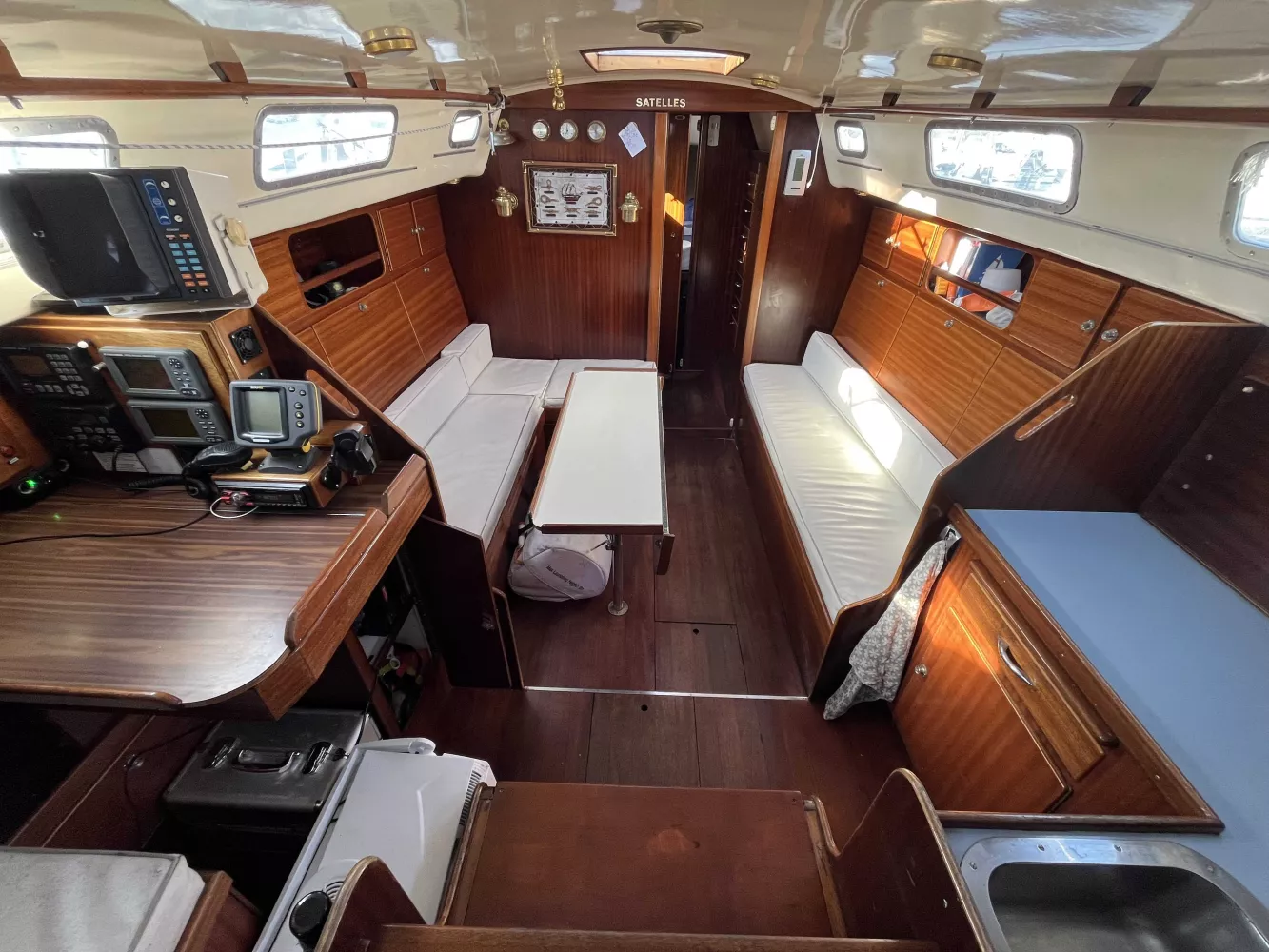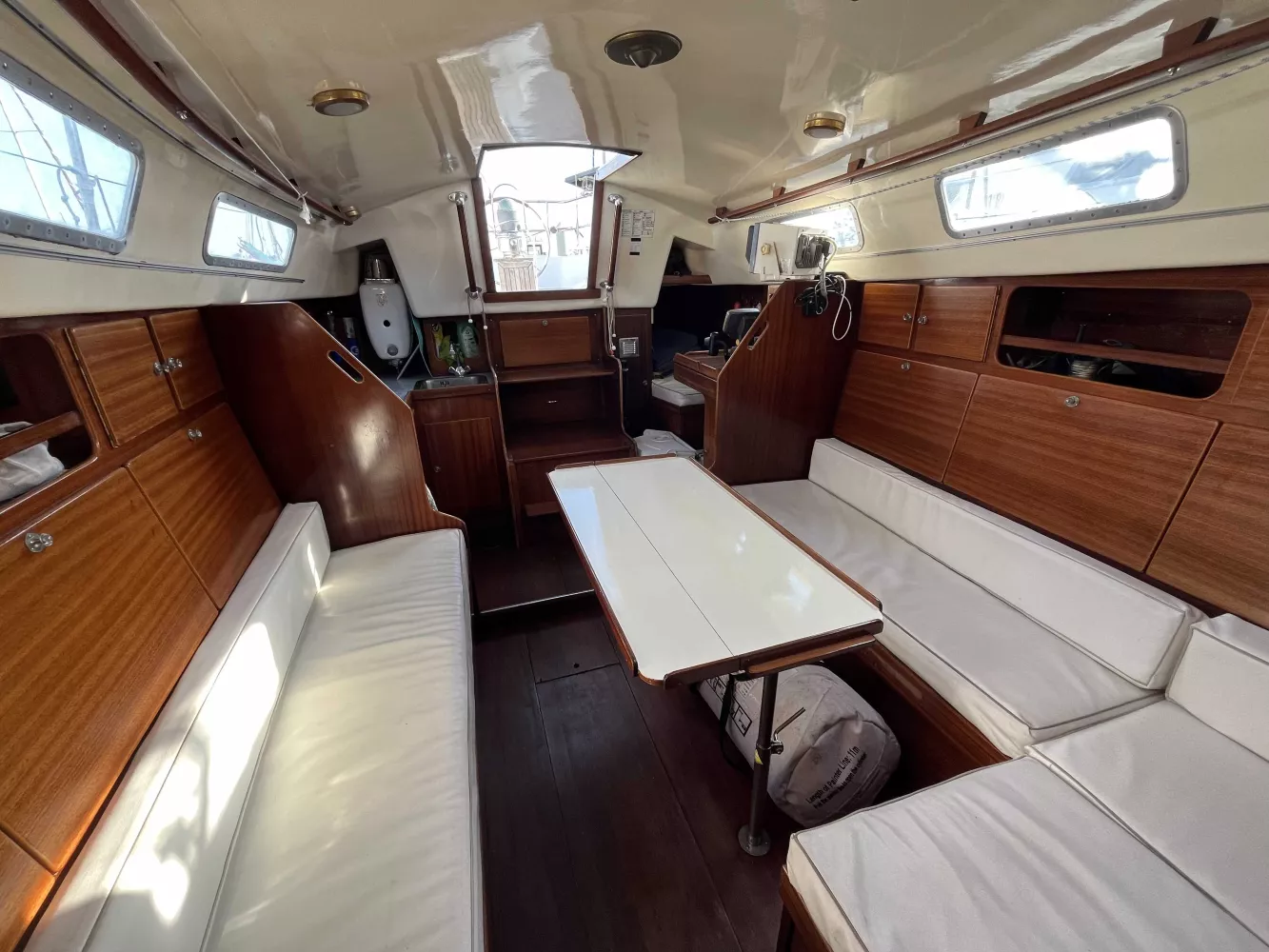 *Intérieur : 1 cabine avant avec couchage double, Coin salle d'eau avec WC marin + douche, Grand carré en vis-à-vis avec table transformable en couchage double, Coin navigateur avec table à cartes et couchette cercueil, Coin cuisine avec évier avec eau froide/chaude sous pression + réchaud gaz 2 feux + glacière, Chauffage Webasto, Nombreux rangements, Rideaux intérieurs, Hublot ouvrant de cabine, Selleries et boiseries en très bon état.