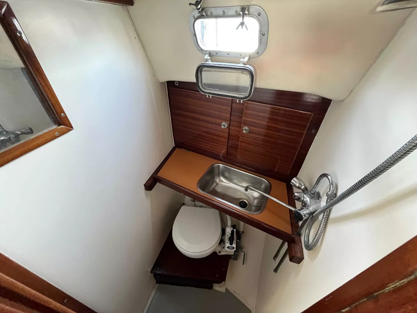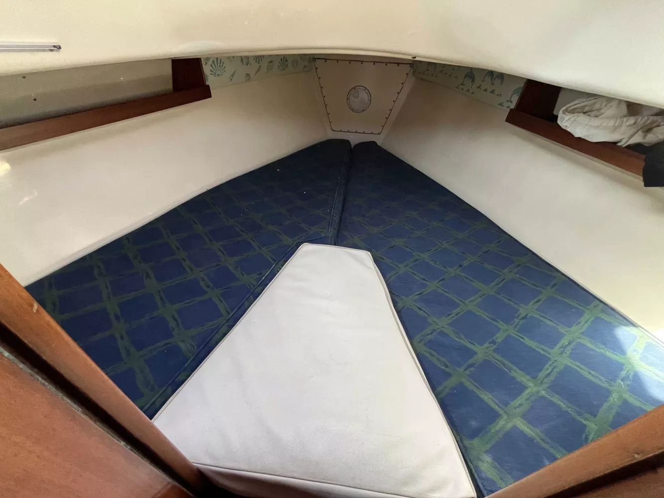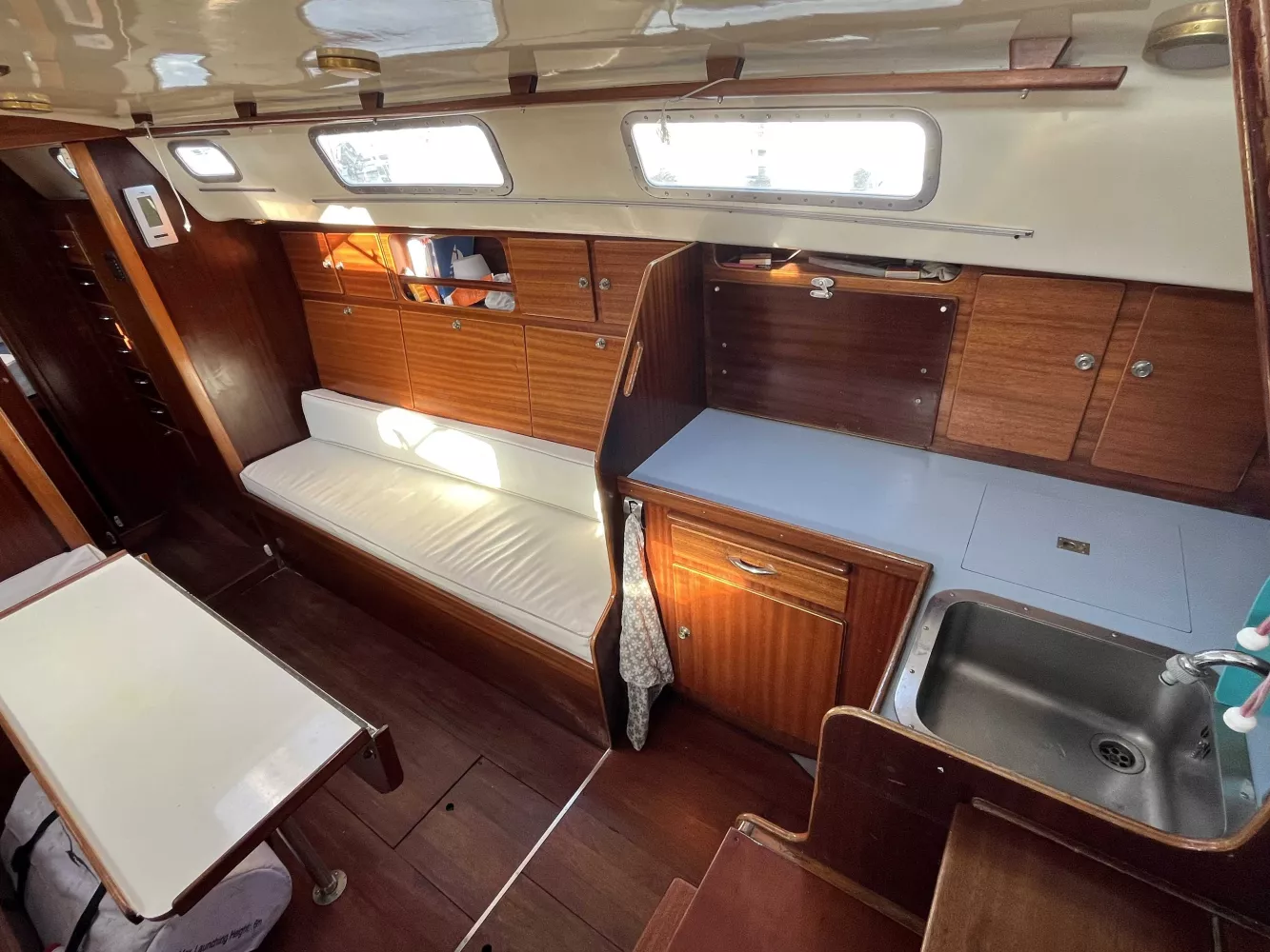 *Intérieur : 1 cabine avant avec couchage double, Coin salle d'eau avec WC marin + douche, Grand carré en vis-à-vis avec table transformable en couchage double, Coin navigateur avec table à cartes et couchette cercueil, Coin cuisine avec évier avec eau froide/chaude sous pression + réchaud gaz 2 feux + glacière, Chauffage Webasto, Nombreux rangements, Rideaux intérieurs, Hublot ouvrant de cabine, Selleries et boiseries en très bon état.
