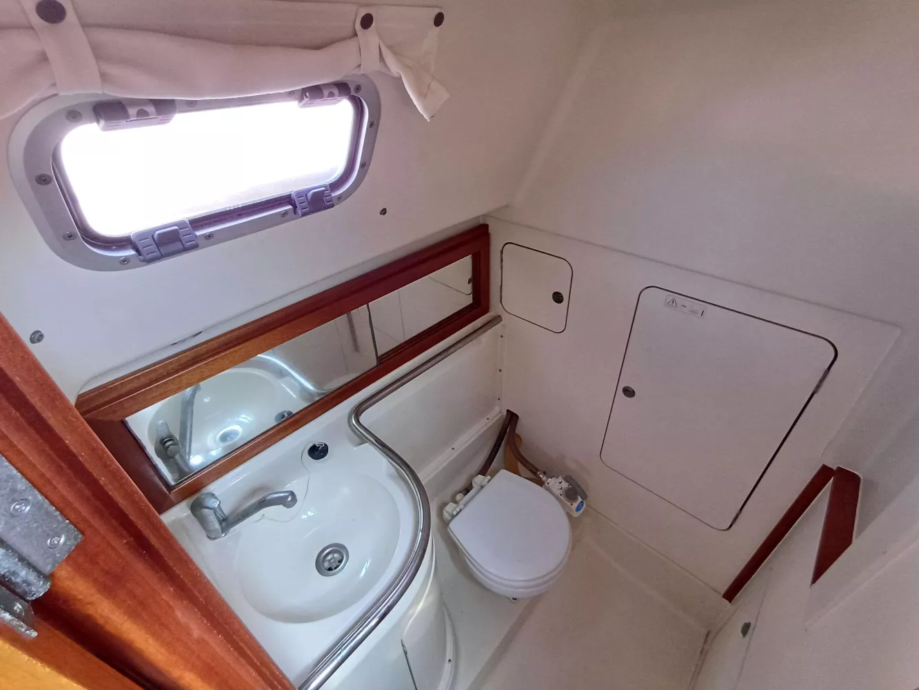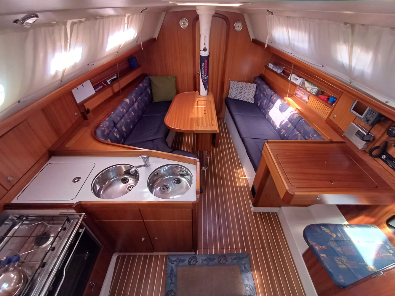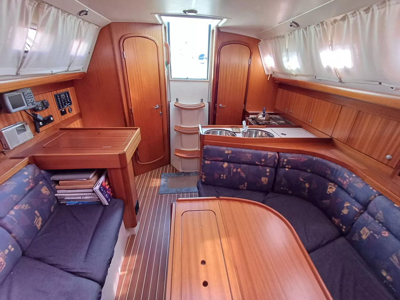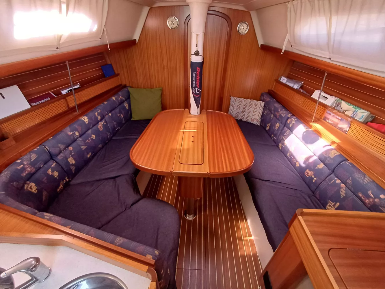 *Intérieur : 2 cabines + 1 salle d'eau avec WC marin, Coin cuisine en L (double évier avec eau douce froide/chaude sous pression, four, réchaud gaz 2 feux, réfrigérateur, rangements), Plancher stratifié, Coin navigateur avec table à carte dans le sens de la marche + électronique, Grand carré avec table, Compartiment salle d'eau avec douche et WC marin, Ballon d'eau chaude, Prise de quai + chargeur, 2 batteries de service + 1 batterie moteur (2021).